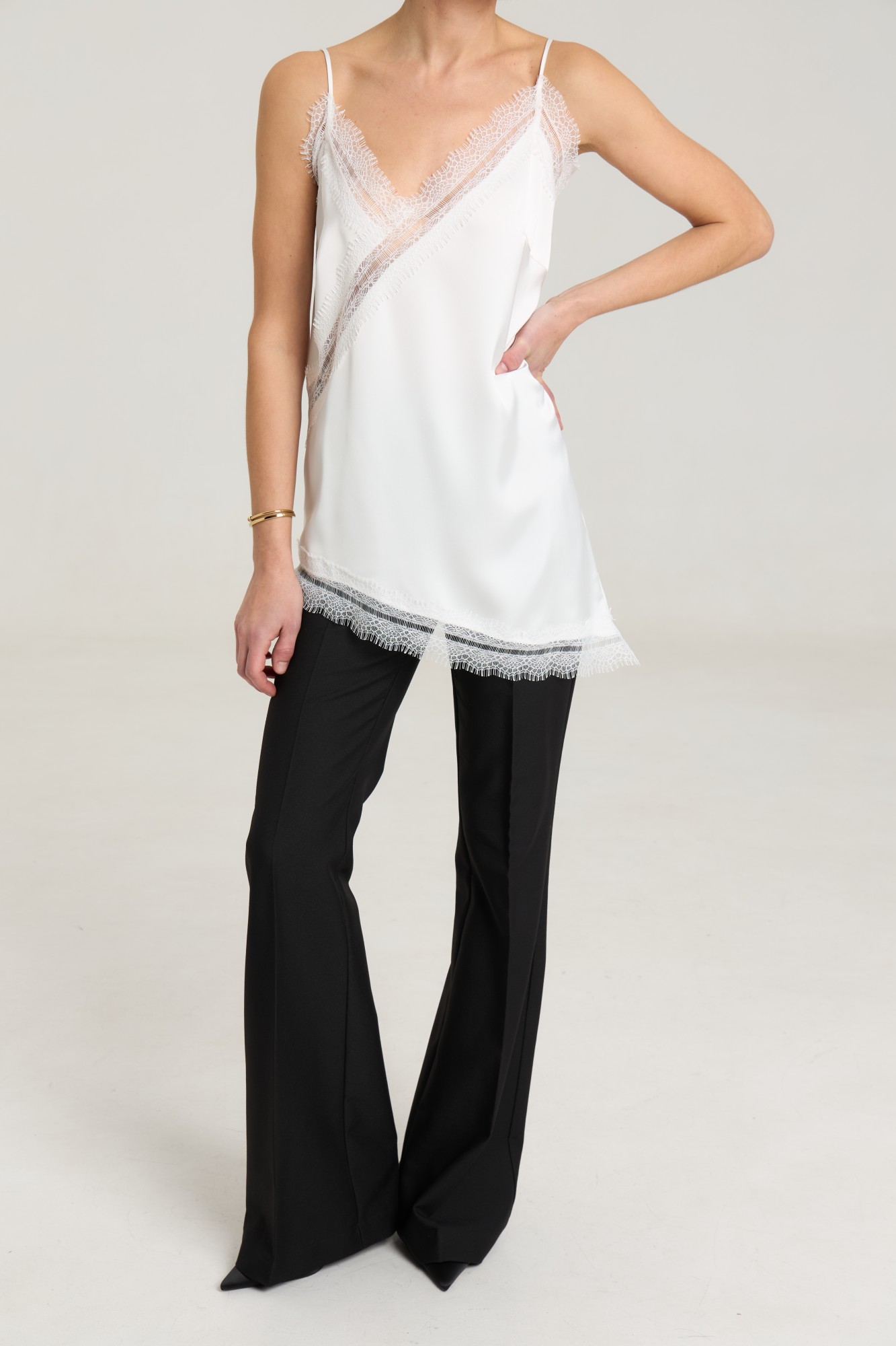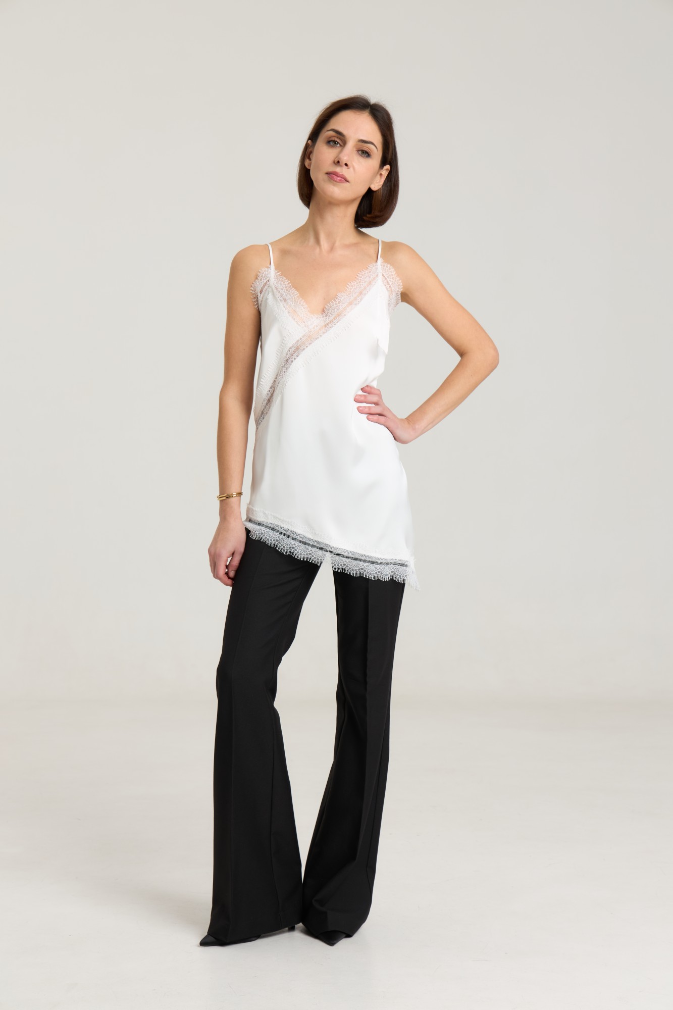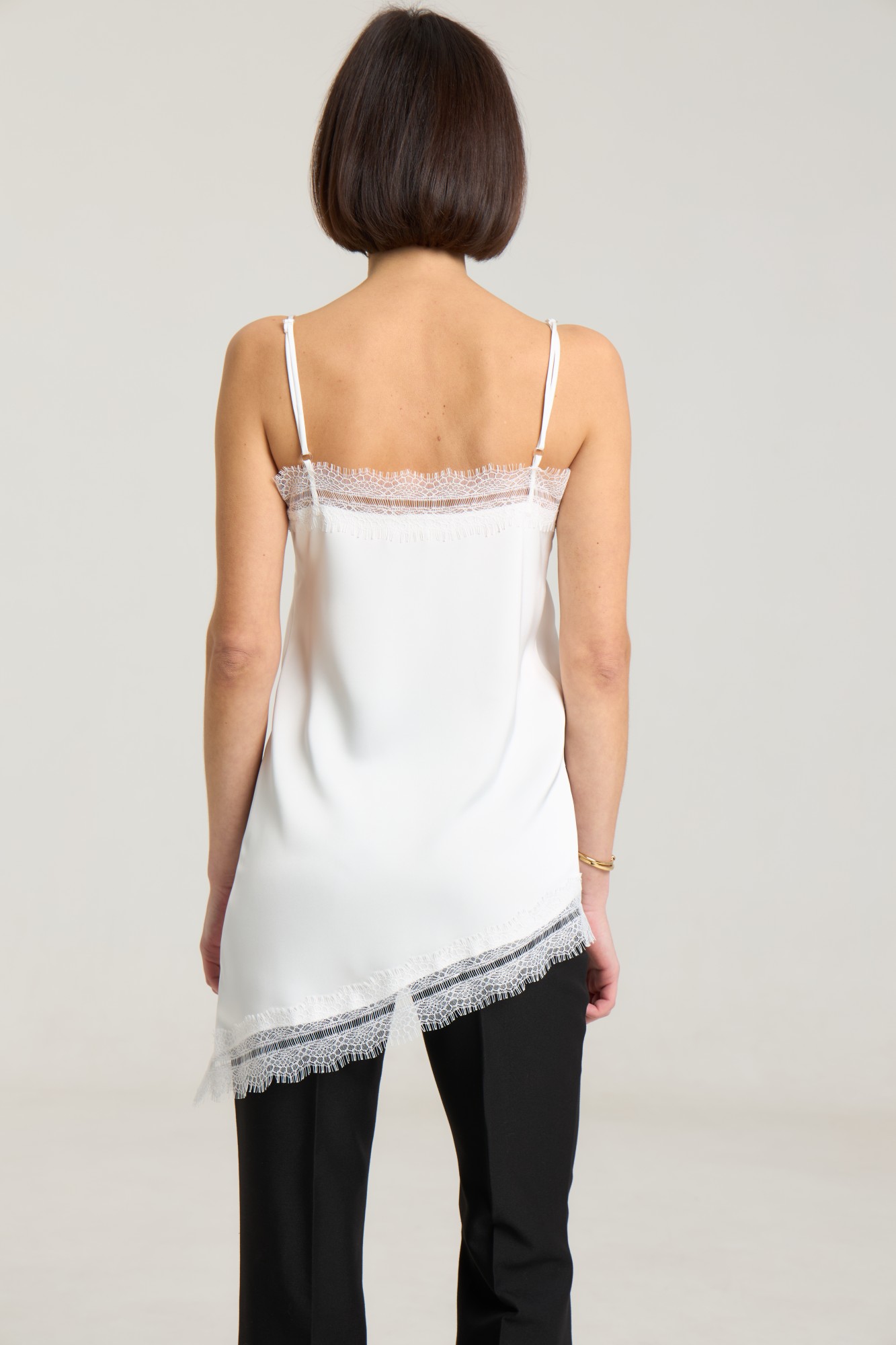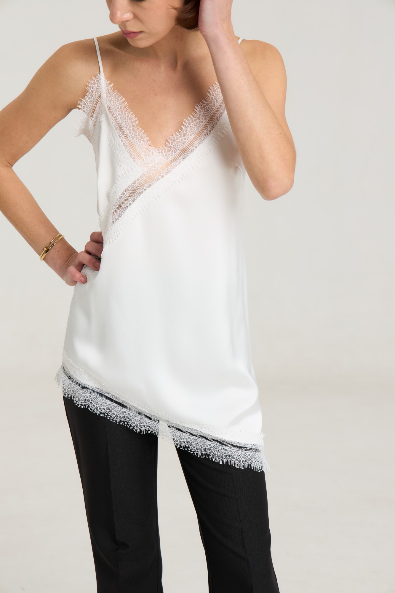 Ассиметричный топ с кружевом, топ на регулируемых бретелях, ширина кружева 7 см, длина топа 54 см. Топ станет дополнением к любому образу, будь то повседневный или нарядный. Можно сочетать с атласными черными брюками или юбкой из нашей коллекции. Атлас плотный, на груди выточки.