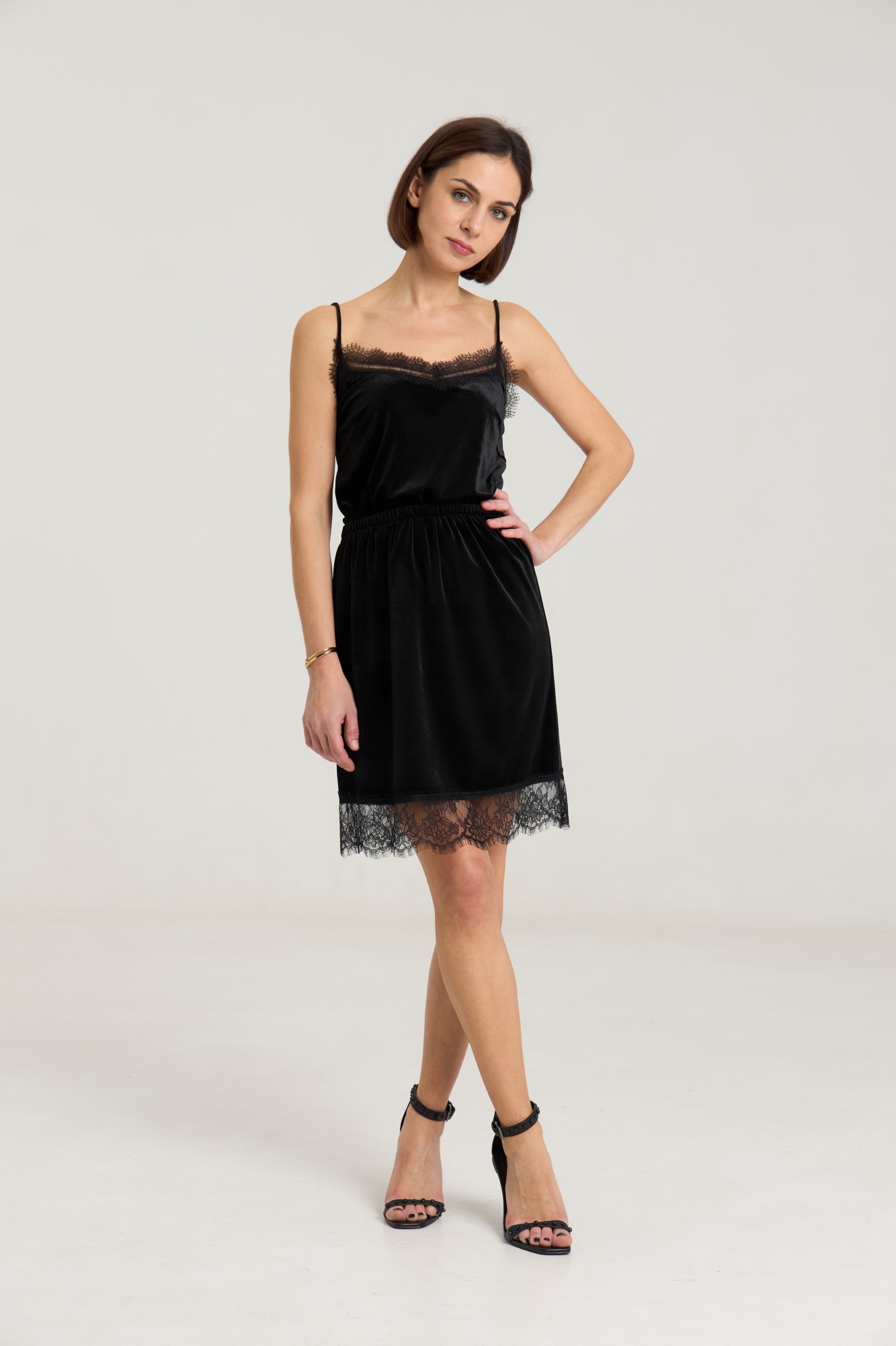 Топ выполнен из мягкой велюровой ткани, на регулируемых бретелях. Полуприлегающего силуэта, по переду и спинке отстрочено кружевом.