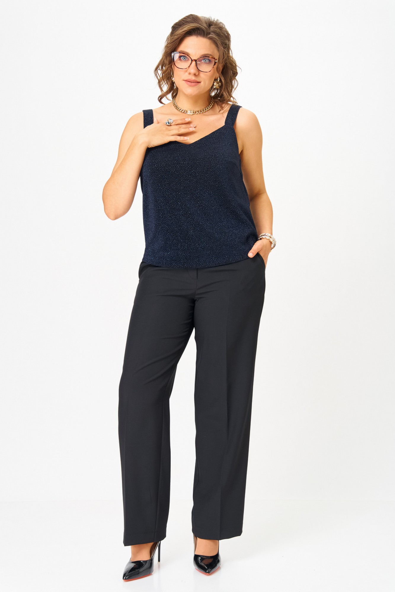 Топ прямого силуэта на широких бретелях, выполнен из трикотажного полотна с люрексом. Перед с нагрудными вытачками. Горловина переда лёгкой V-образной формы. Спинка цельнокроеная.