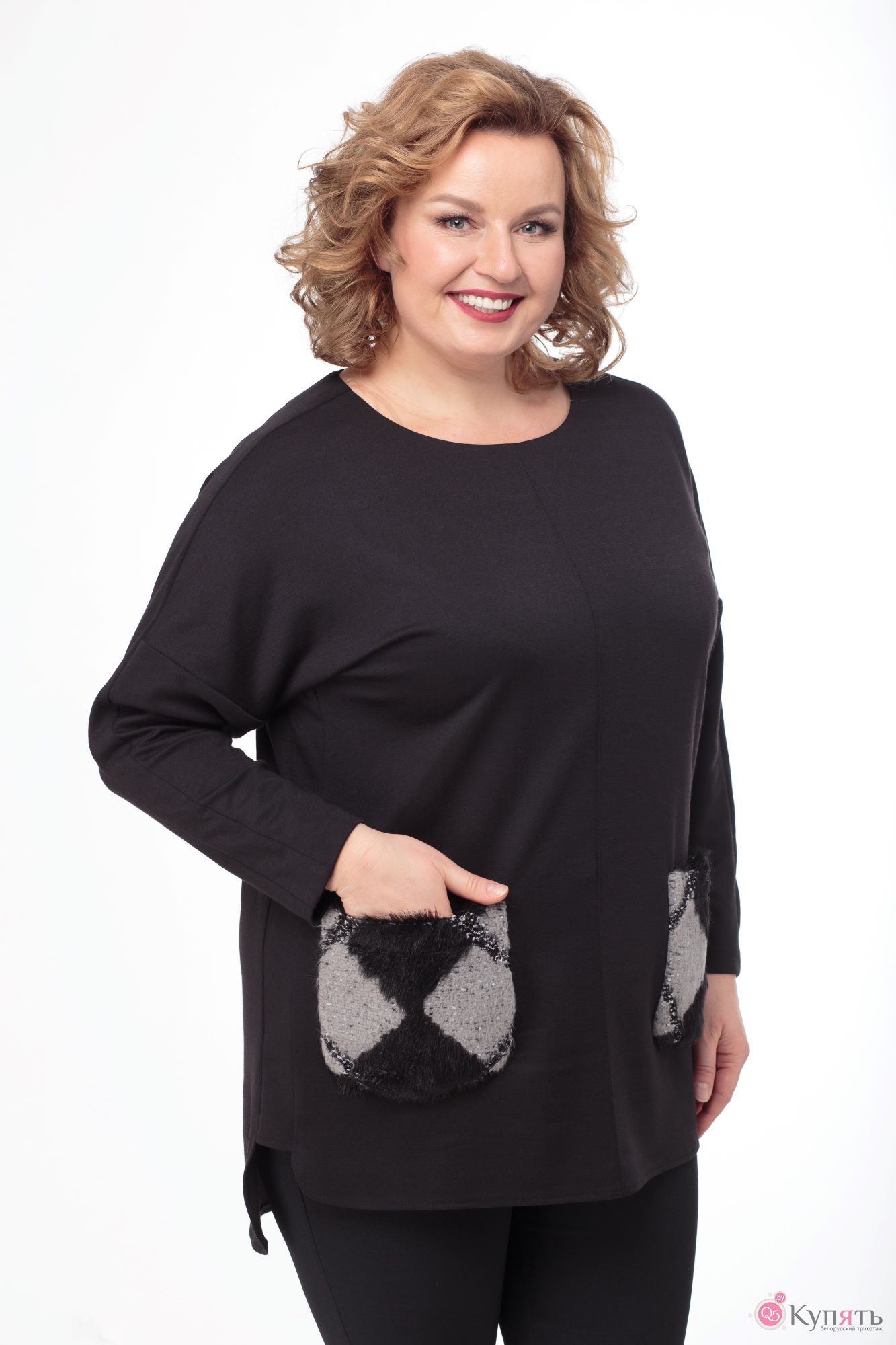 Туника-блузон женская с меховыми карманчиками черных тонов.