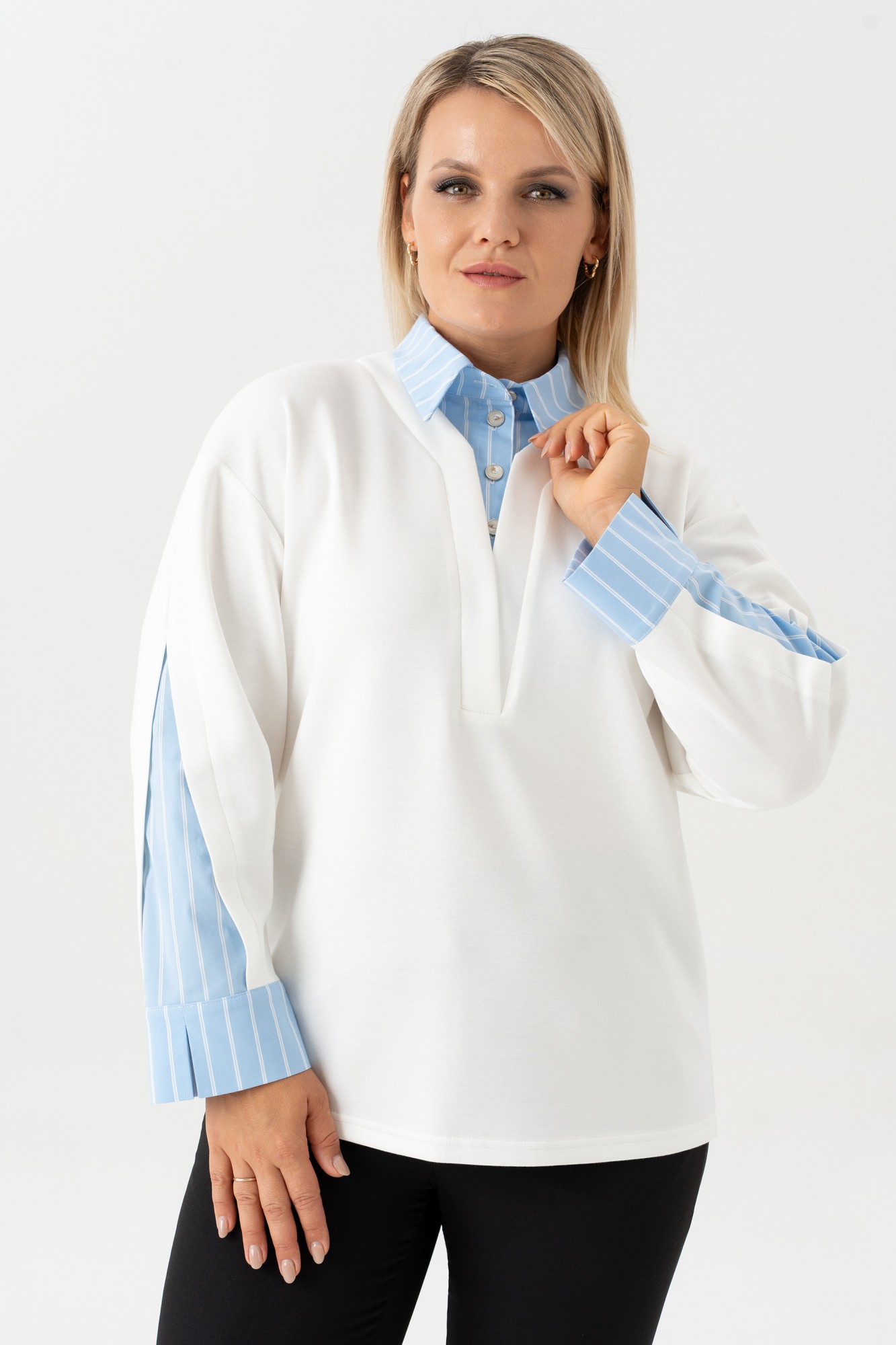 Практичный и удобный – он станет Вашей любимой туникой, а трендовый дизайн делает его актуальным решением для девушек, которые следят за модой. Свитшот женский с имитацией рубашки- новинка коллекции. Изготовленный из качественного трикотажа и полоски на х/б основе, он обеспечивает дышащие свойства и гипоаллергенность, что особенно важно для женщин с чувствительной кожей. Подходит на осень, весну и для зимы. Ткань необычайно мягкая и приятная к телу. Свободный оверсайз крой изумительно подойдет для девушек и женщин больших размеров. На свитшоте обработан воротник и застежка –планка на петли и пуговицы. Рукав комбинирован из двух тканей, с манжетой и разрезом. Модель подходит для высоких и для невысоких. Такая модель должна быть в каждом гардеробе.