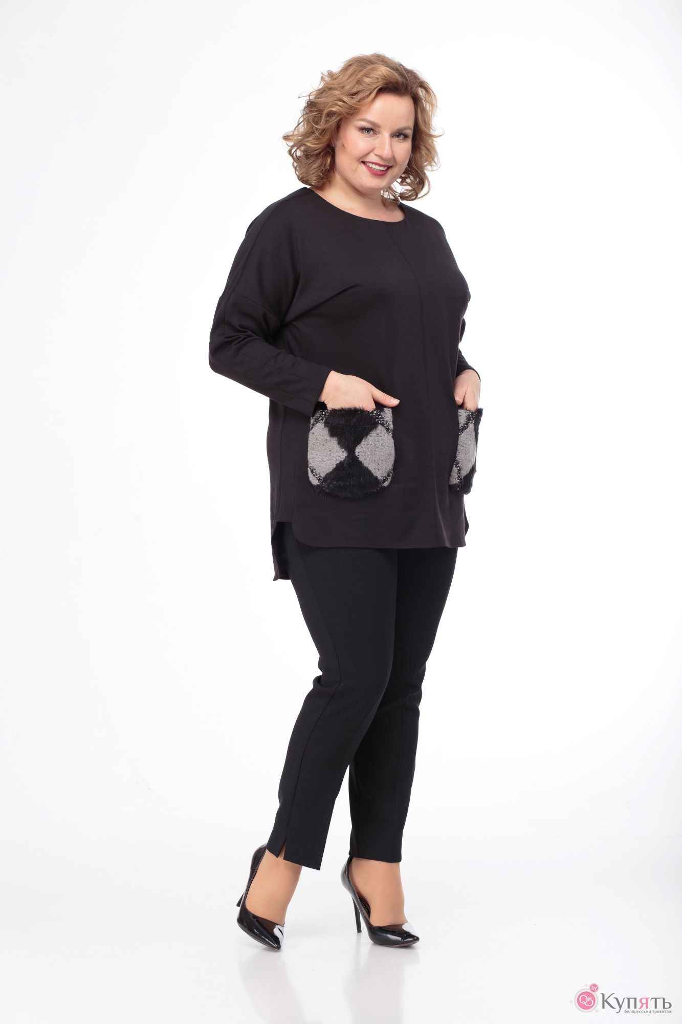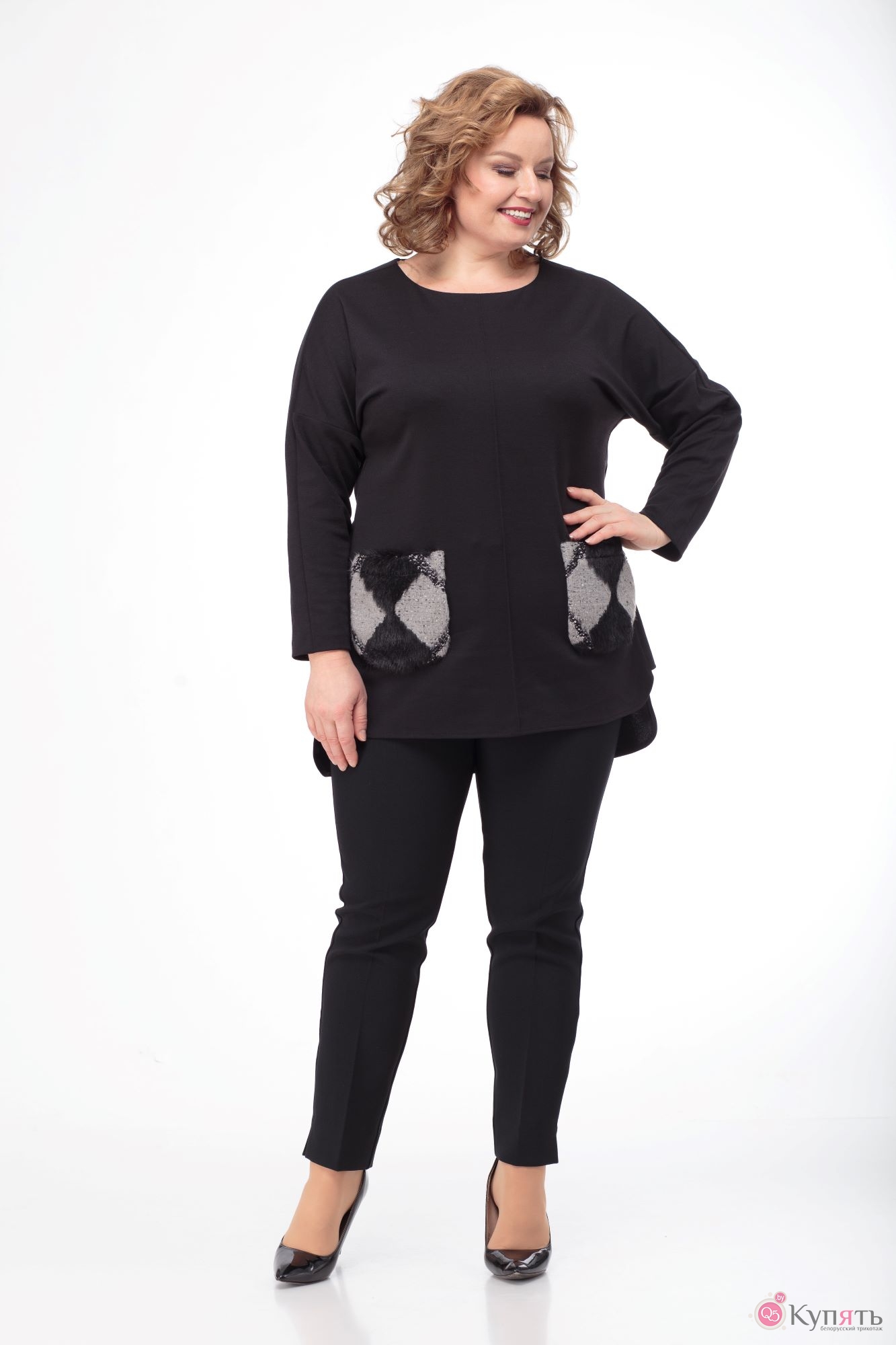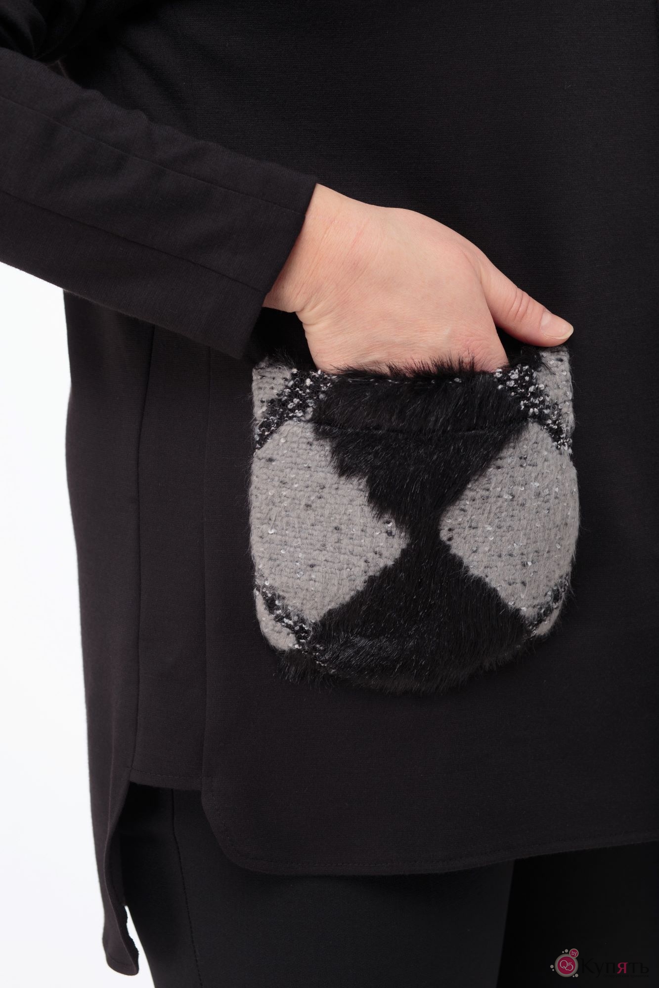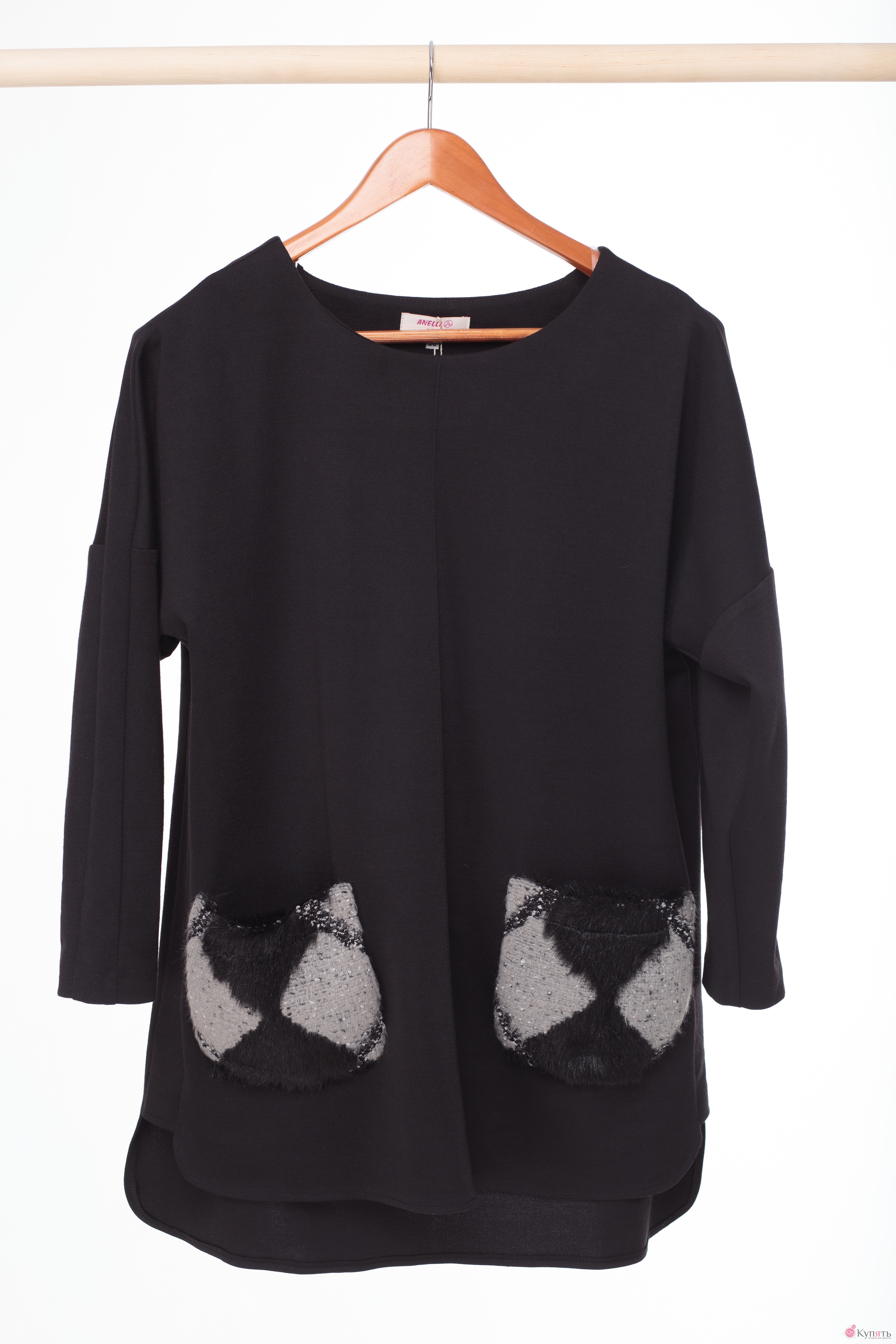 Туника-блузон женская с меховыми карманчиками черных тонов.