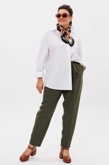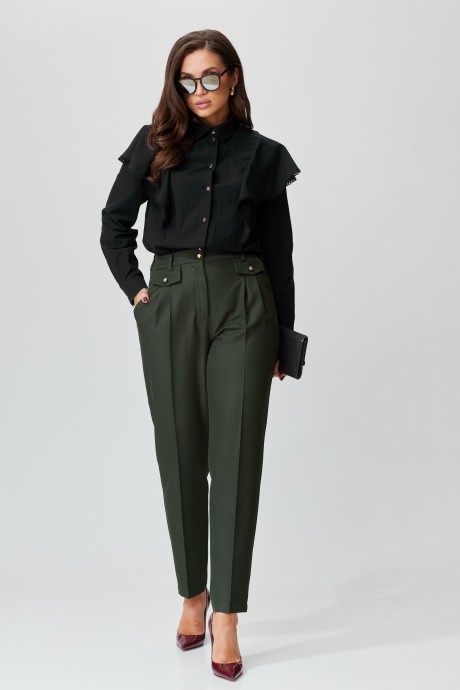 Перед со складками, боковыми карманами и отделочными клапанами. Застежка на тесьму-молнию спереди и петлю и пуговицу по поясу, пояс с эластичной резинкой сзади.