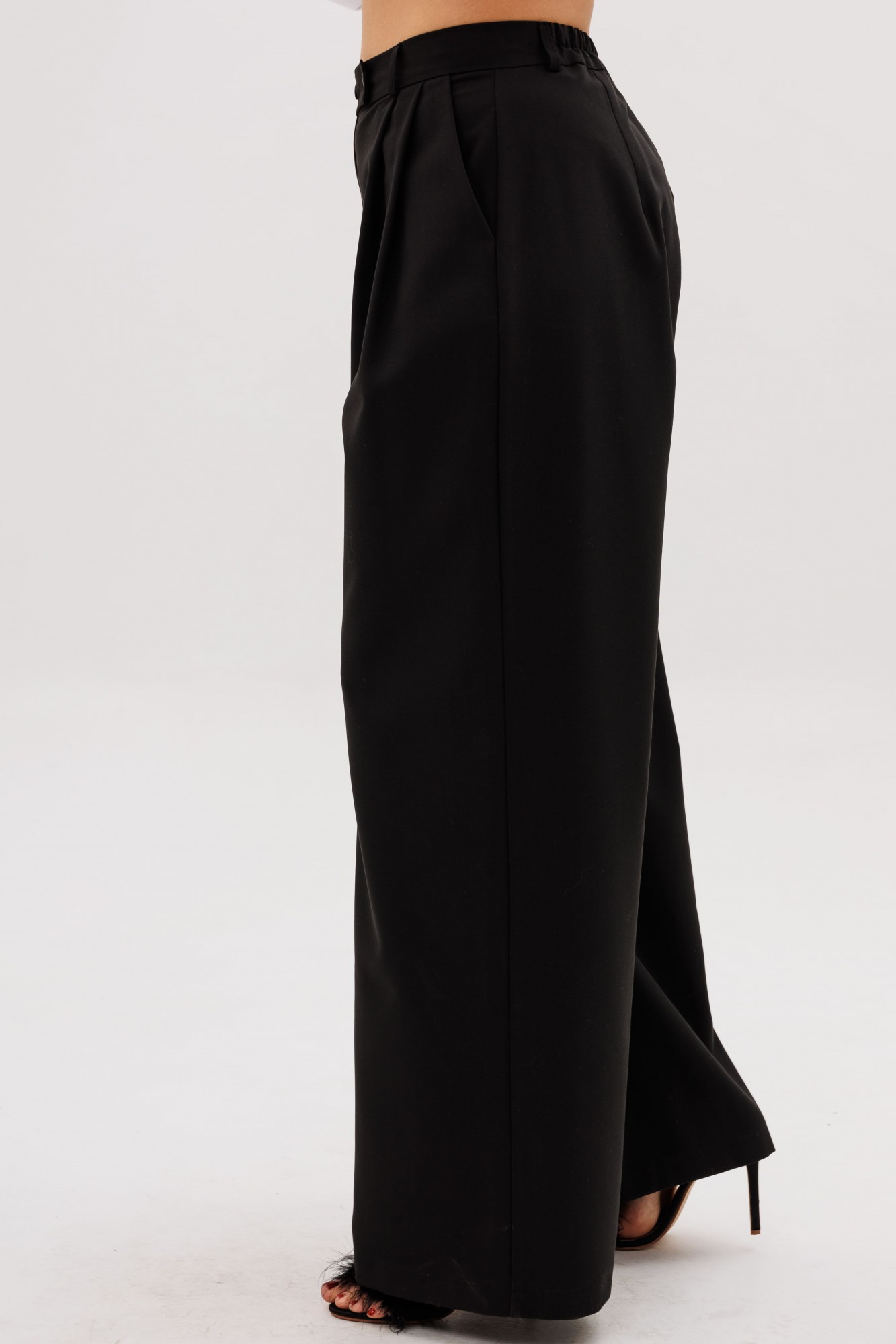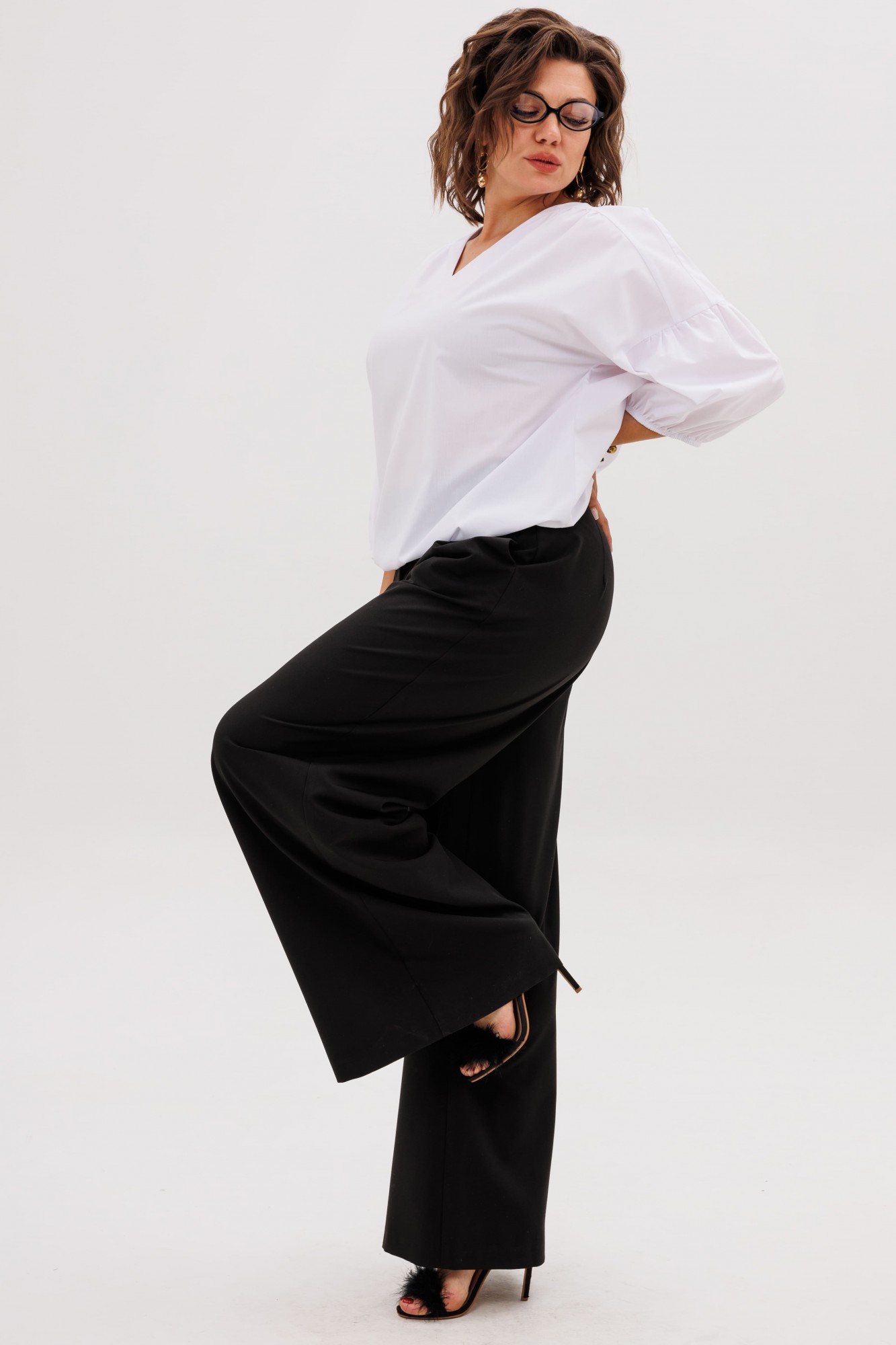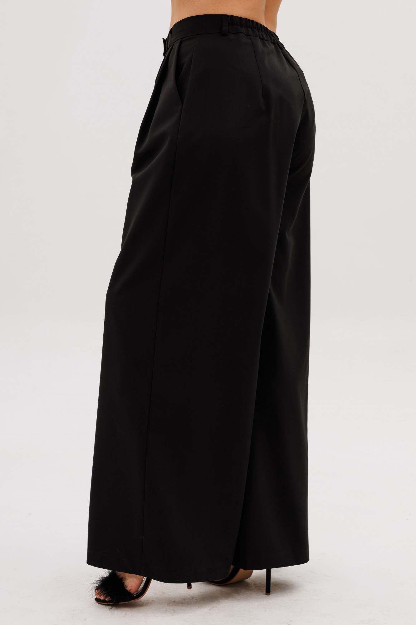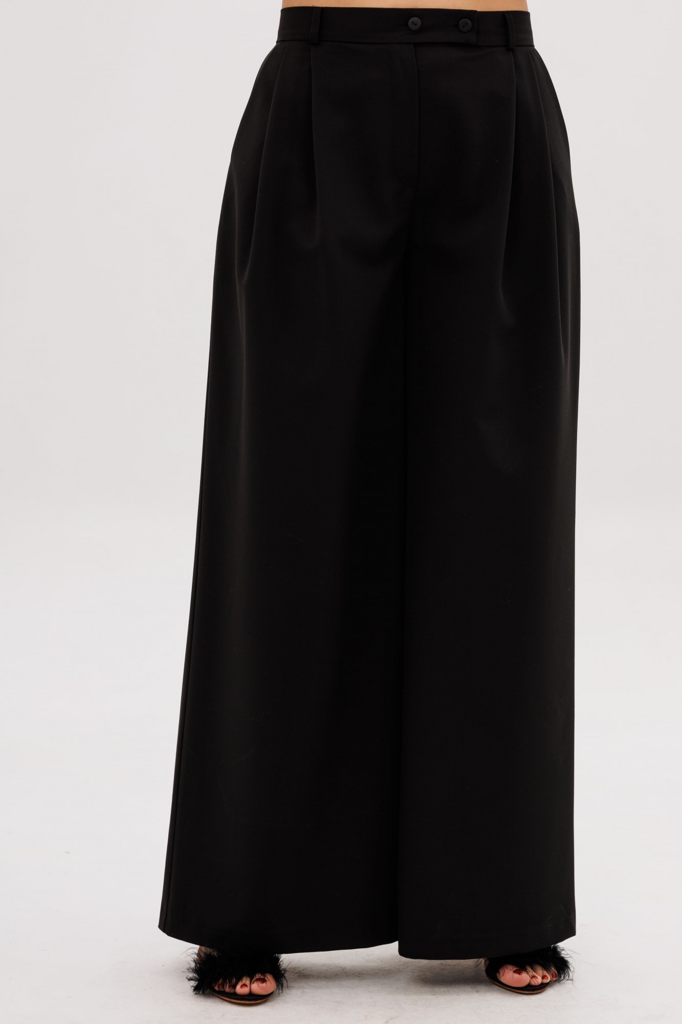 Элегантные брюки-палаццо с современным силуэтом. Модель отличается безупречным кроем с высокой посадкой, который подчеркивает талию и создает выразительный удлиненный контур. Широкие, ниспадающие мягкими складками штанины дарят образу воздушность и непринужденную пластику.