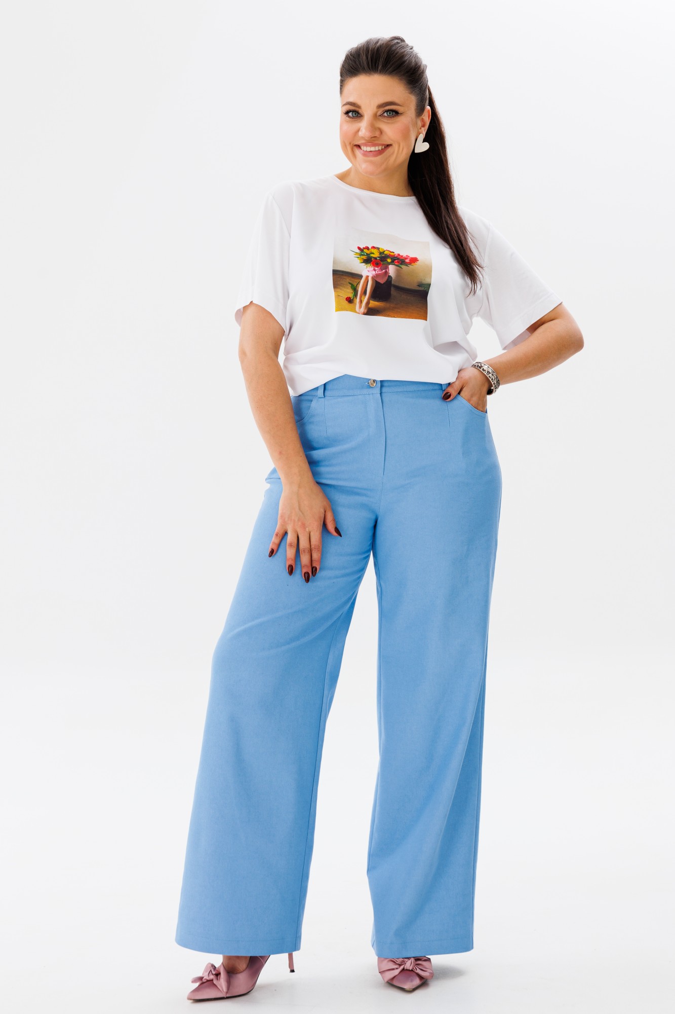 Брюки палаццо из мягкого джинса от Анелли – это идеальный выбор для повседневного стиля. Их удобство и мягкий материал делают их идеальным вариантом для активной жизни. Сделанные из хлопка, они обеспечивают комфорт и свободу движения. Их нежный дизайн позволяет легко сочетать их с различными верхами, создавая стильные образы на любой случай. Брюки на резинке с карманами. На модели белая футболка 1280 и рубашка 1203 от Анелли.