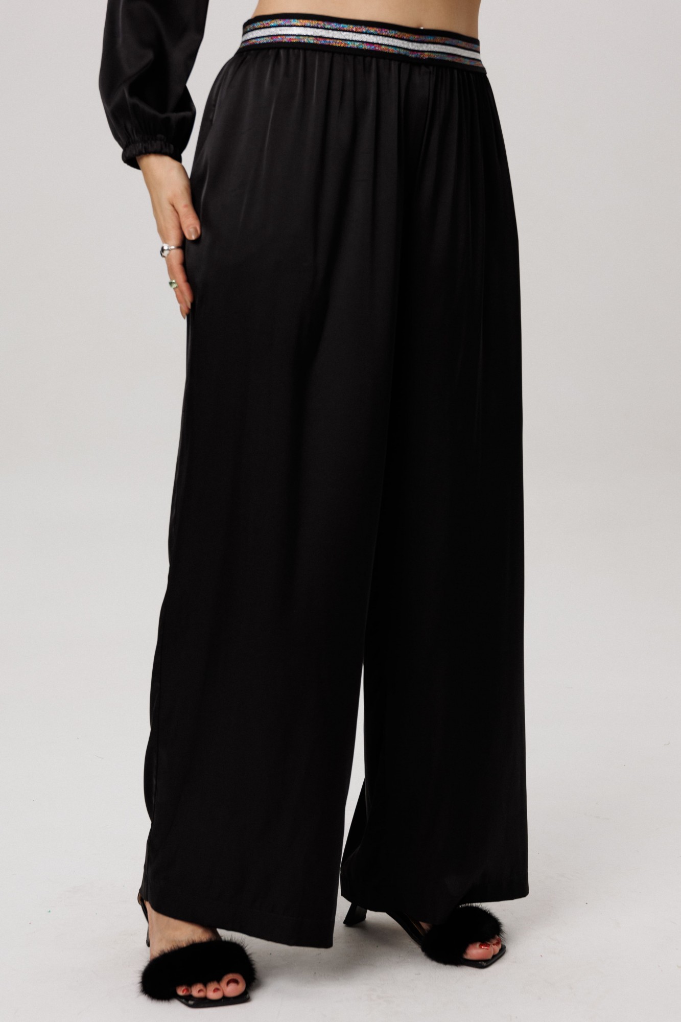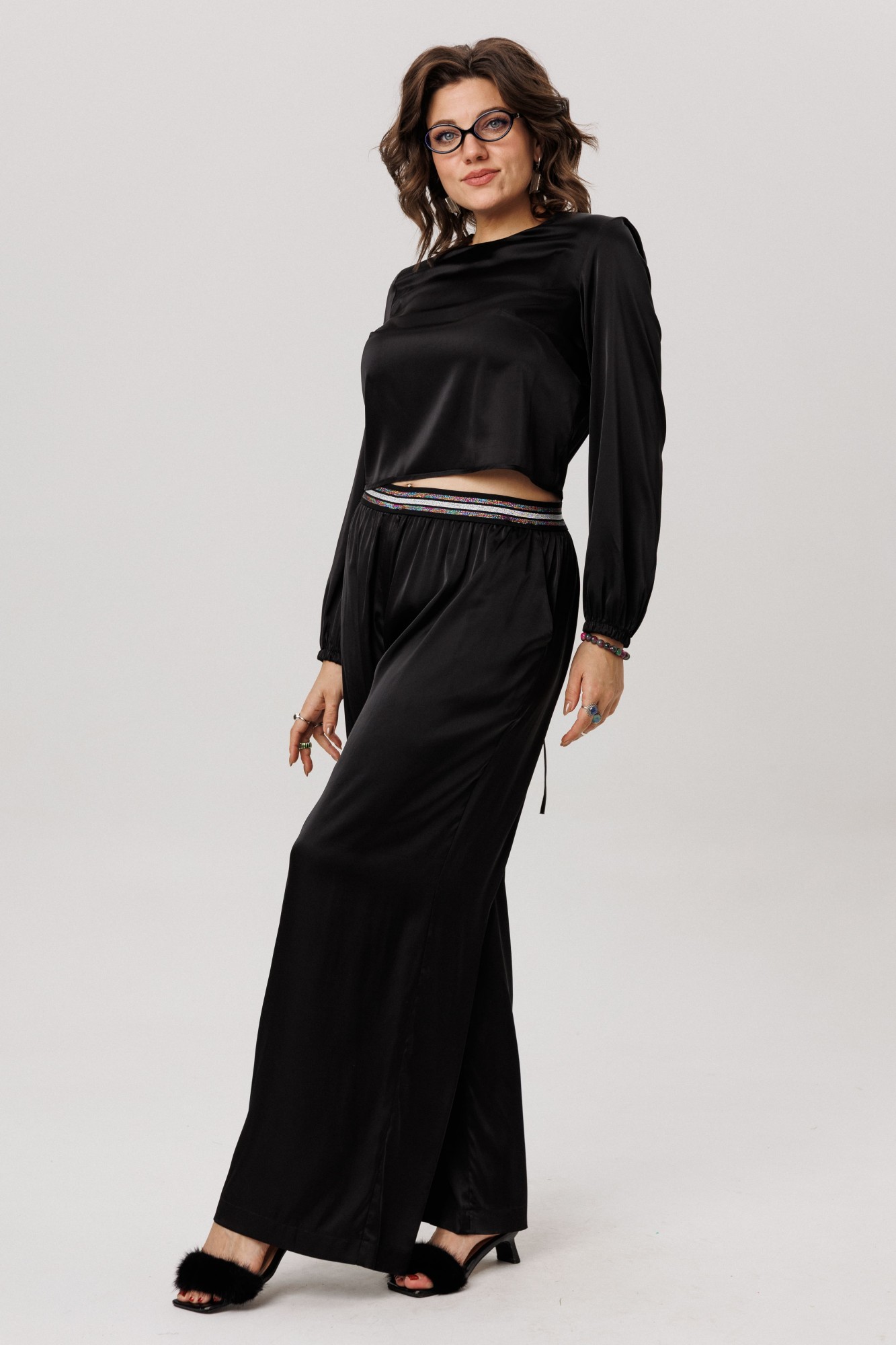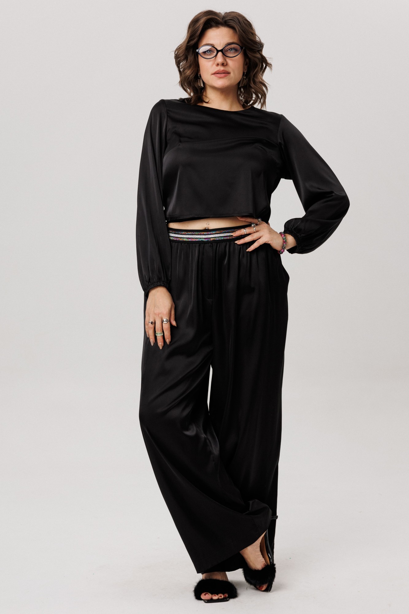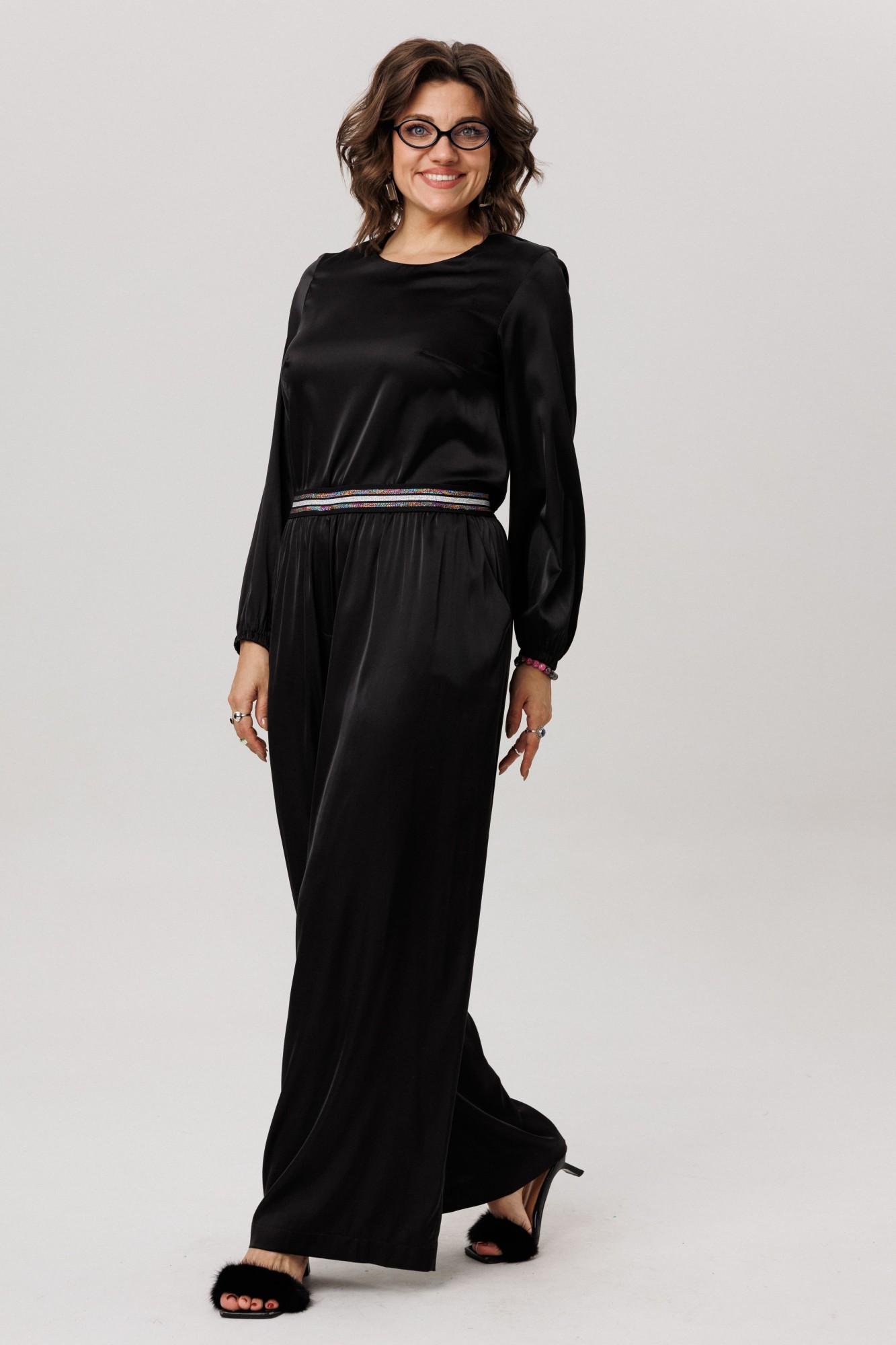 На модели в брюках в цвете «блестящий черный» блуза 1716.