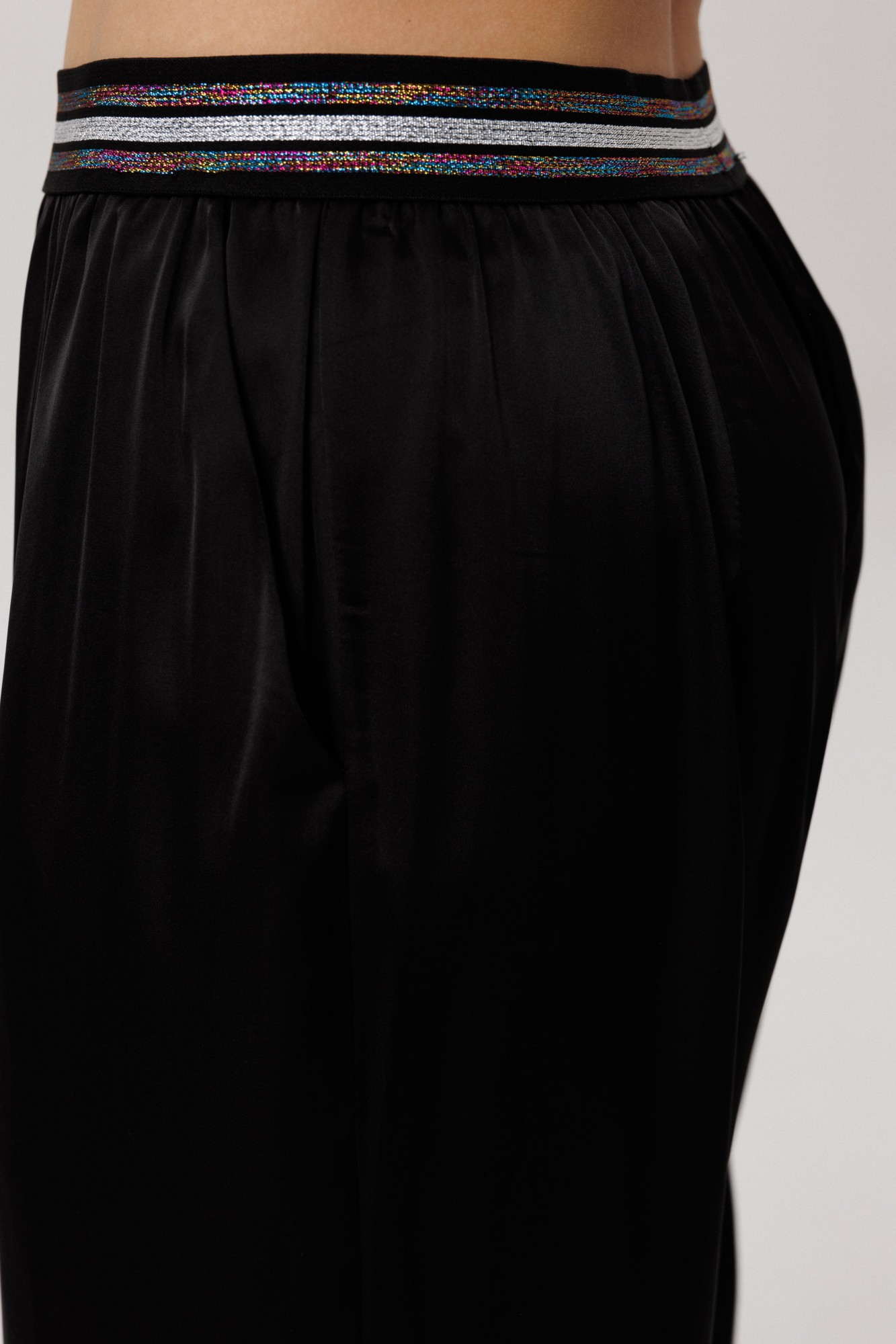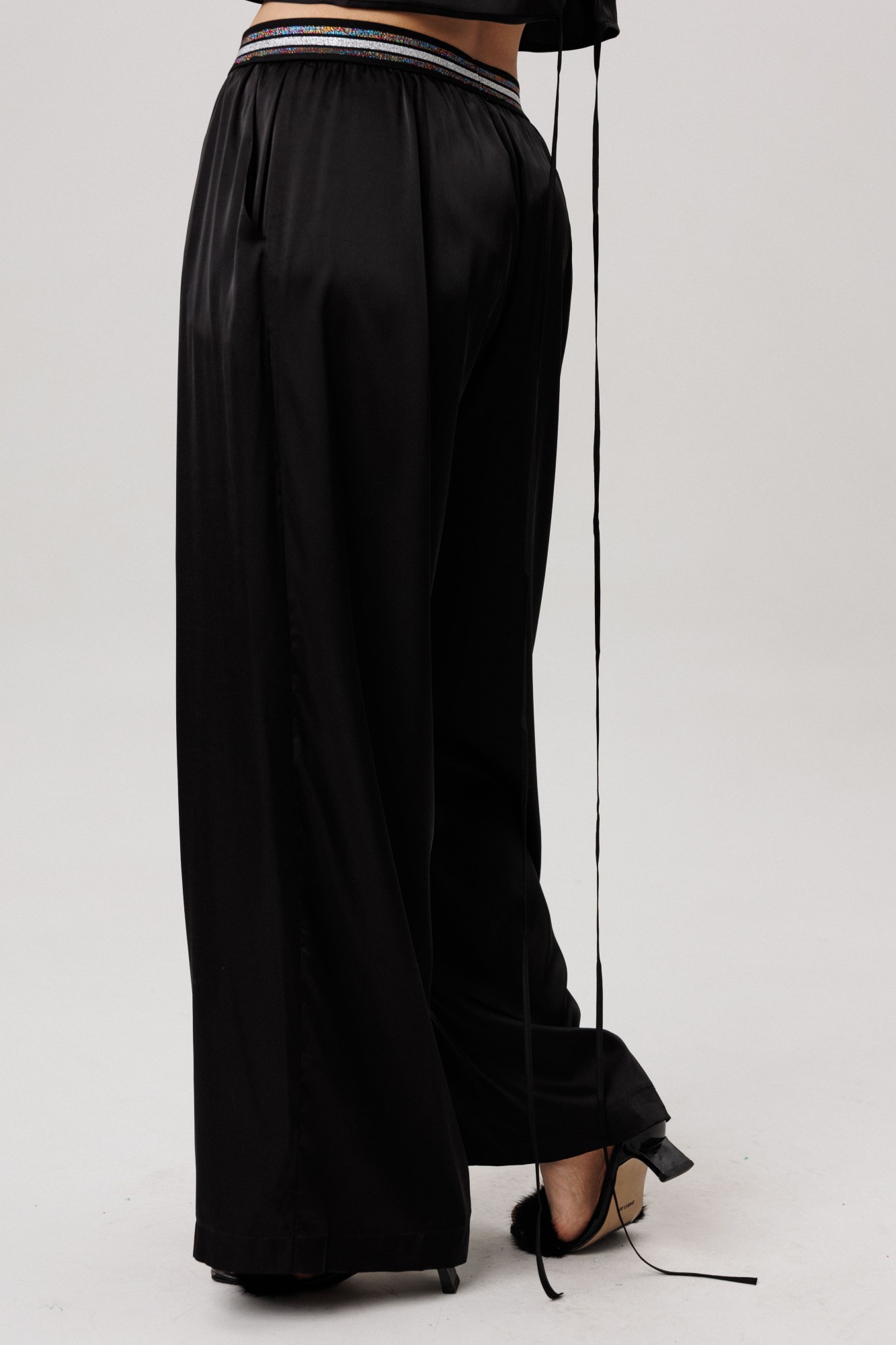 Легкие и струящиеся брюки, сотканные из изысканного арманийского шелка, дарят ощущение невесомой роскоши. Их высокая посадка и мягкие моделирующие защипы у талии создают безупречный, подчеркнуто элегантный силуэт. Свободный, расширяющийся к низу крой обеспечивает невероятную легкость движения и формирует динамичный образ.