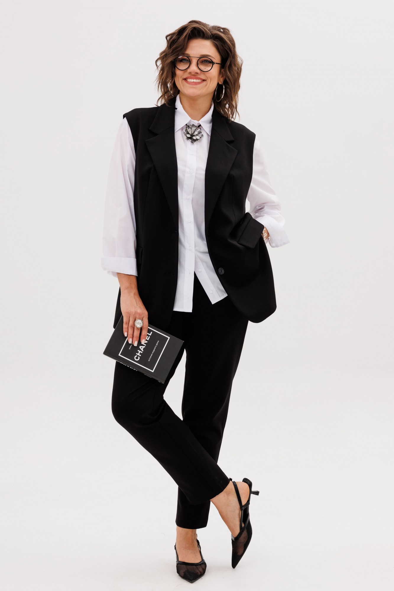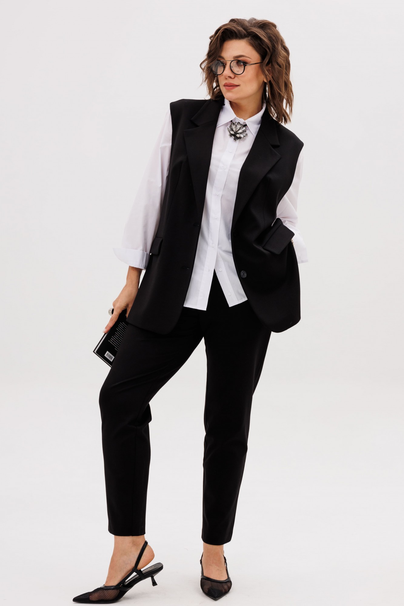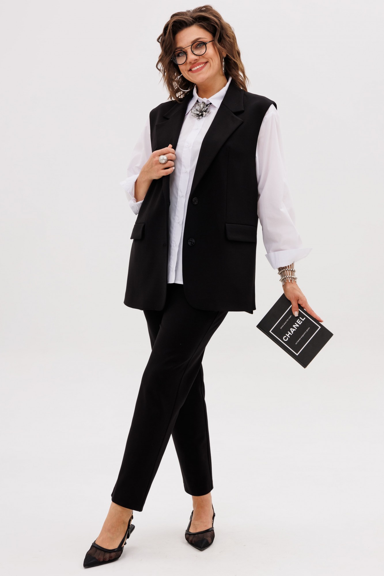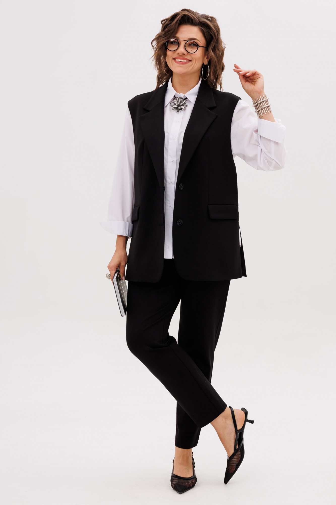 На модели жилет с кольцами 1675, рубашка 1503, жакет Эко кожа 1470.