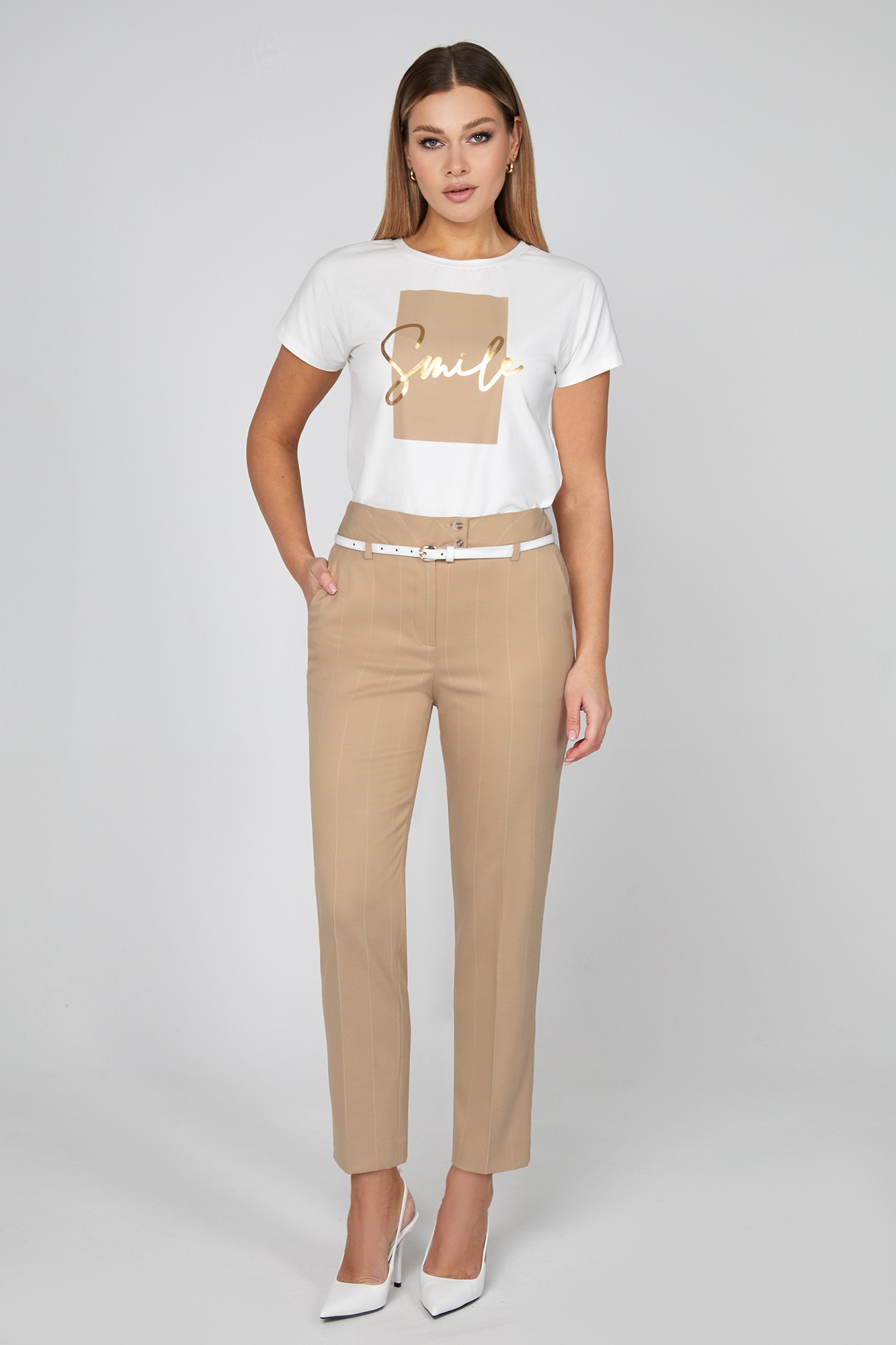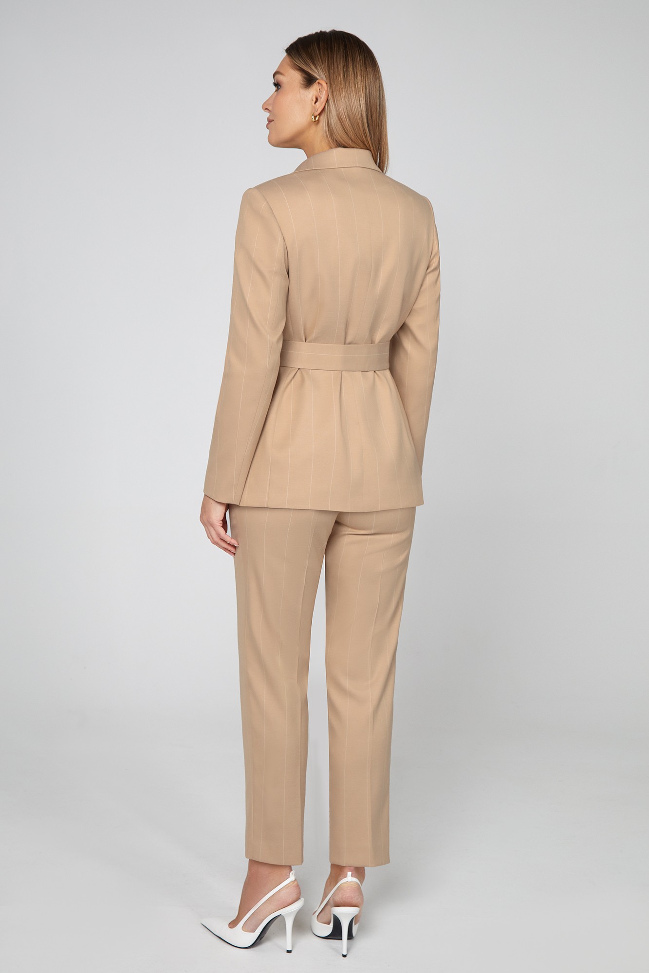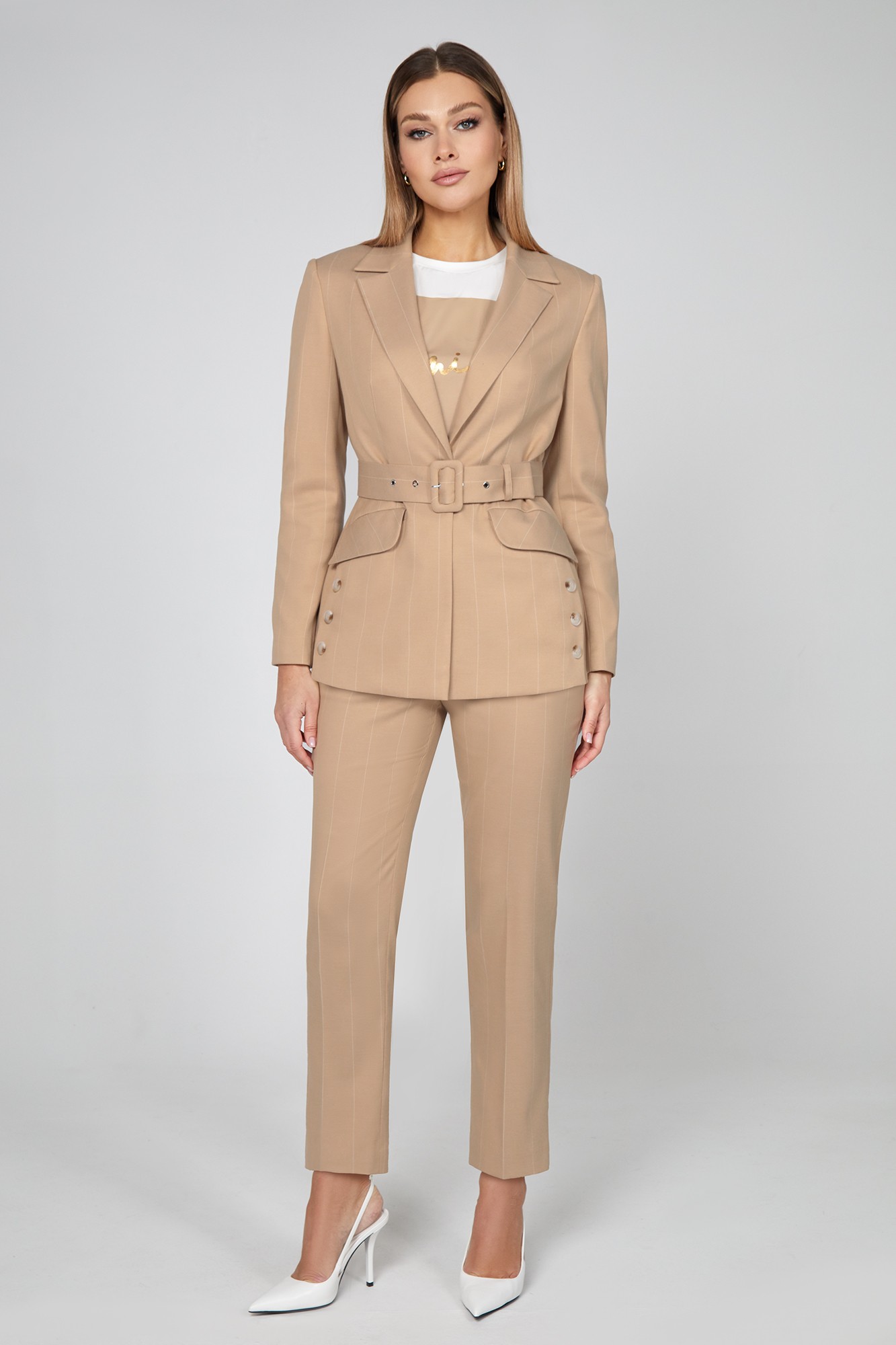 Стильные брюки со стрелками, с посадкой на талии. Модель выполнена из приятной ткани в полоску с добавлением вискозы. Изделие на притачном поясе, частично собранном на эластичную тесьму, застёжкой на молнию и петли-пуговицы и косыми карманами по переду. Короткие шлёвки позволяют дополнить брюки узким ремнём. В пару к изделию можно подобрать жакет из той же линейки для создания готового комплекта.