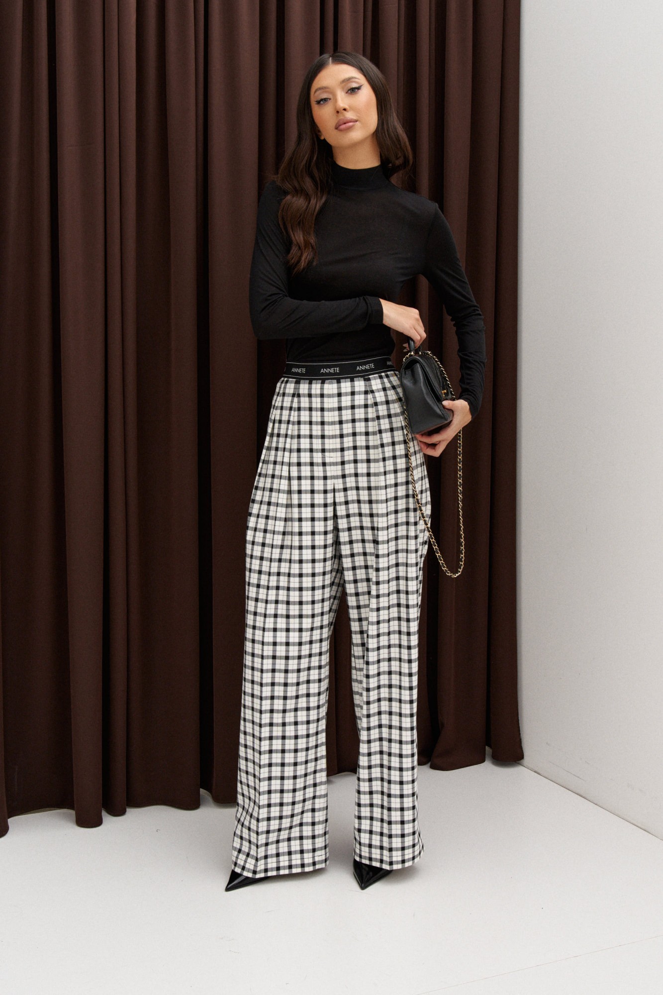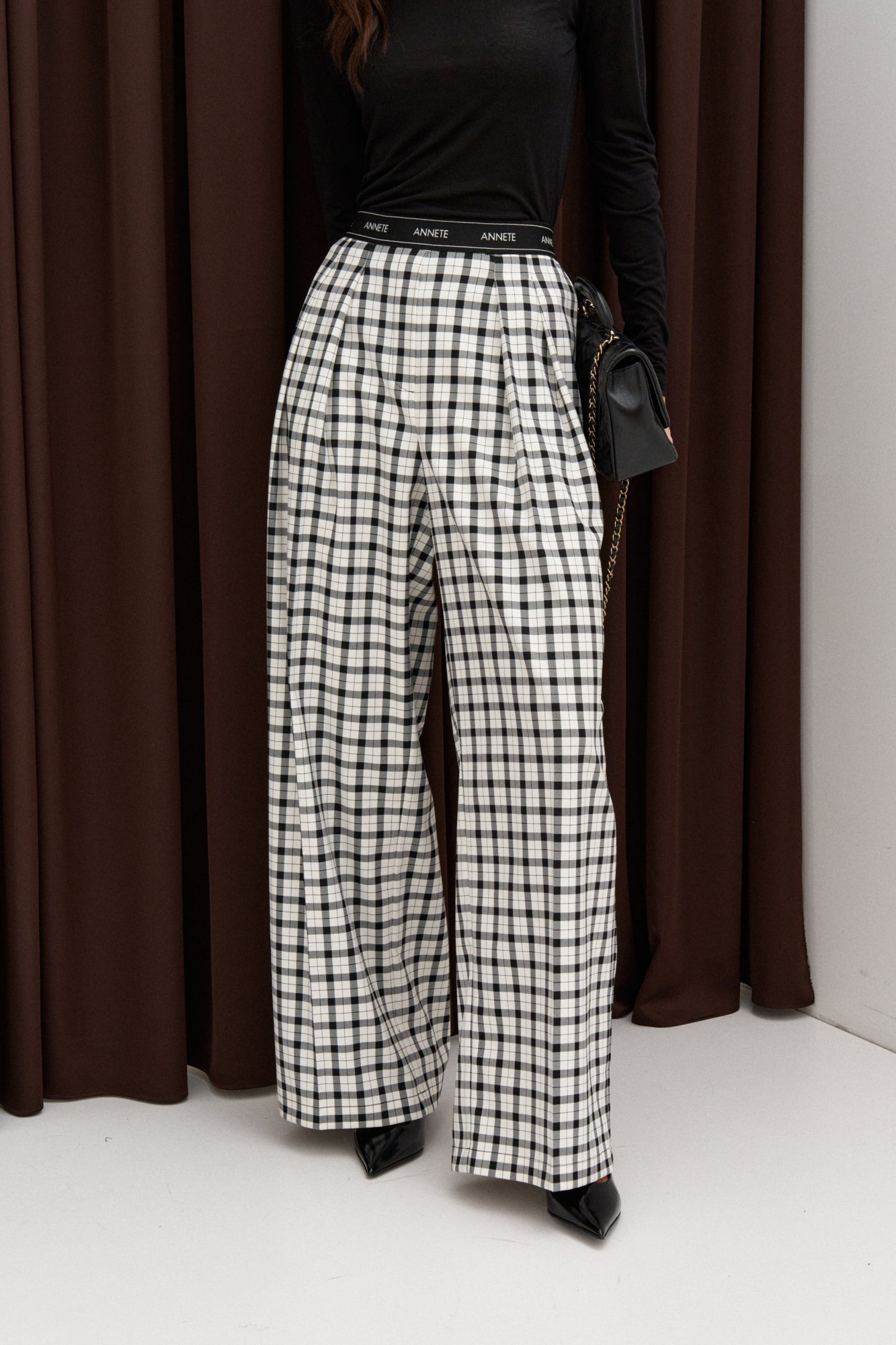 Брюки прямого кроя выполнены из хлопкового полотна в черно-белую клетку. Характеристики: прямой крой, эластичная брендированная резинка "Annete", боковые карманы, на передних и задних частях брюк застрочены складки и заутюжены стрелки.