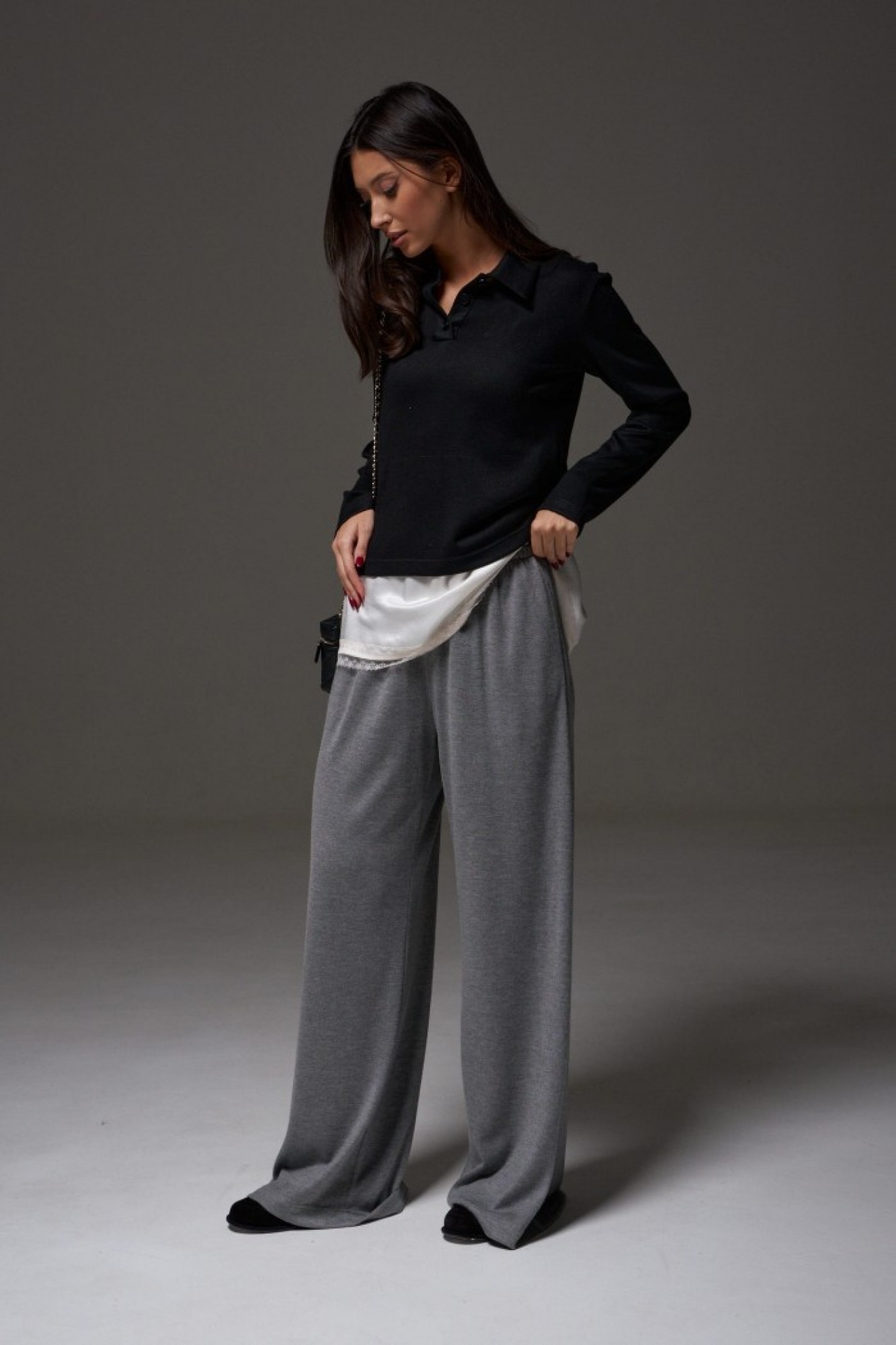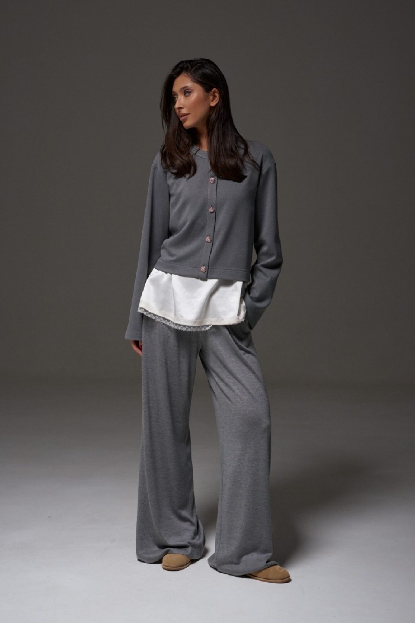 Брюки прямого, свободного кроя выполнены из трикотажного полотна серого цвета. Характеристики: прямой крой, пояс на резинке, в боковых швах карманы.