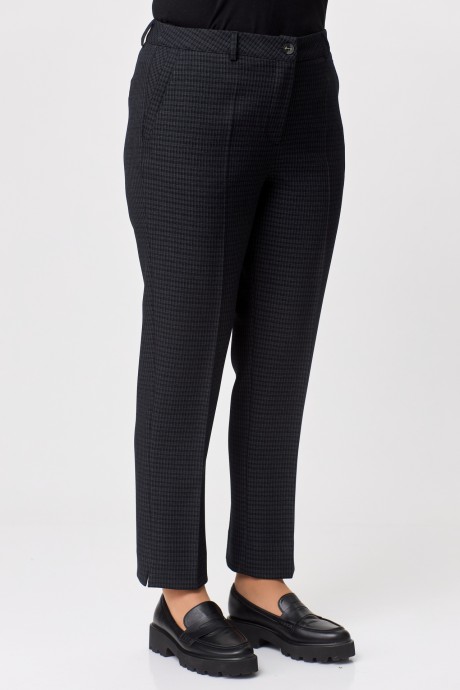 Брюки классические, из плотной текстильной ткани, прямые, слегка заужены к низу, заутюжены стрелки, по переду обработаны карманы с отрезным бочком, застежка на тесьму-молнию и 1 пуговицу. На задних половинках обработаны вытачки и имитация карманов в рамку с двумя обтачками, пояс в брюках притачной. По низу брюк в боковом шве есть небольшой разрез.