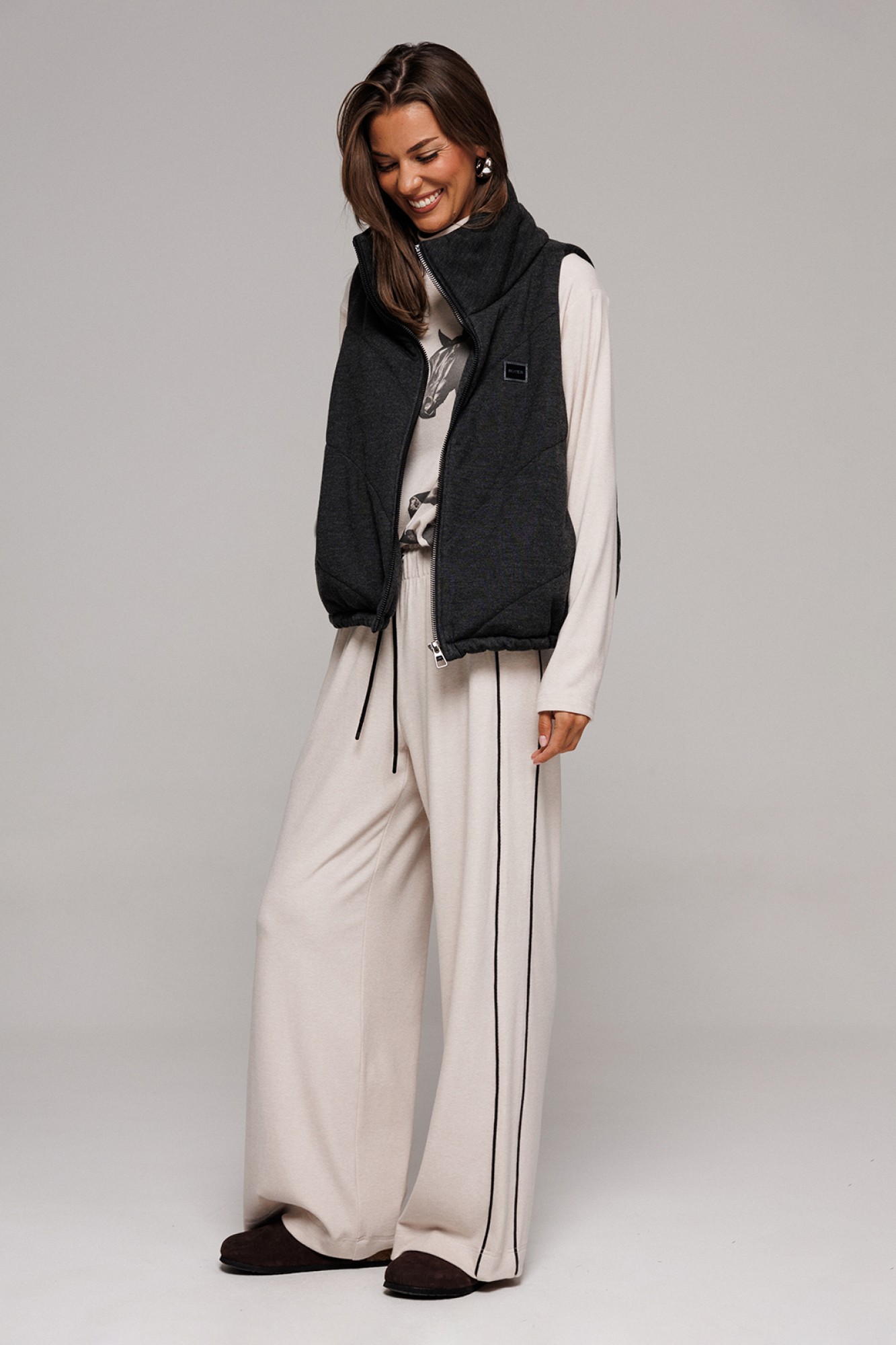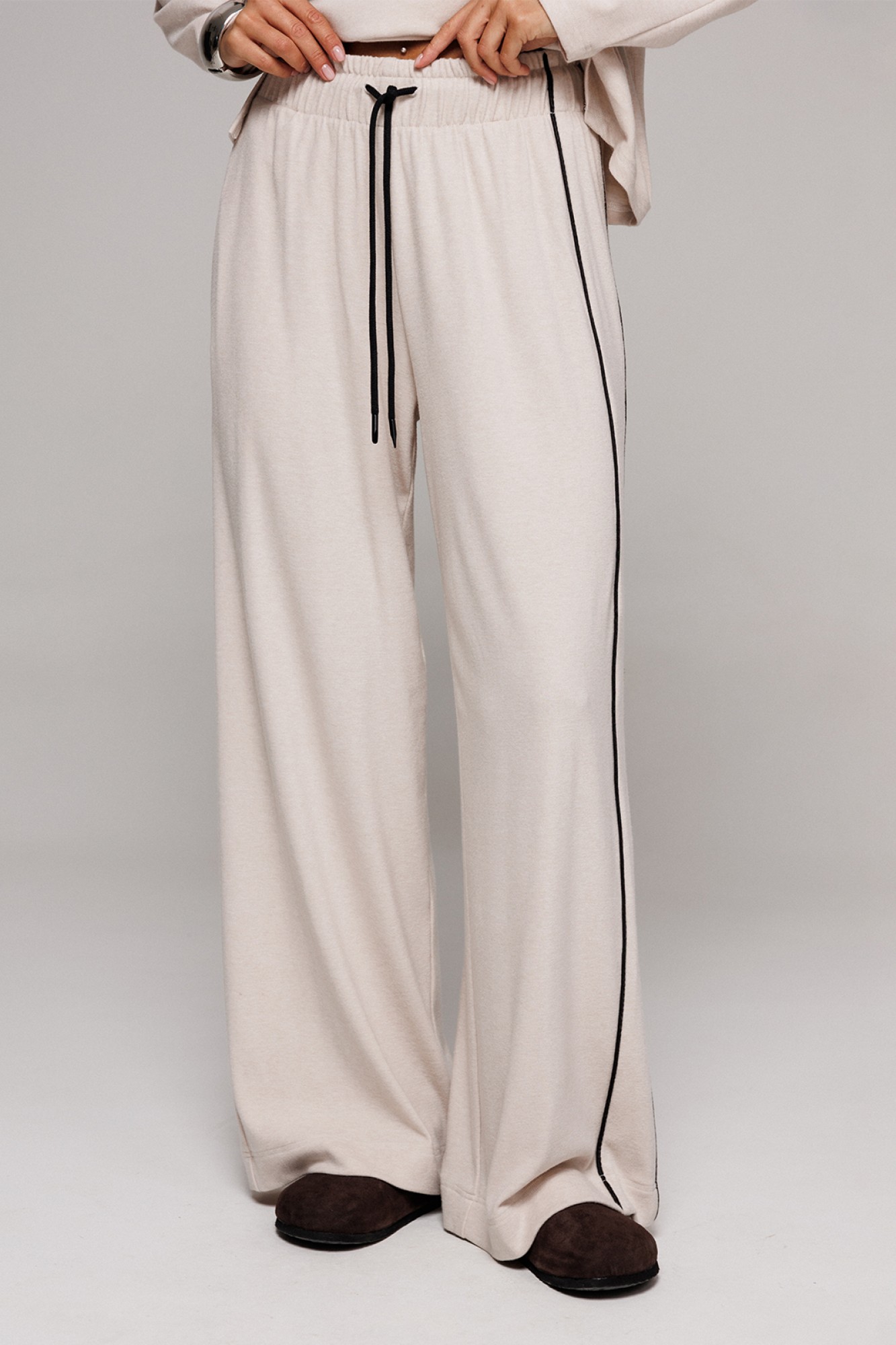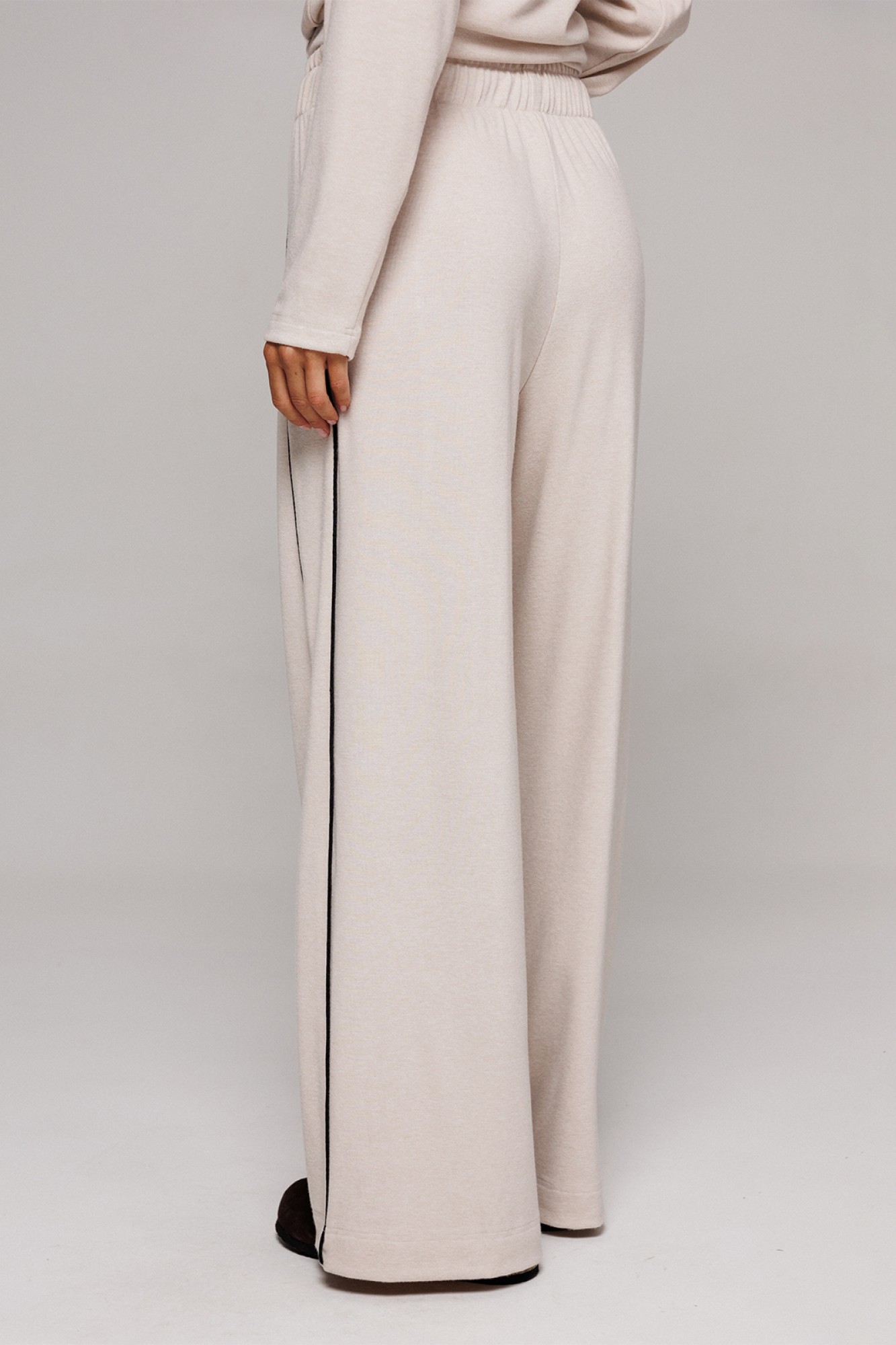 Брюки из трикотажного полотна прямого силуэта на цельнокроеном отстроченном поясе со вставленной в него резинкой и декоративным шнурком. Справа отрезной бочок с кантом, слева в боковом шве карман.