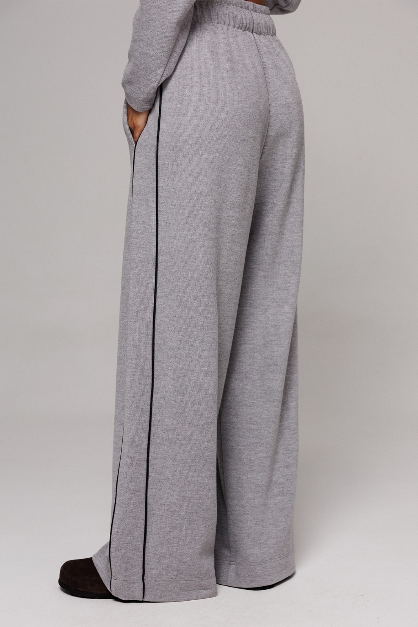 Брюки из трикотажного полотна с велюровым эффектом прямого силуэта на цельнокроеном отстроченном поясе со вставленной в него резинкой и декоративным шнурком. По бокам отрезной бочок с кантом и карманом в шве притачивания бочка.