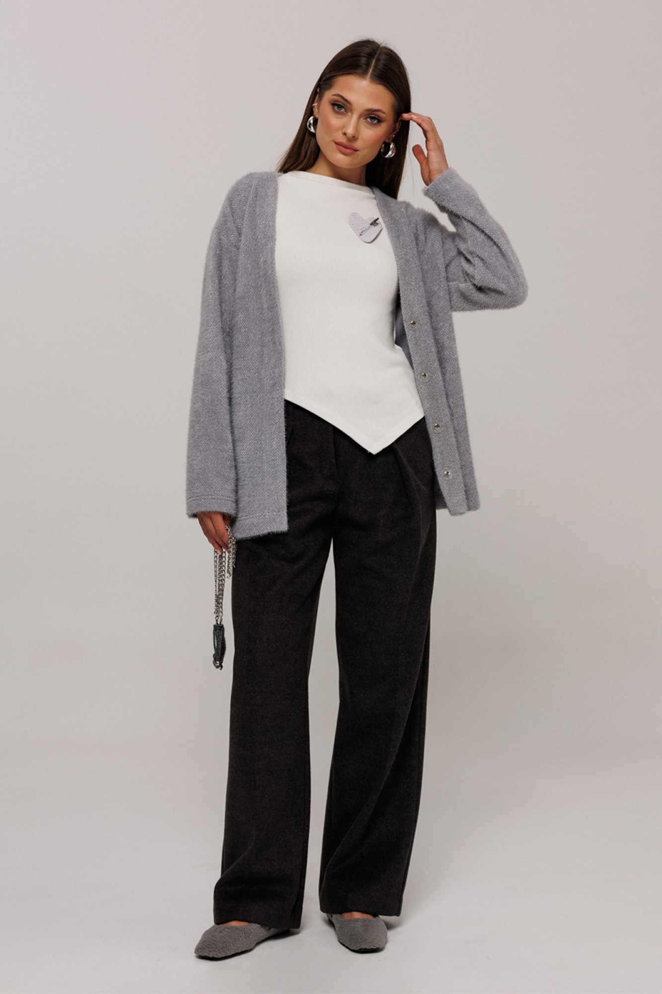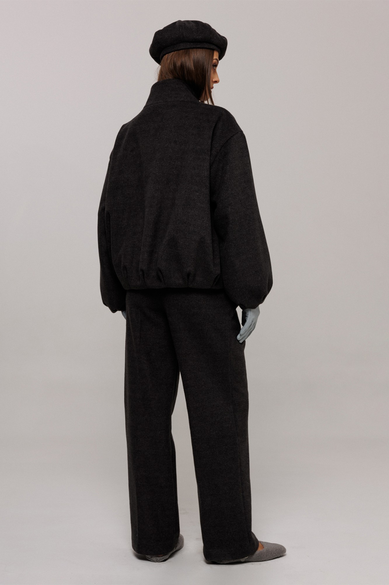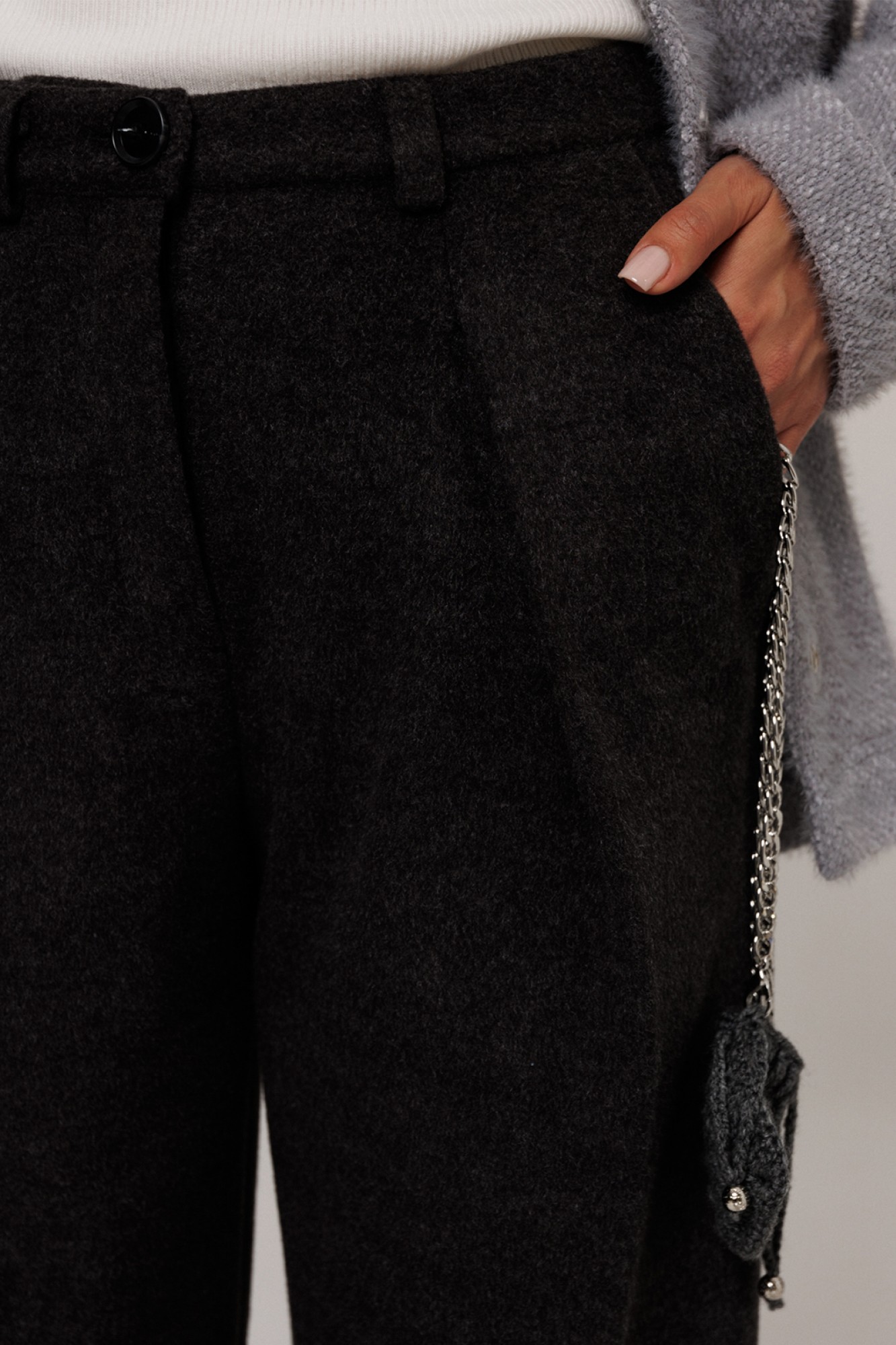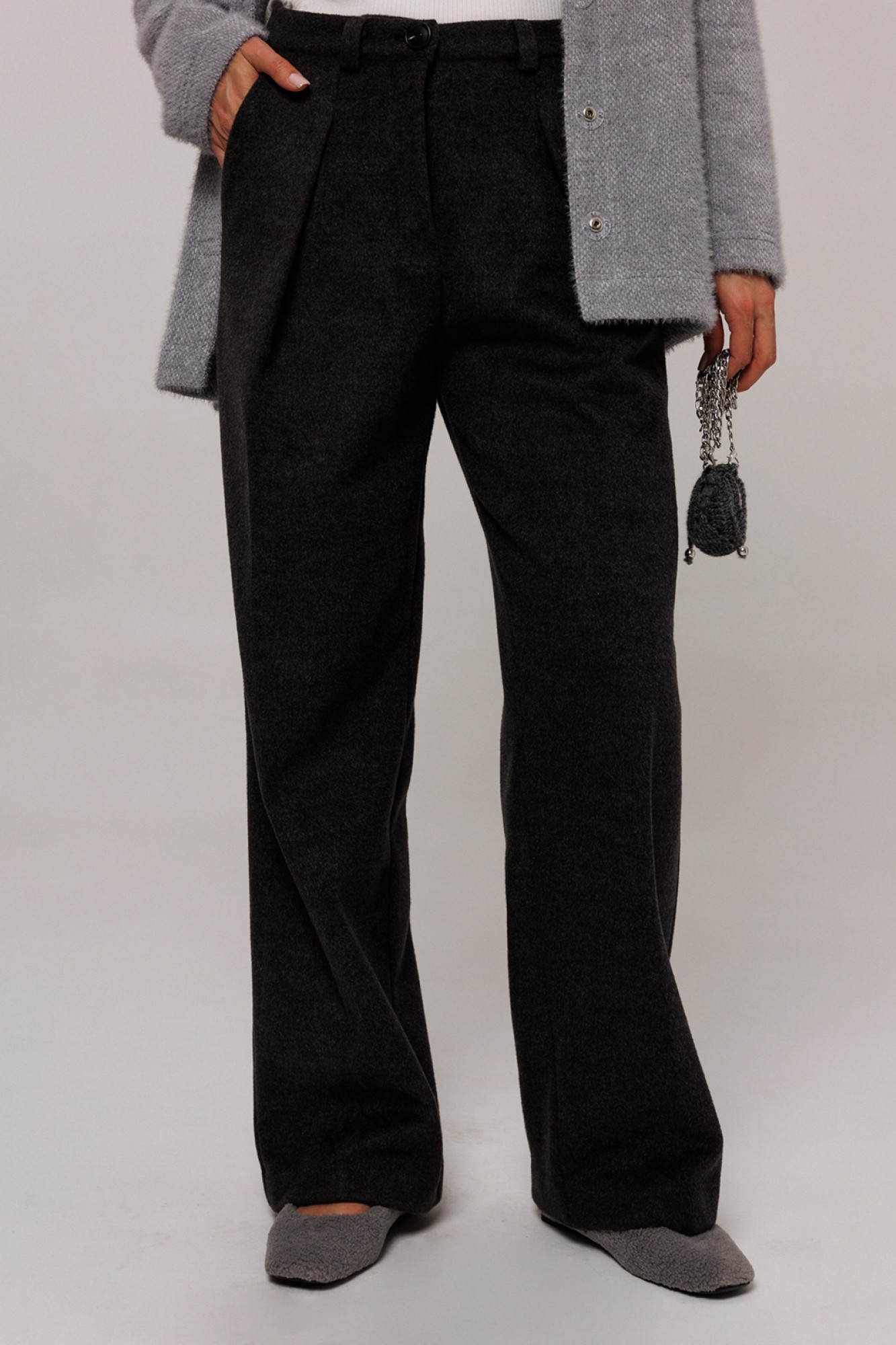 Брюки из пальтовой ткани прямого силуэта на притачном поясе со шлевками и застежкой-гульфик. Пояс застегивается на крючок и потайную петлю-пуговицу. Перед со складкой и заутюженной стрелкой от складки по всей длине брюк и карманами в боковых швах с наклонным входом. Спинка с вытачкой от пояса и заутюженной стрелкой по все длине брюк.