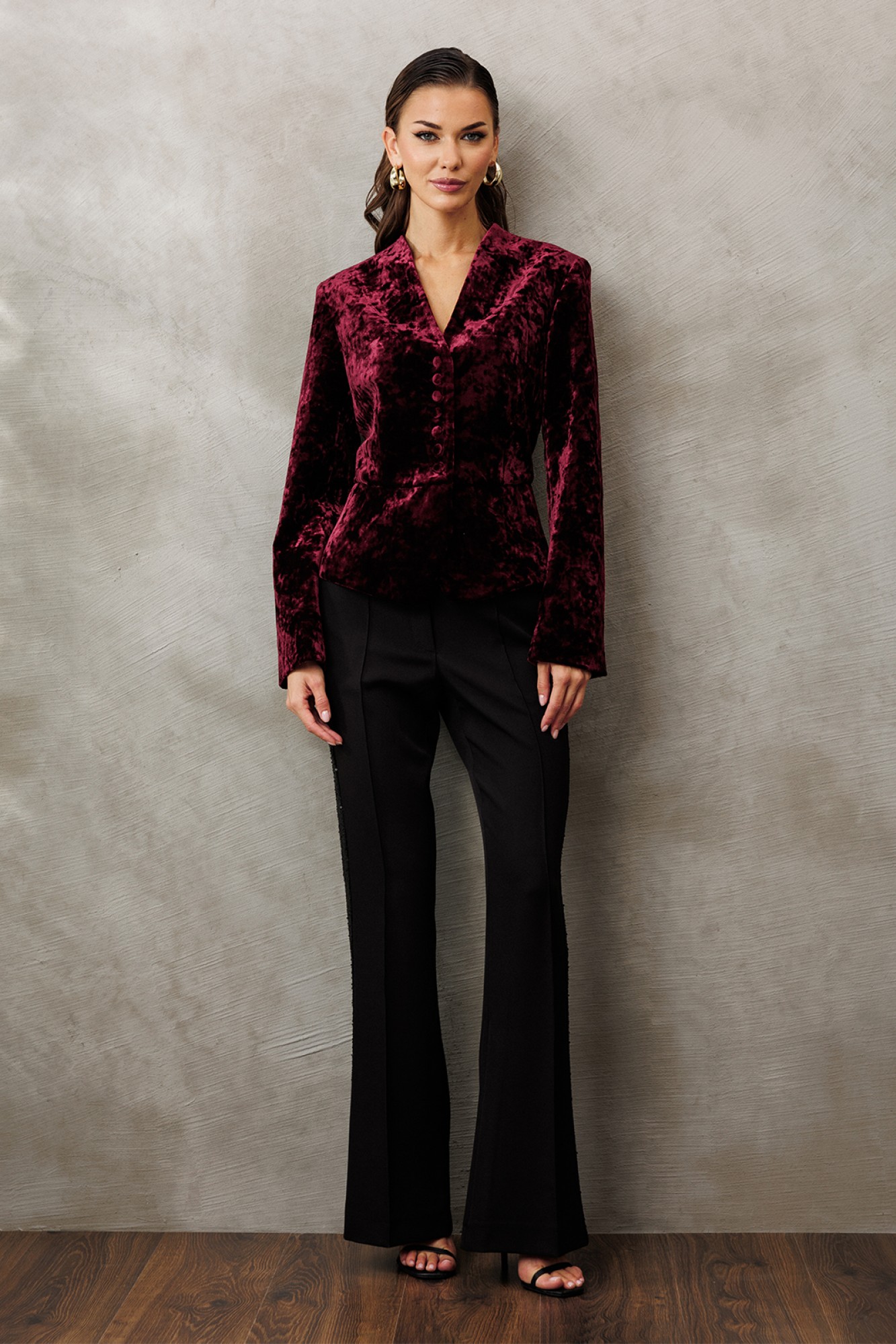 Брюки-клеш из костюмной ткани с лампасом из пайеток. Брюки на притачном поясе с уступом и застежкой-гульфик. Пояс застегивается на крючок и потайную петлю-пуговицу. По переду защип по всей длине брюк и карманами в шве притачивания к лампасу. По спинке вытачка от пояса.