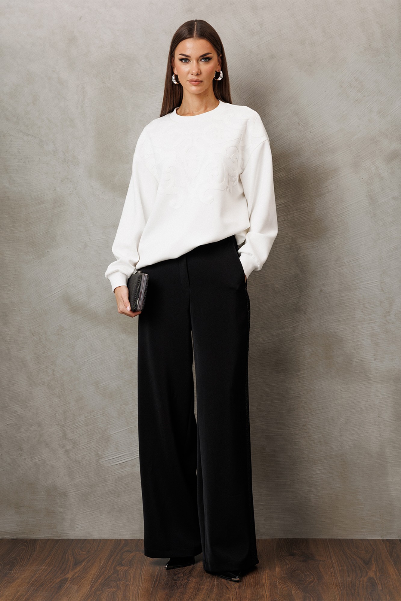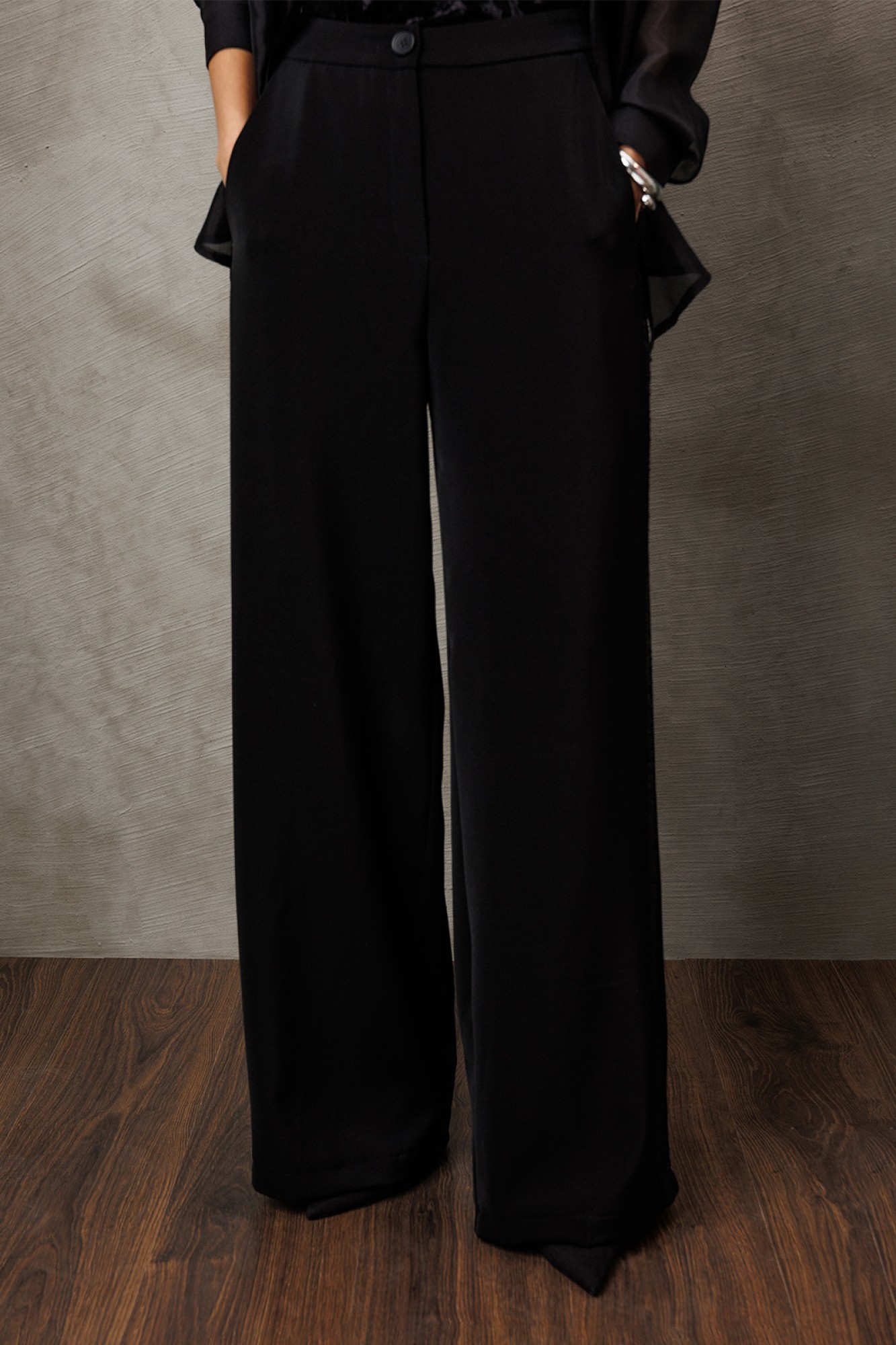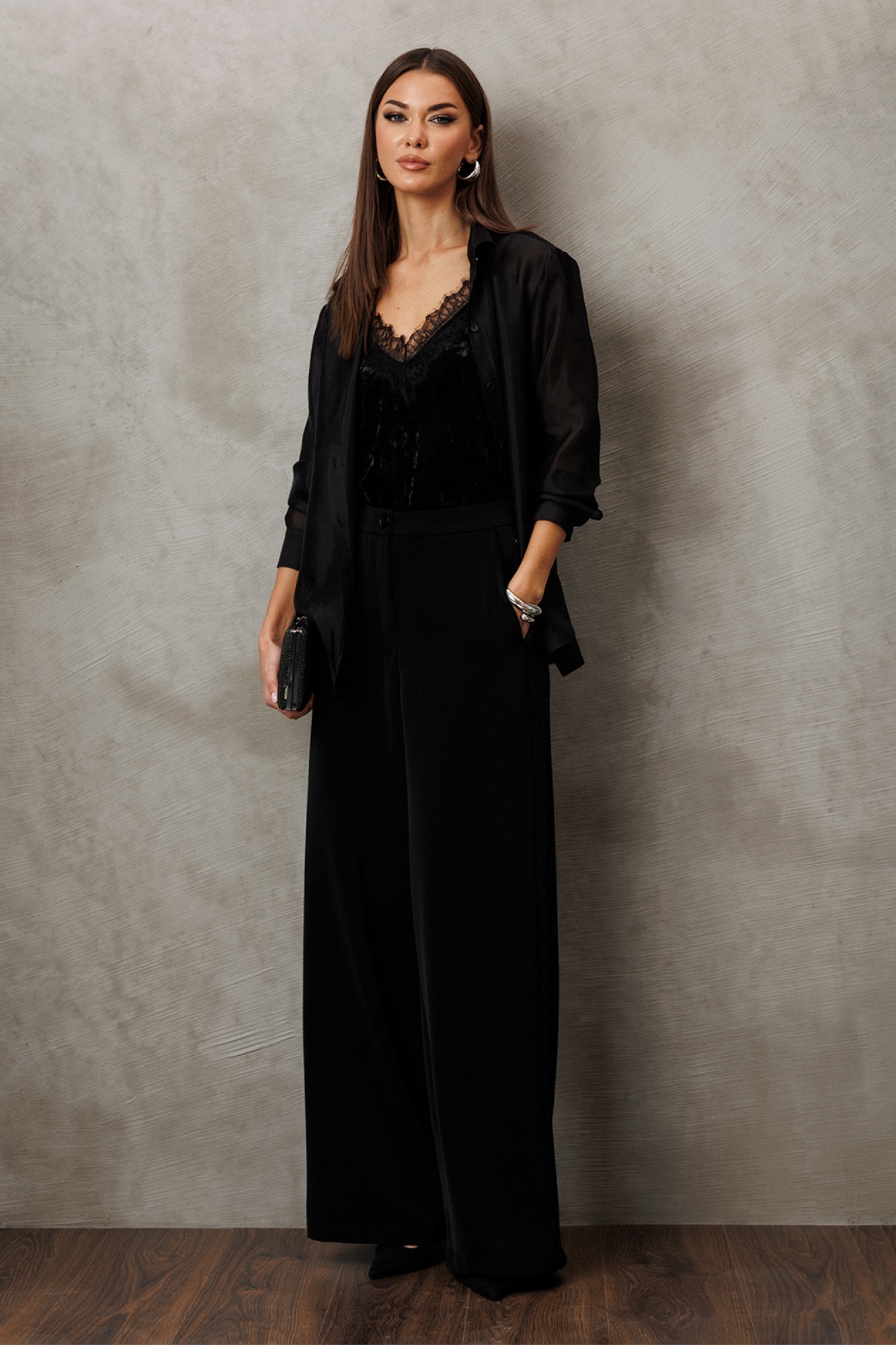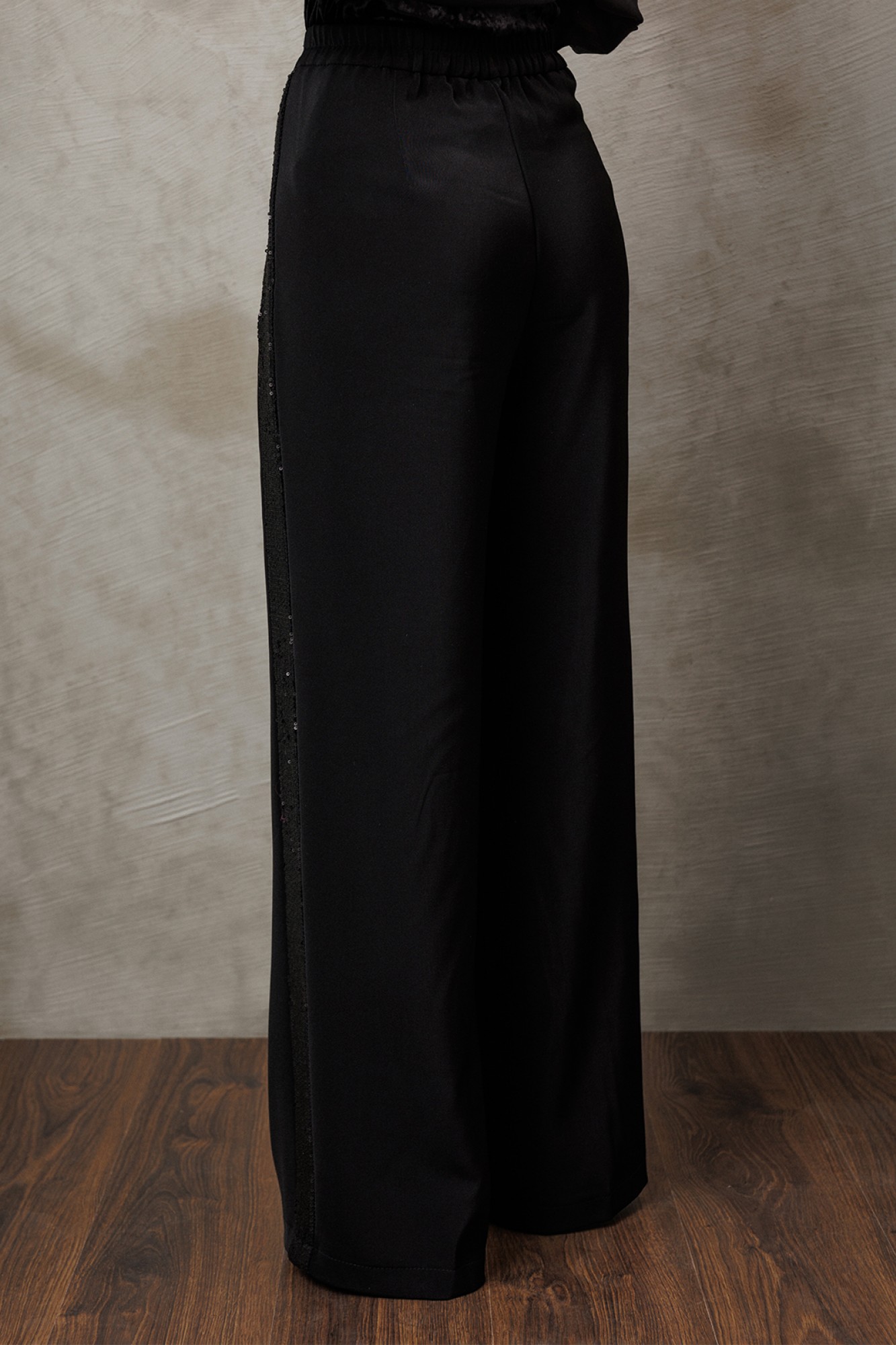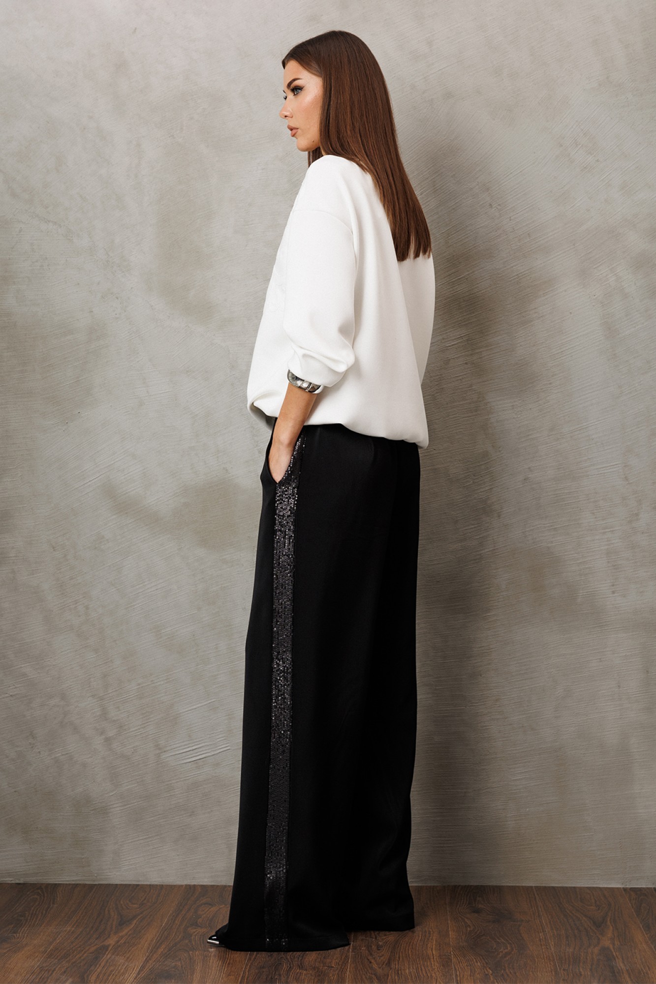 Брюки-палаццо из костюмной ткани с лампасом из пайеток. Брюки на притачном поясе и застежкой-гульфик. Пояс застегивается на петлю-пуговицу. По переду карман в шве притачивания к лампасу. По спинке пояс на резинке и вытачка от пояса.