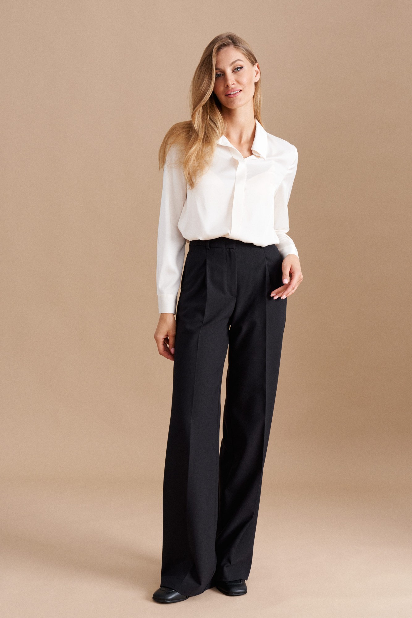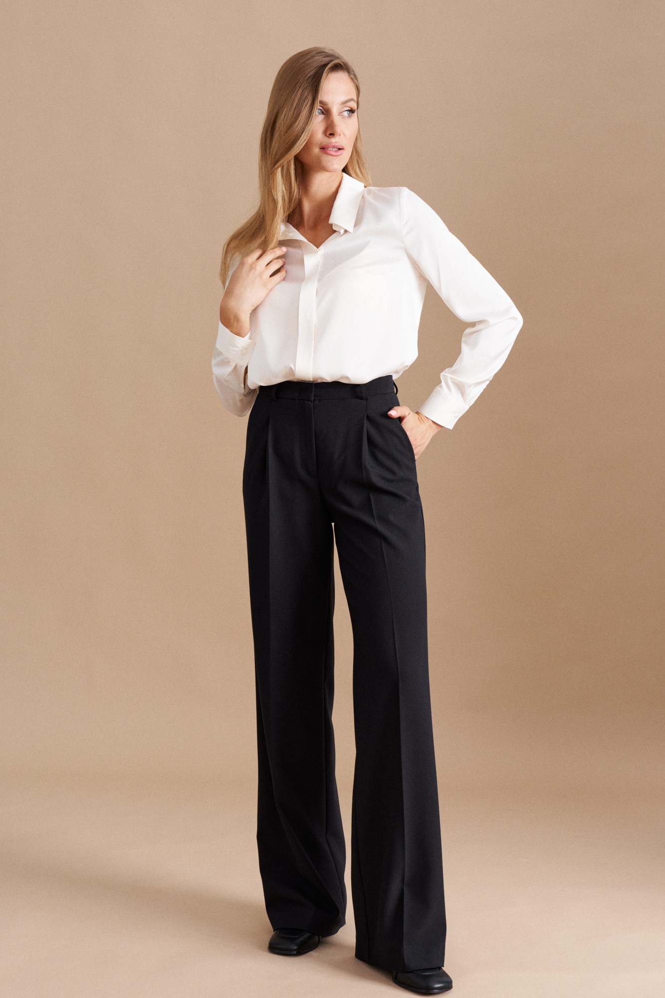 Брюки женские прямого силуэта из костюмной ткани. Изделие на поясе. По переду складки, функциональные карманы в боковых швах. По спинке вытачки. Длина изделия классическая.