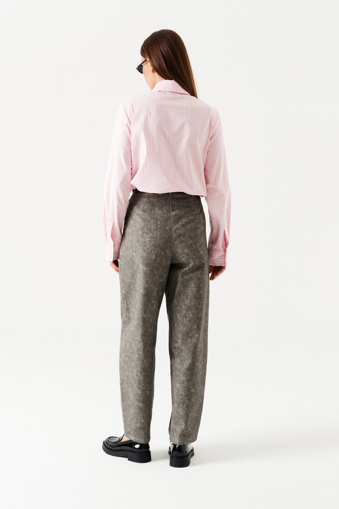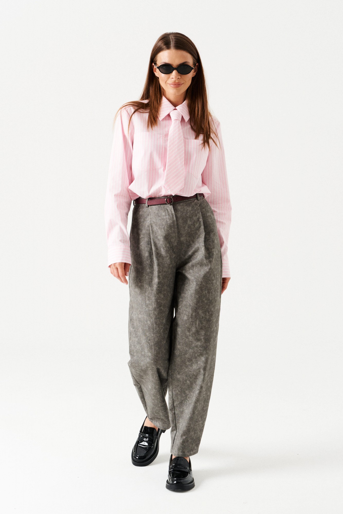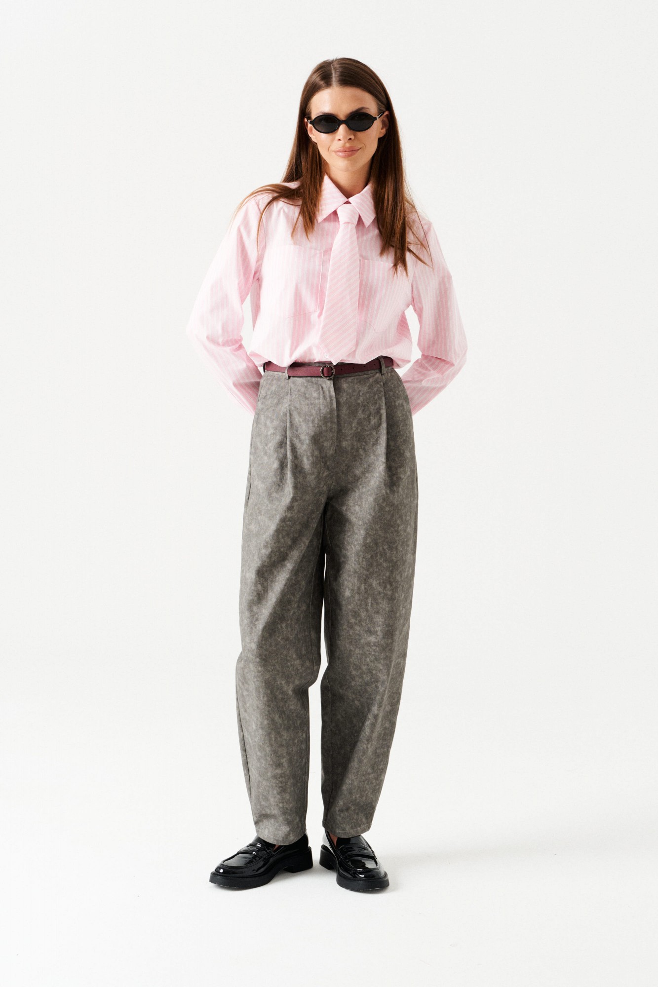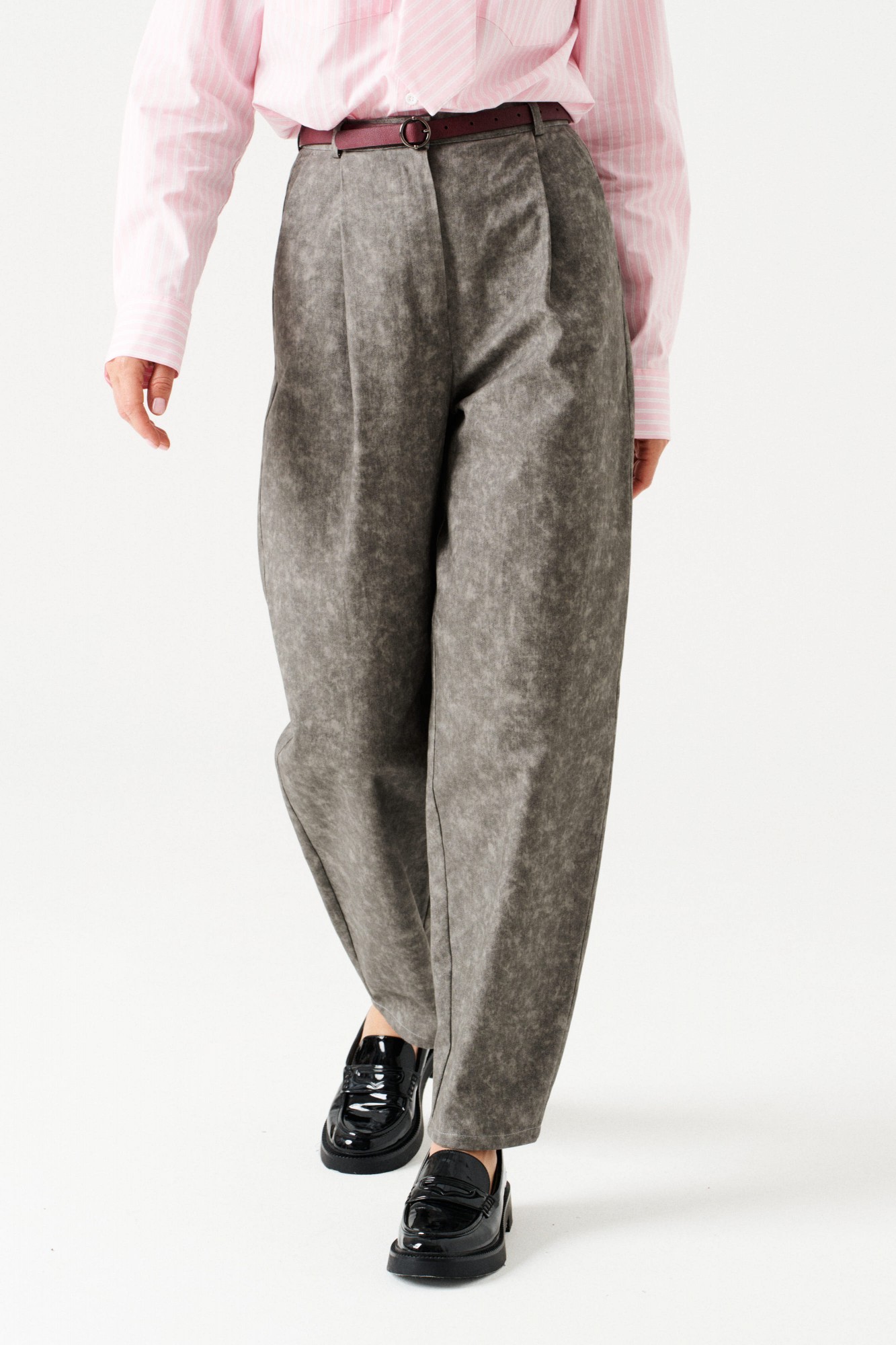 Брюки-бананы женские, свободные, слегка зауженные книзу. На передних половинках заложены складки, направленные в сторону боковых швов, боковые карманы с отрезным бочком. Застежка брюк – гульфик на молнии. На задних половинках таллиевые вытачки. Пояс притачной со шлевками, застегивается на пуговицу.