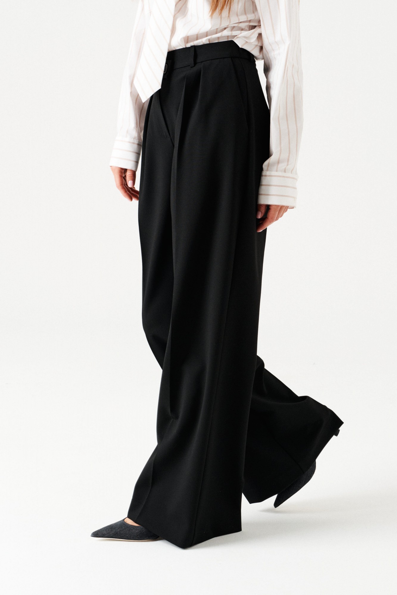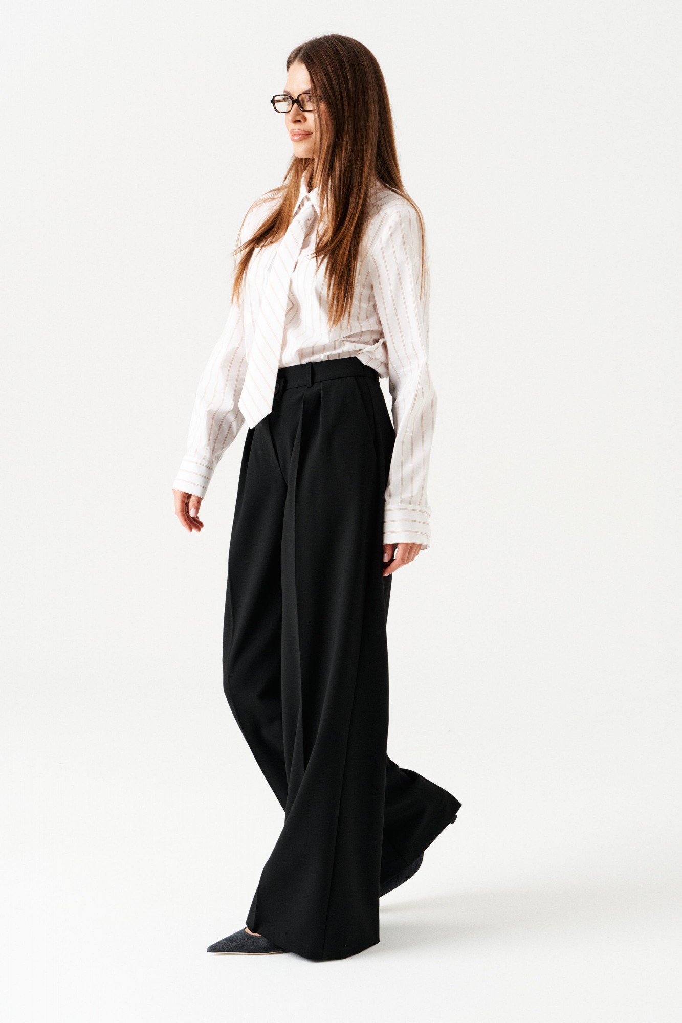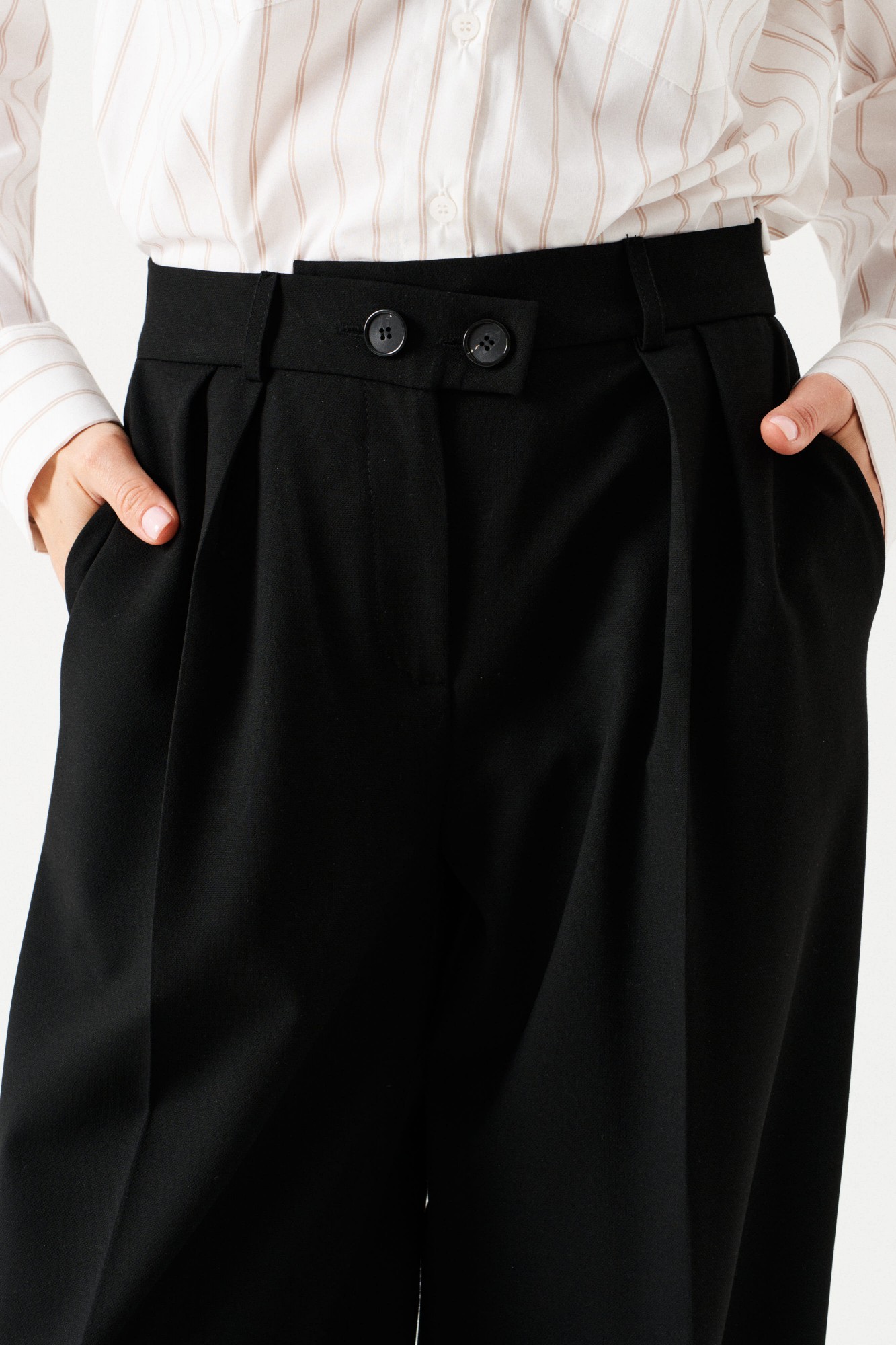 Брюки-палаццо, прямые, со смещенной застежкой. На передних половинках заложены по 2 складки, боковые карманы с отрезным бочком. Застежка брюк – гульфик на молнии. На задних половинках таллиевые вытачки. Пояс притачной, со шлевками и частично с резинкой, застегивается на 2 петли и 2 пуговицы.