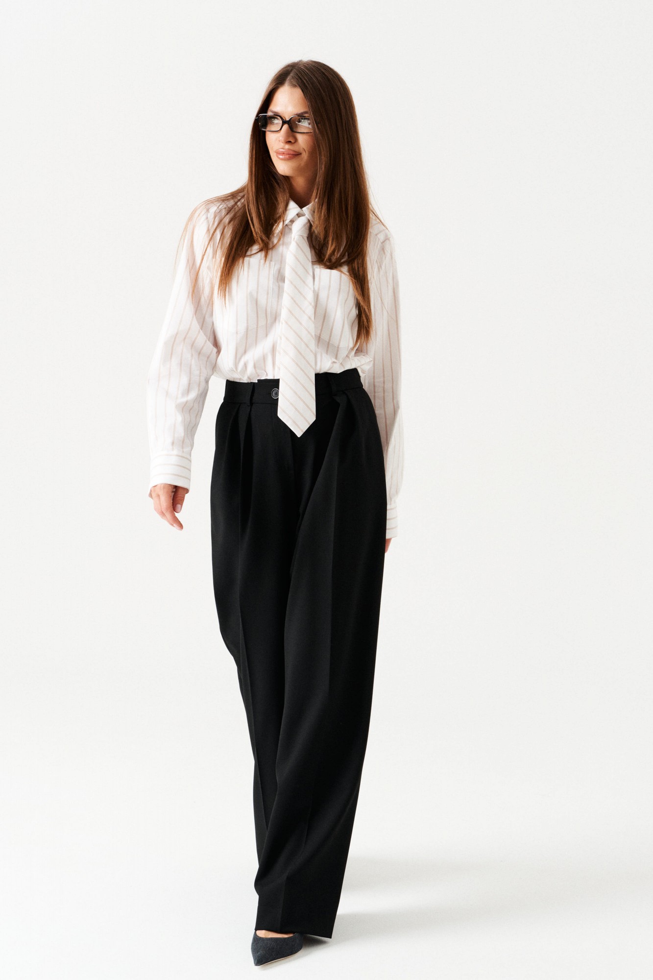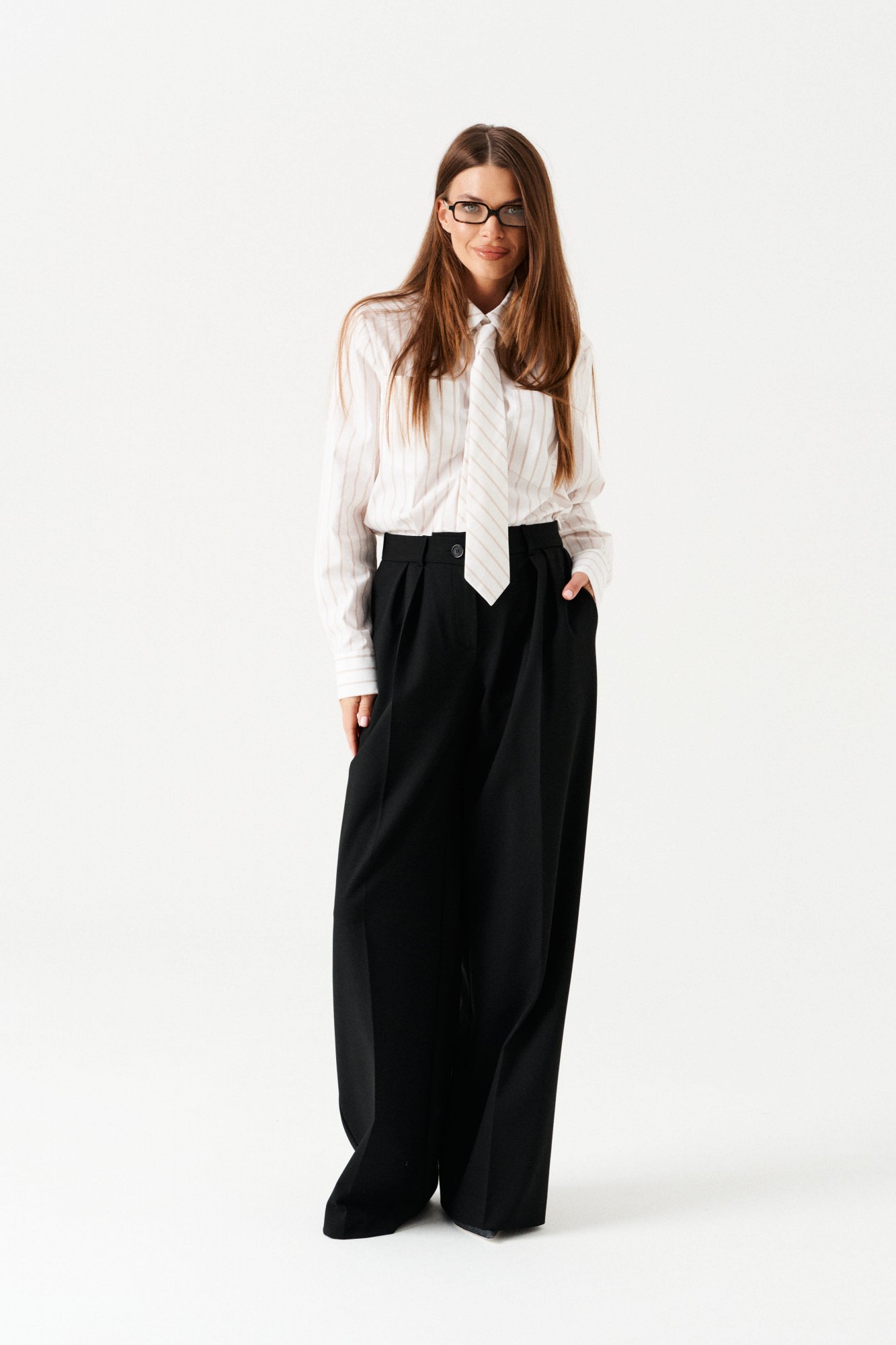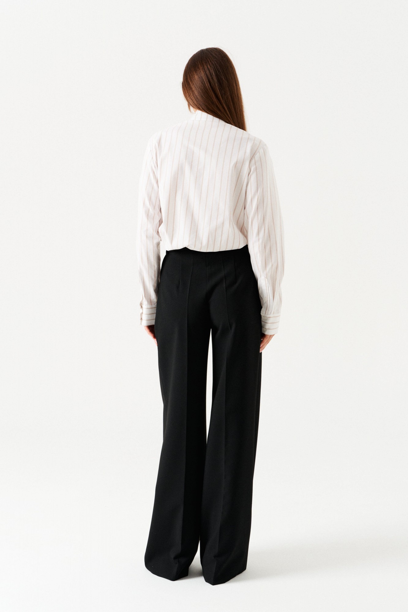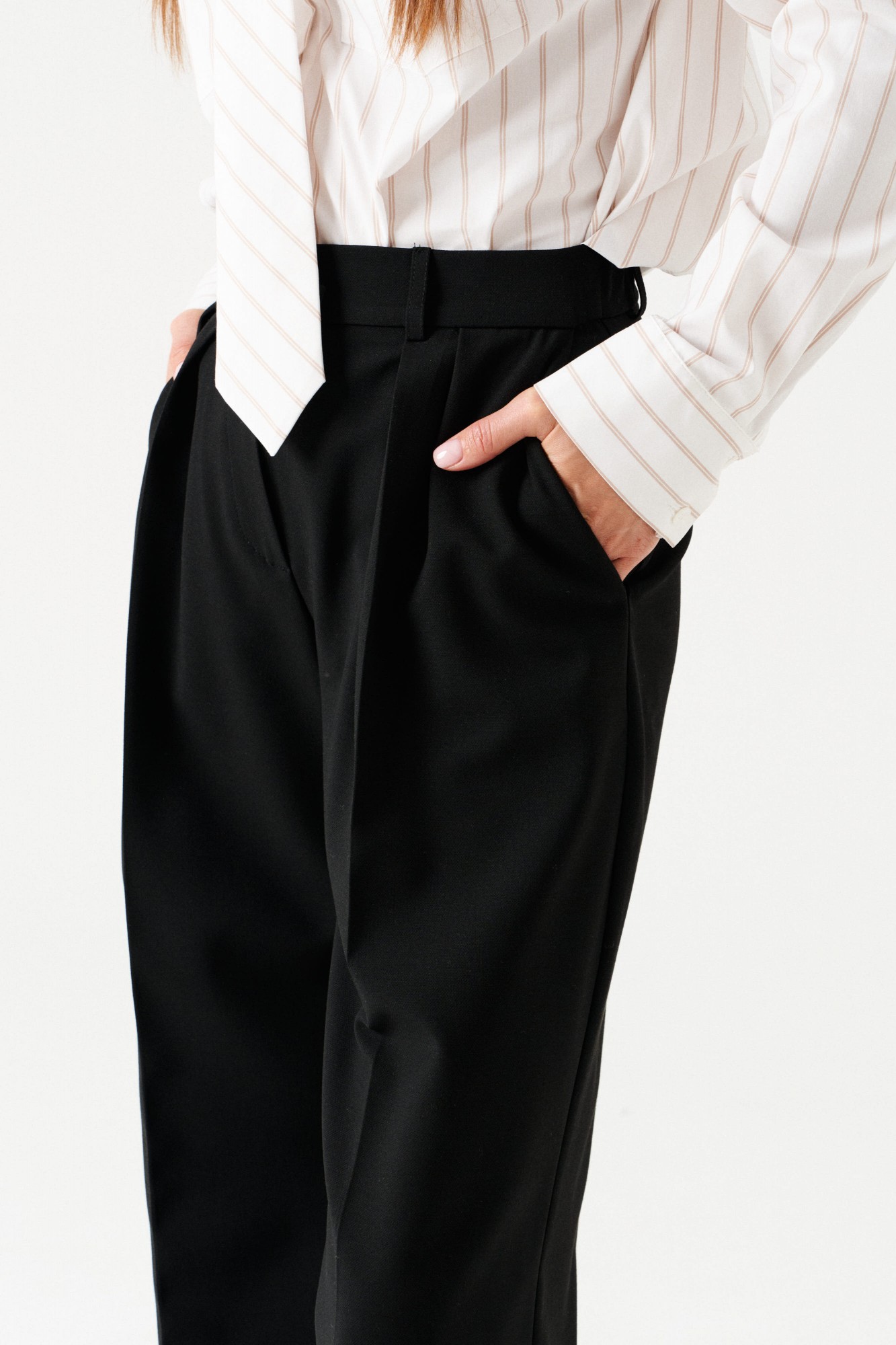 Брюки-палаццо, прямые, со смещенной застежкой. На передних половинках заложены по 2 складки, боковые карманы с отрезным бочком. Застежка брюк – гульфик на молнии. На задних половинках таллиевые вытачки. Пояс притачной, со шлевками и частично с резинкой, застегивается на 2 петли и 2 пуговицы.