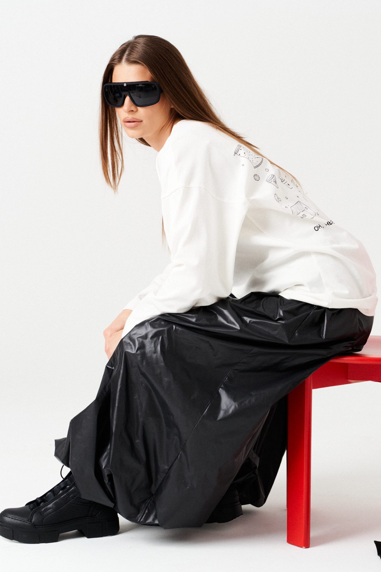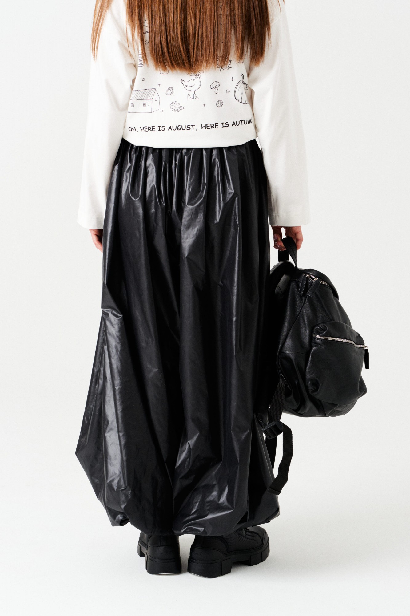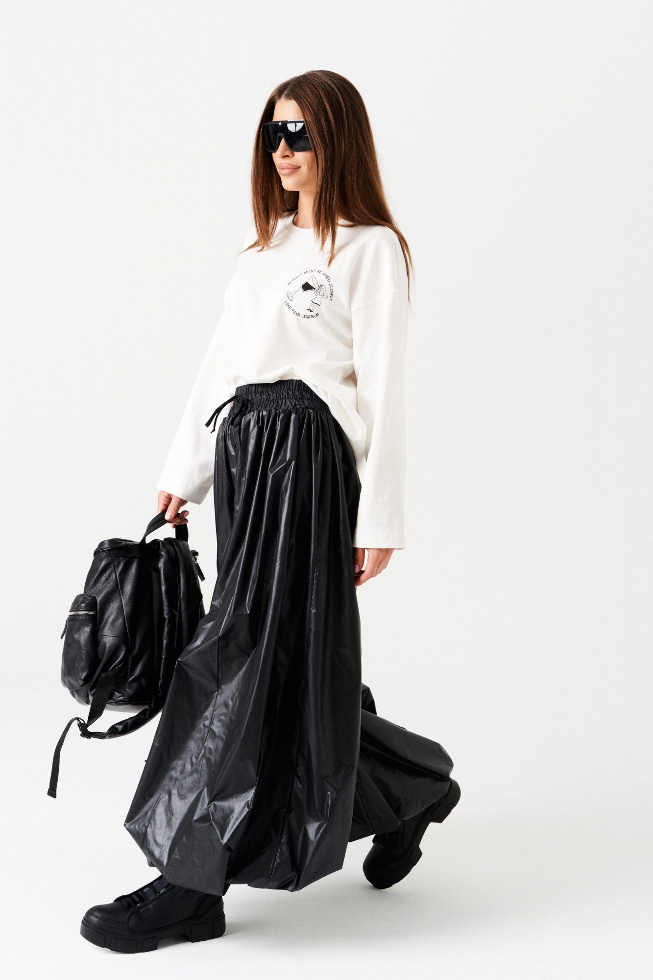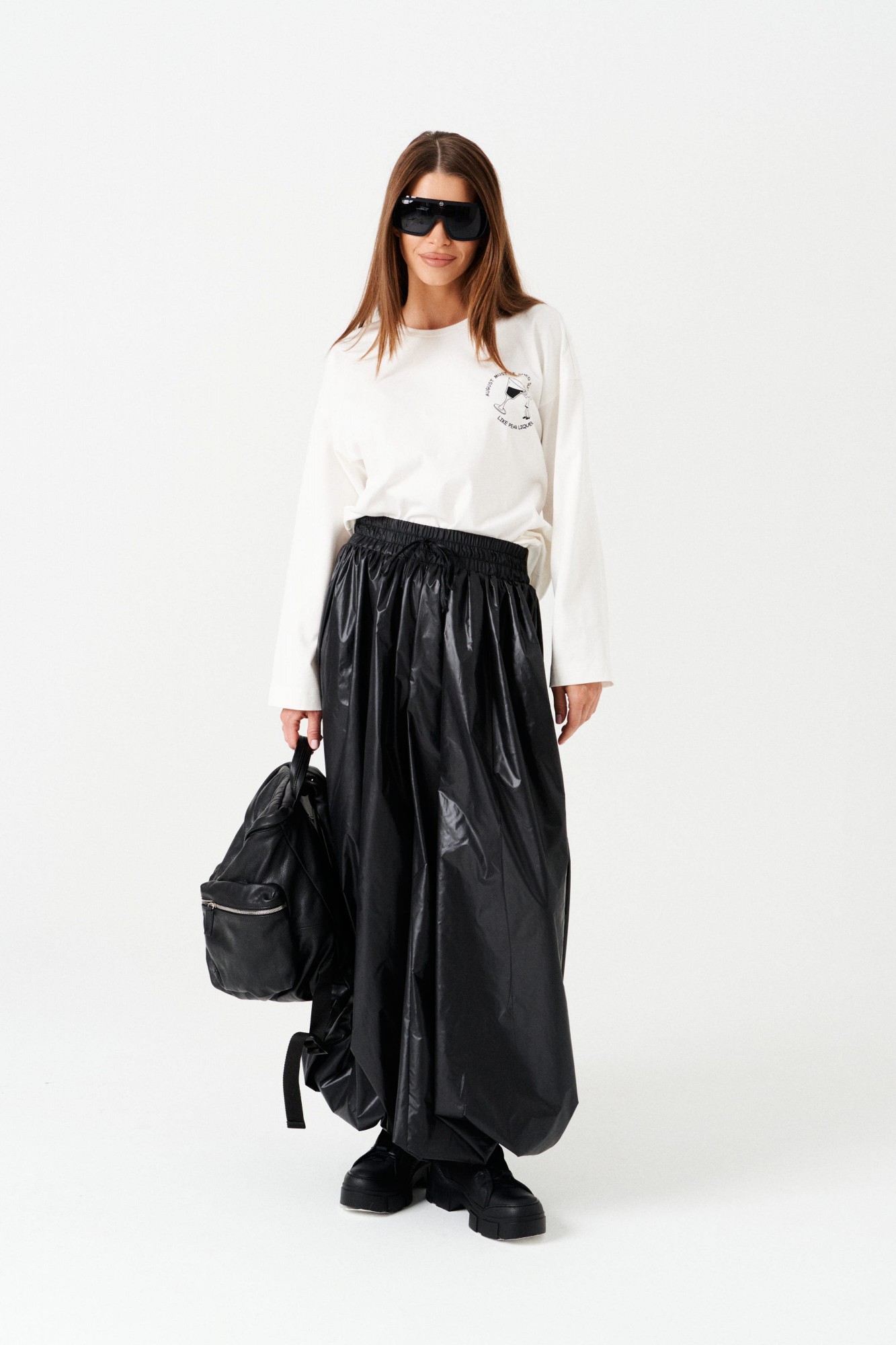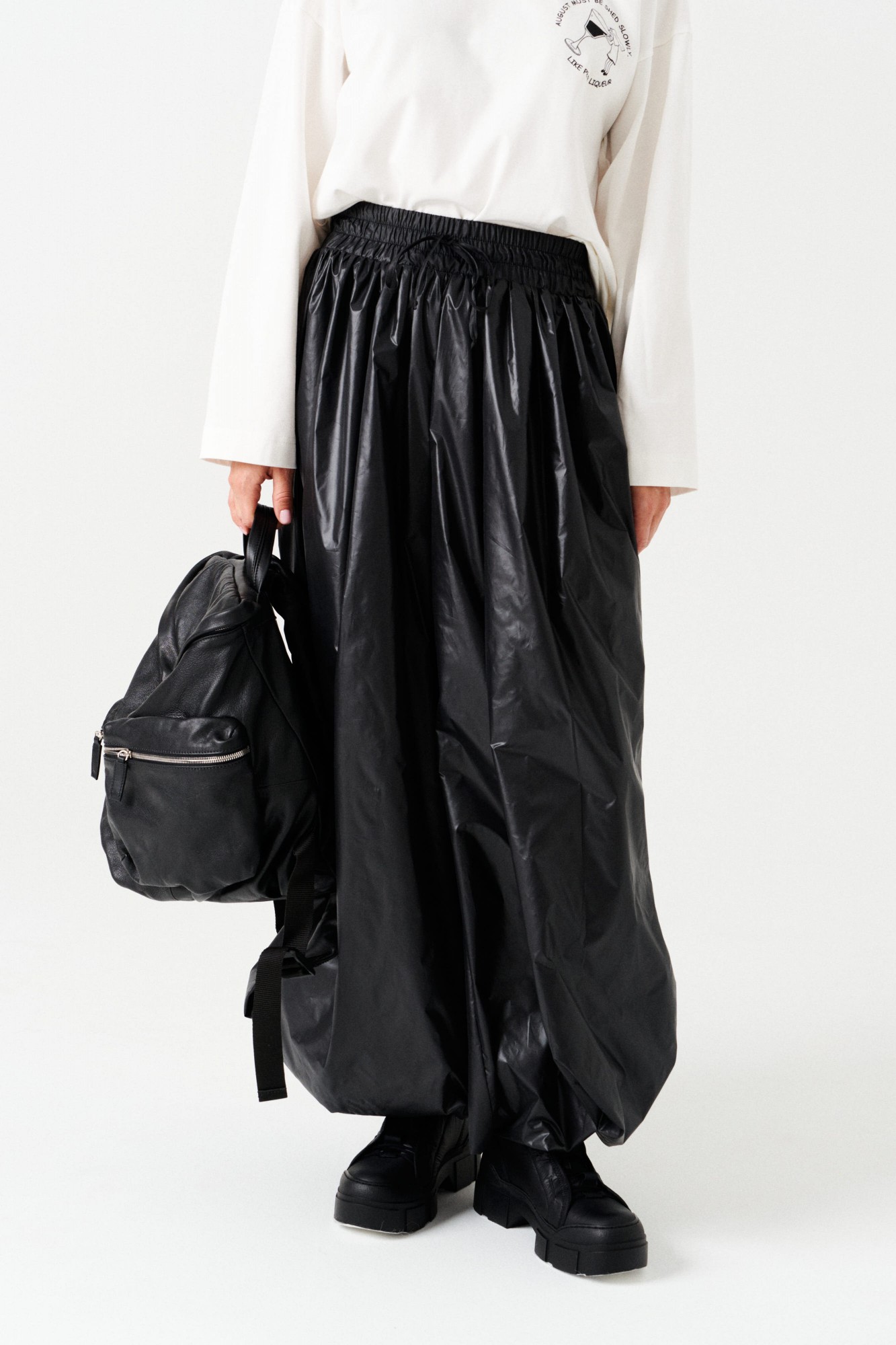 Брюки-джоггеры большого объема, со сборкой по верхнему и нижнему срезу, на притачной подкладке. Пояс на резинке с отделочными строчками, образующими кулису, в которую вставлен шнур-завязка. Низ брюк с сборкой на резинку. В боковых швах расположены карманы.