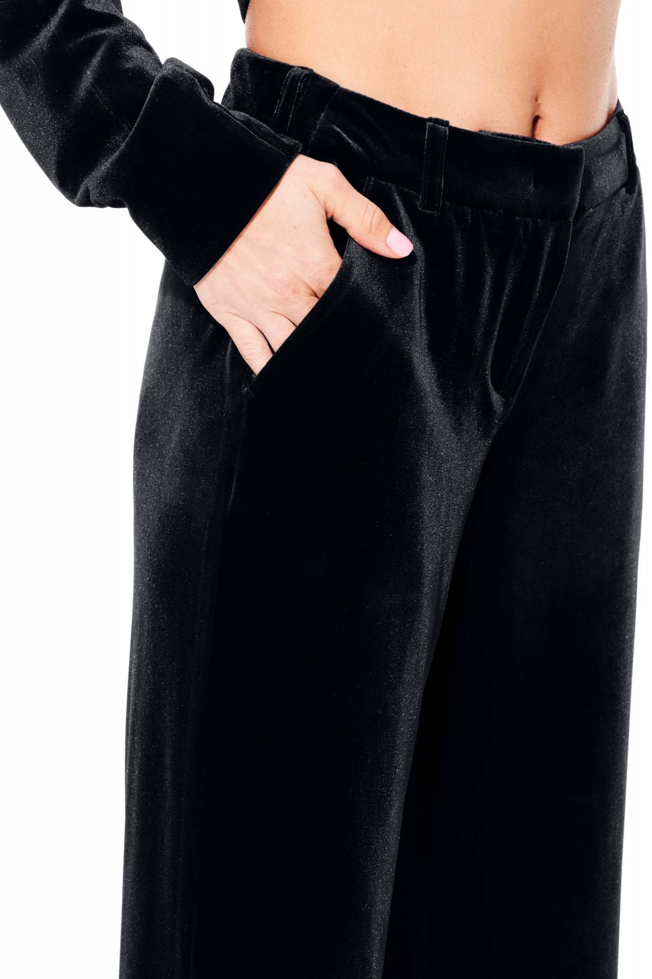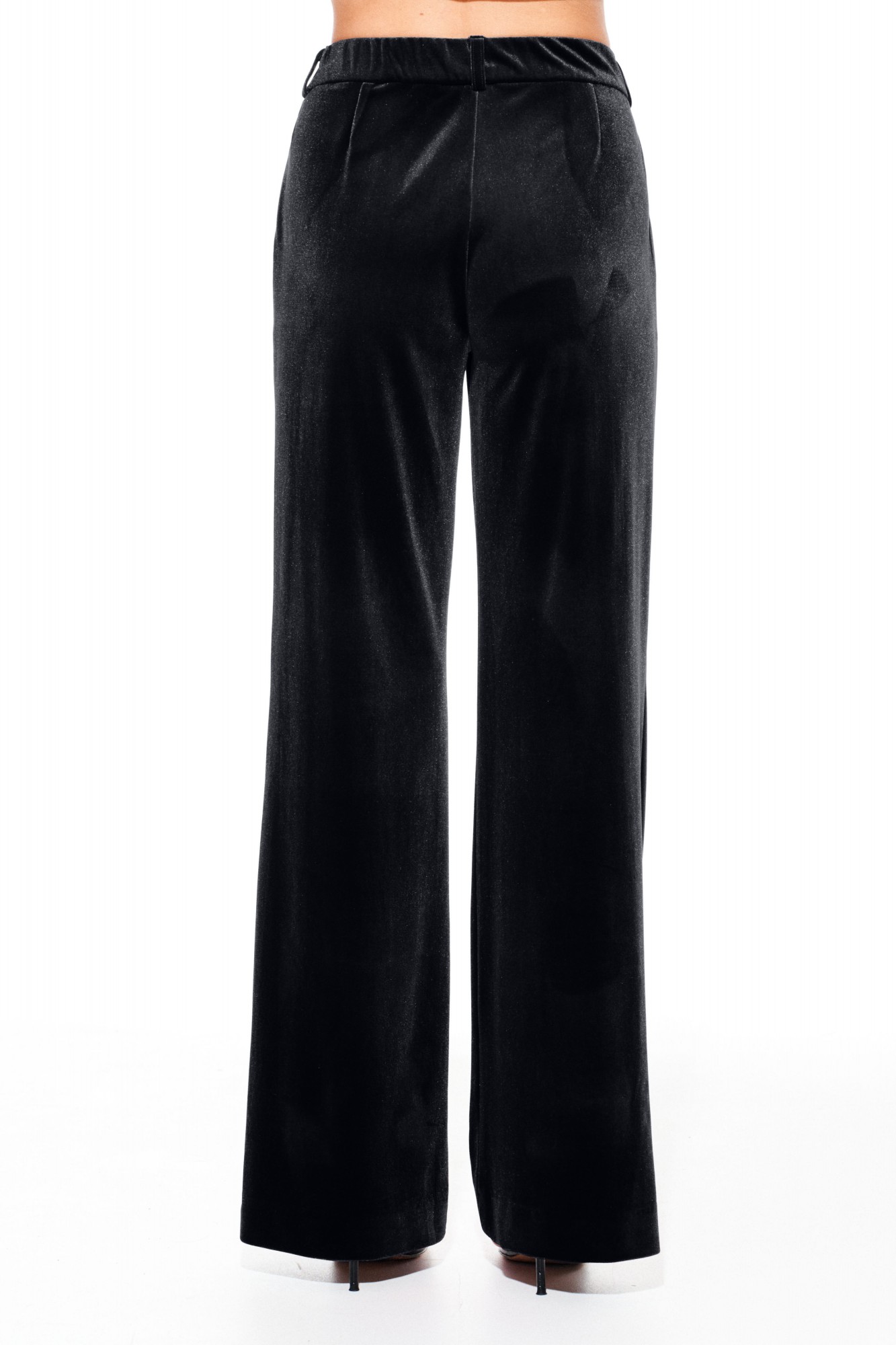 Брюки из бархата на трикотажной основе, умеренного объема, прямого силуэта. На передних половинках выполнены боковые карманы с отрезным бочком. Задние половинки с таллиевыми вытачками. Застежка – гульфик на молнии. Пояс притачной, с резинкой по спинке, шлевками, застежкой на крючок и потайную пуговицу.