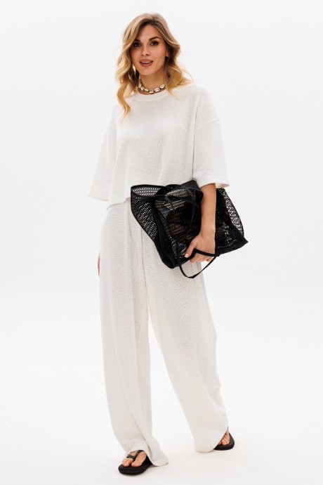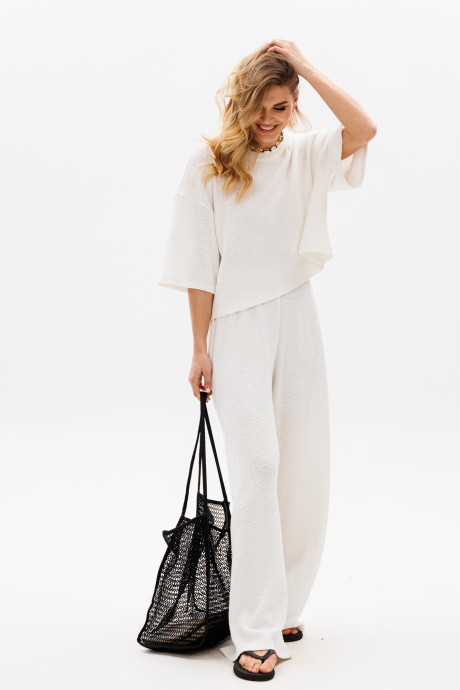 Брюки выполнены из трикотажного полотна. Брюки прямые, длиной в пол. Брюки на цельнокроеном поясе с эластичной тесьмой.