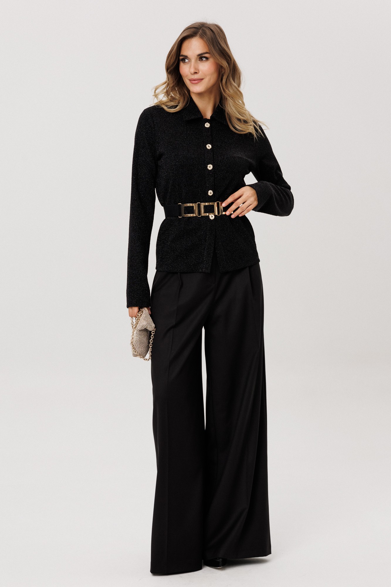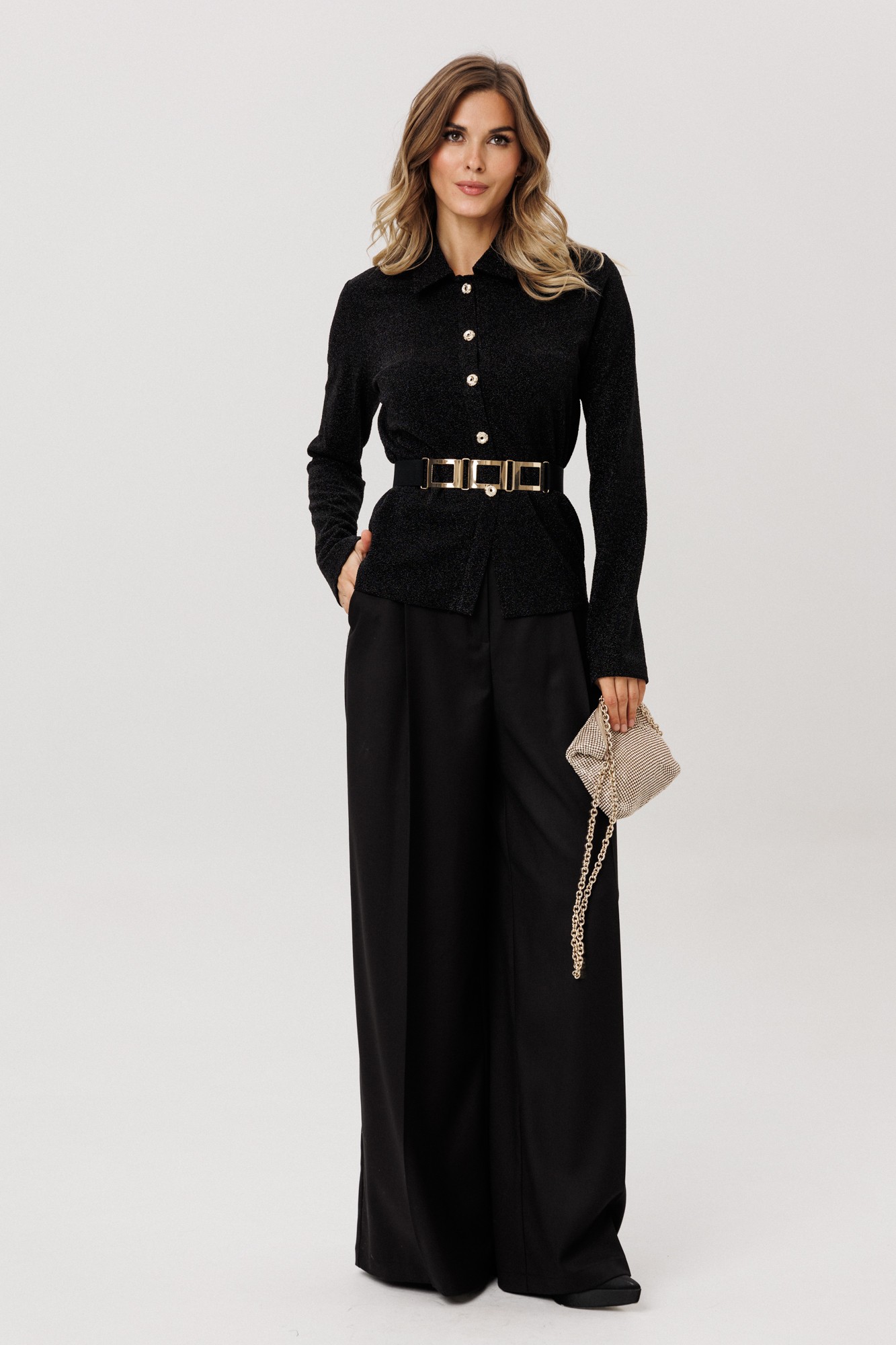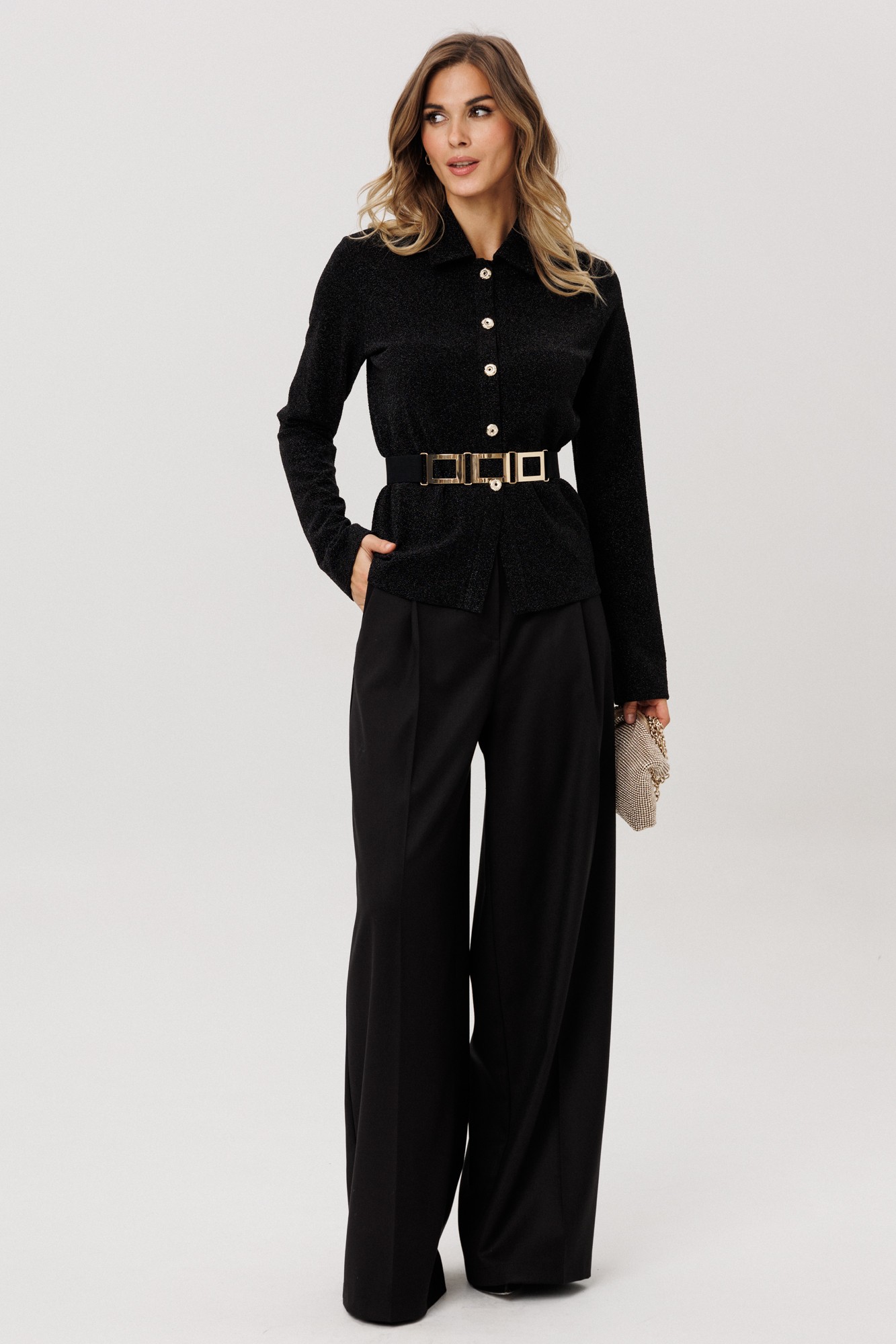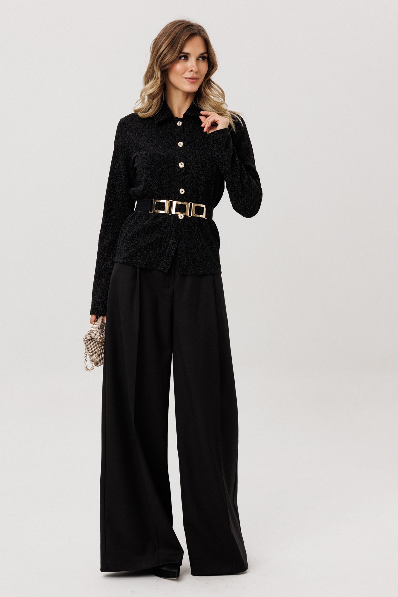 Брюки-палаццо выполнены из плательно-костюмной ткани. Брюки на притачном поясе, длиной в пол, расширенные к низу. Спереди складки и боковые карманы с наклонным входом. Застежка спереди на молнию с гульфиком и пуговицу. На задних частях обработаны таллиевые вытачки. Пояс в комплект НЕ ВХОДИТ!