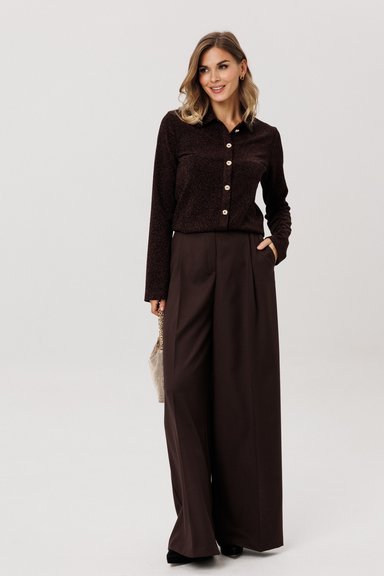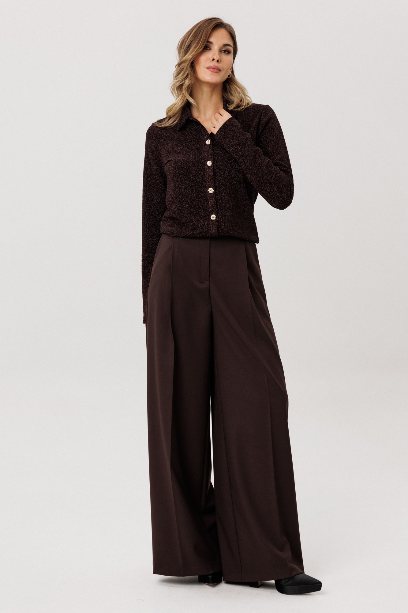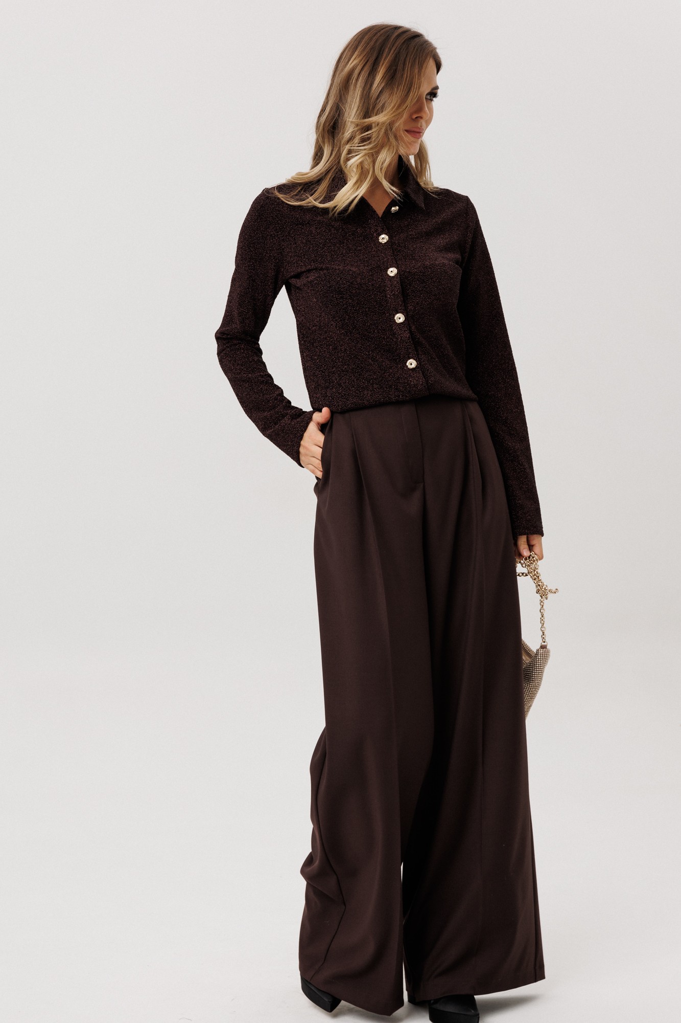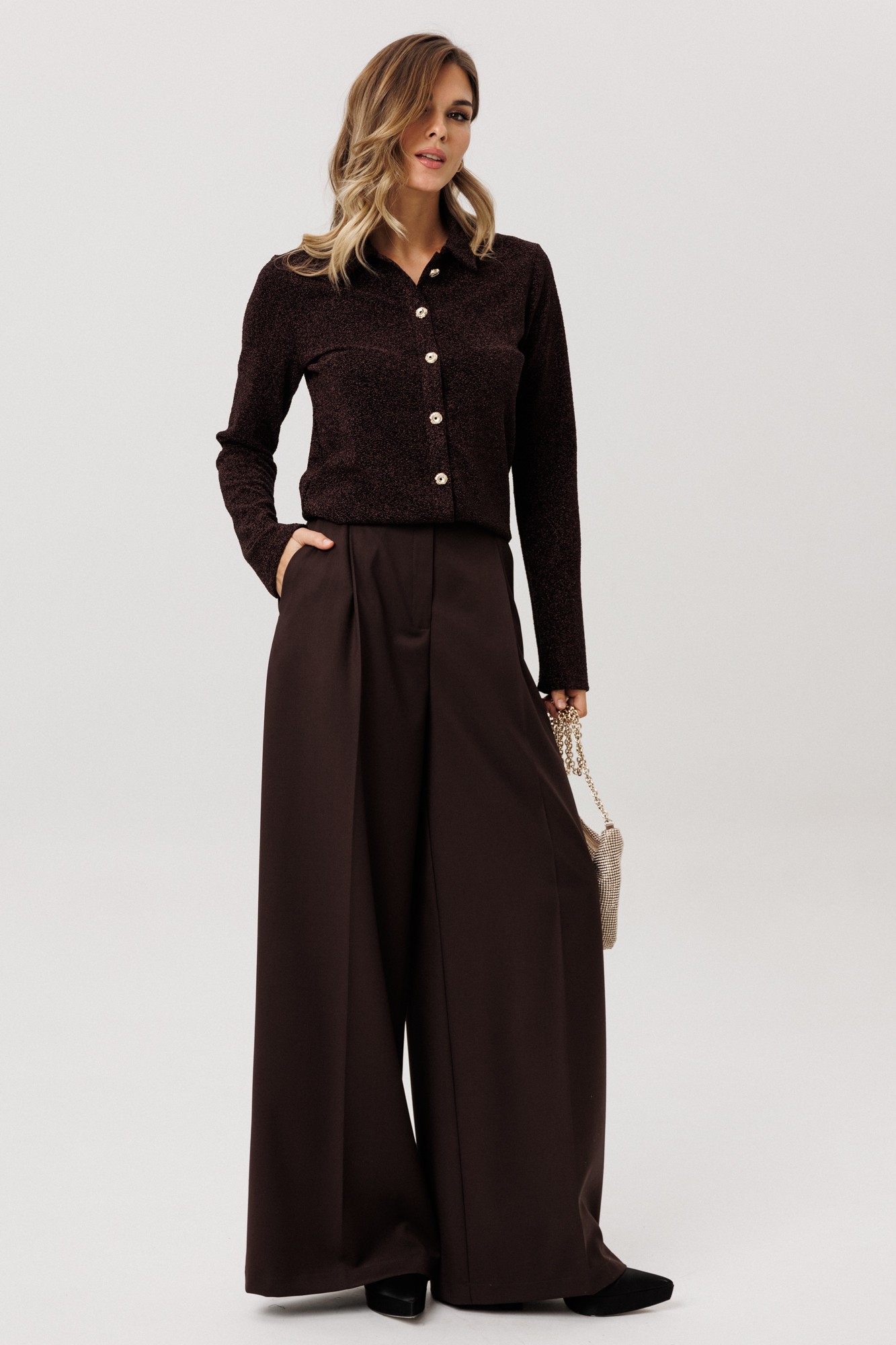 Брюки-палаццо выполнены из плательно-костюмной ткани. Брюки на притачном поясе, длиной в пол, расширенные к низу. Спереди складки и боковые карманы с наклонным входом. Застежка спереди на молнию с гульфиком и пуговицу. На задних частях обработаны таллиевые вытачки. Пояс в комплект НЕ ВХОДИТ!