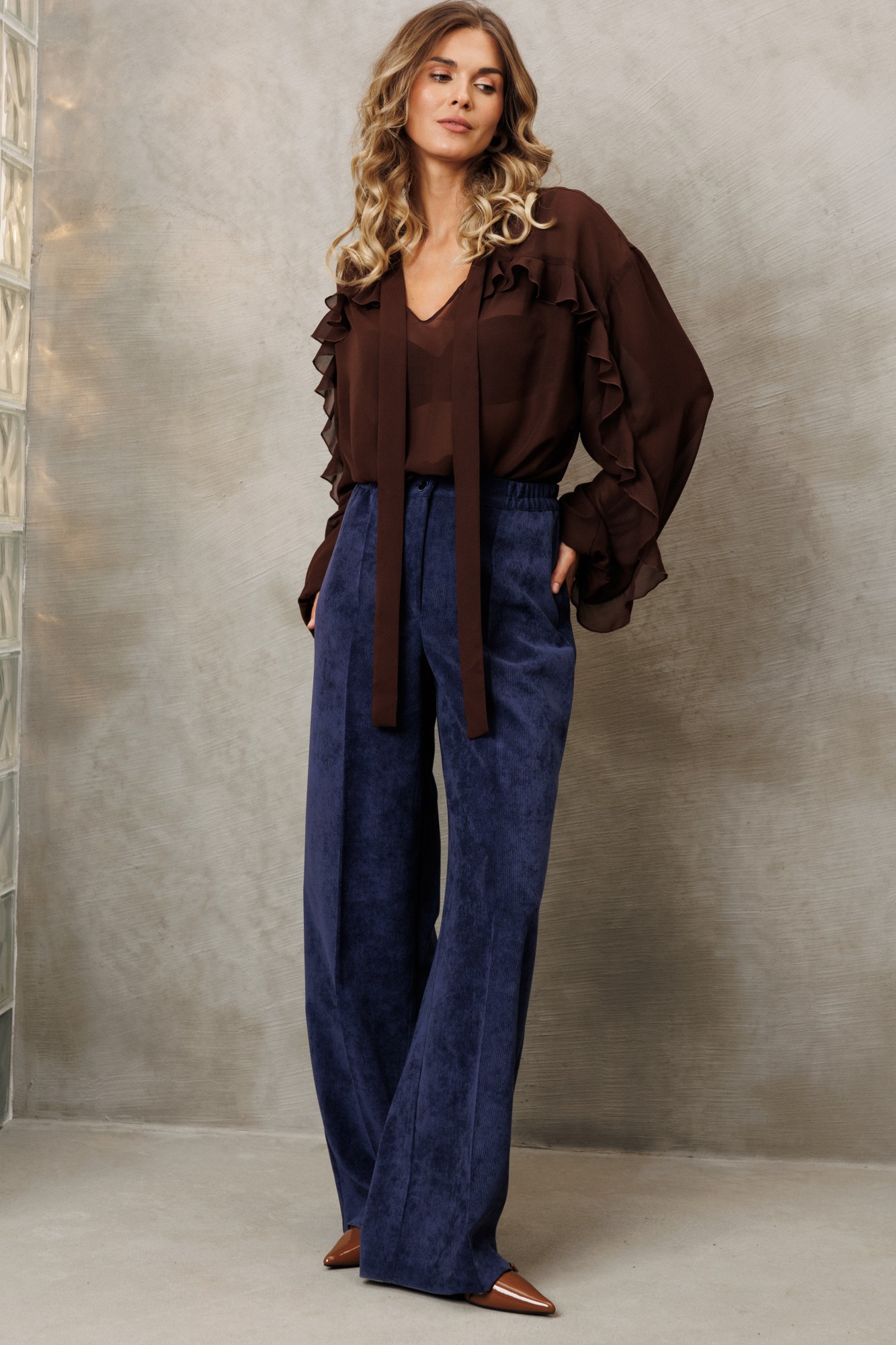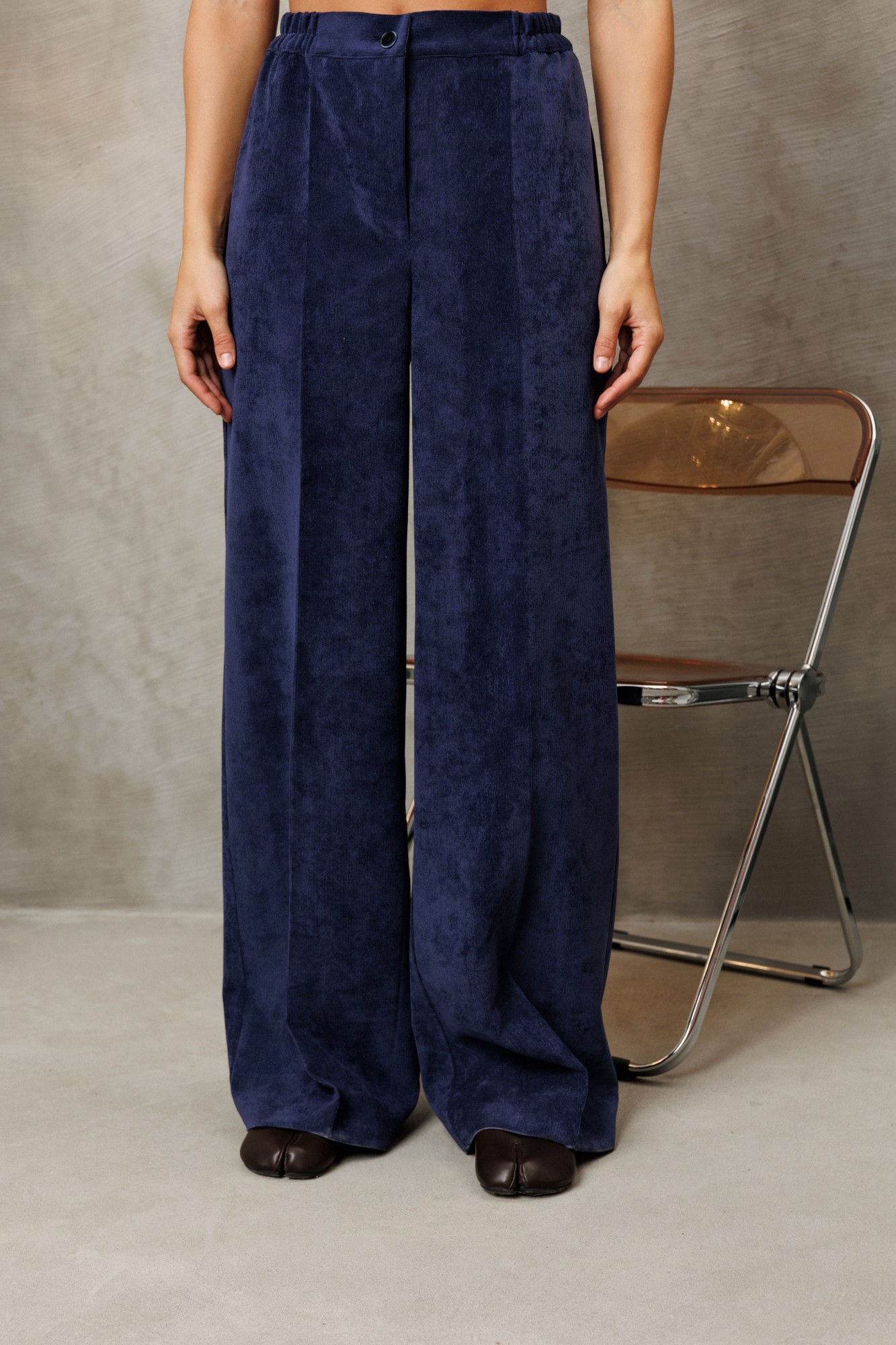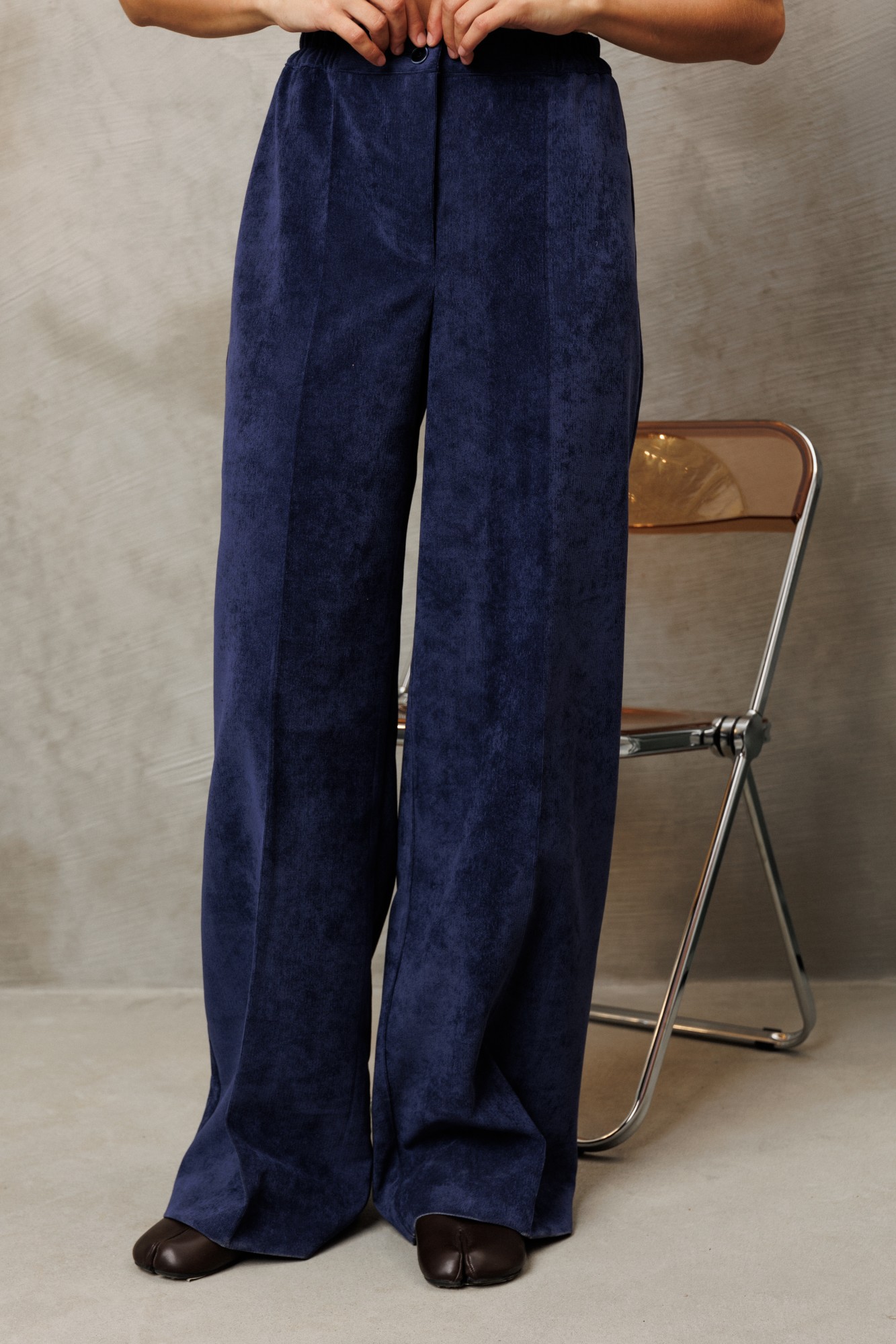 Брюки палаццо с притачным поясом из мягкой вельветовой ткани. Спереди застежка гульфик на молнии и петлей и пуговицей по поясу. По задней частям брюк вытачки. Пояс с резинкой в боковых частях. Брюки с заутюженными стрелками.