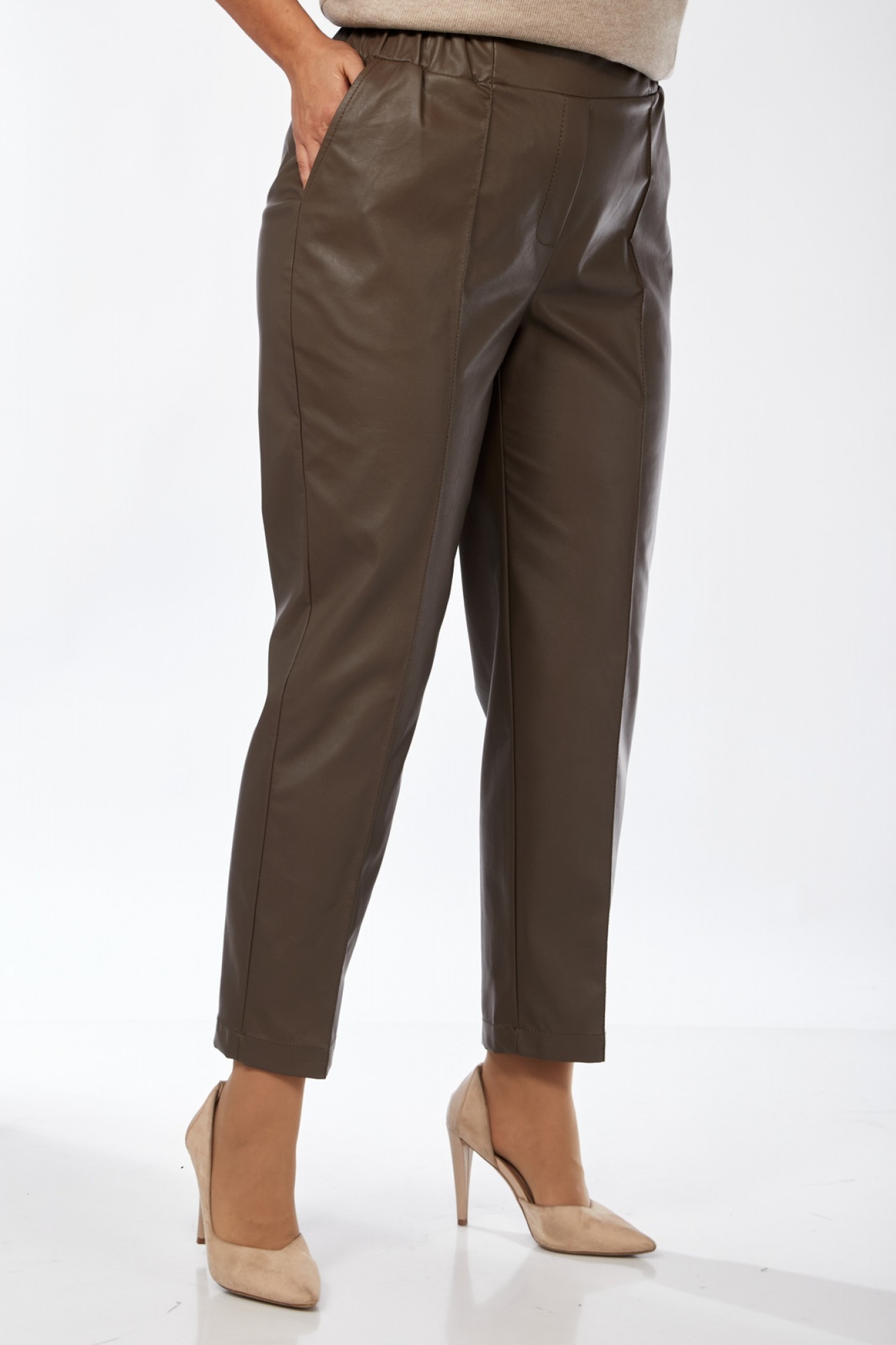 Брюки женские, классической посадки, немного заужены к низу, выполнены из экокожи. По передним деталям брюк обработаны карманы с подрезным бочком и застрочены стрелки. Пояс притачной на эластичной тесьме.