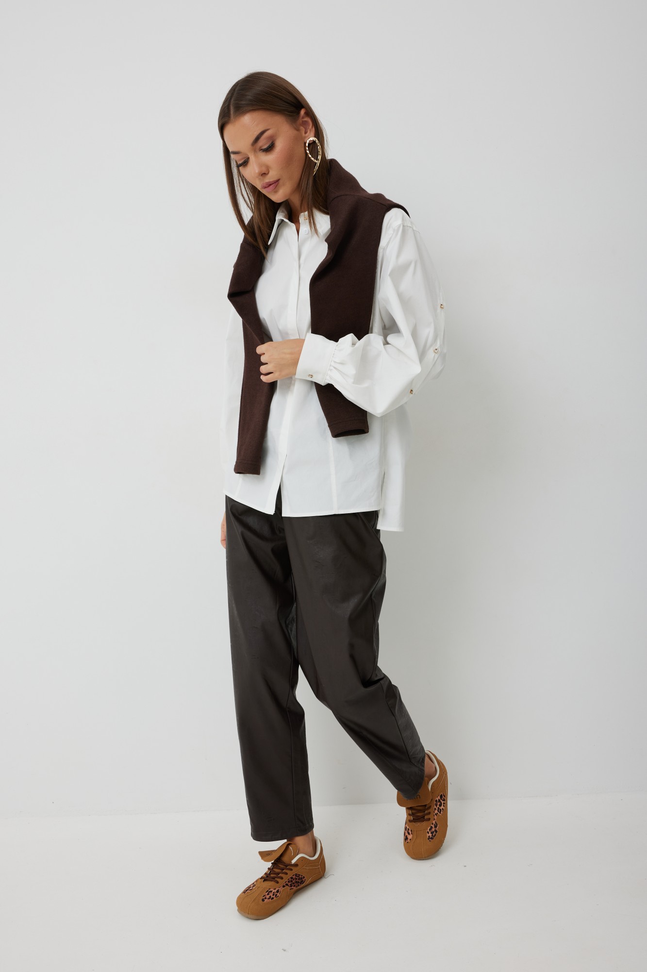 Брюки женские из искусственной кожи зауженные к низу. На передних частях брюк обработаны карманы с отрезным бочком и застрочены складки. По концам кармана установлены хольнитены. По спинке брюк накладные карманы с хольнитенами на концах и отрезной кокеткой. Верхний срез брюк обработан отрезным поясом со шлевками. Брюки застегиваются по переду на «молнию» в гульфике и кнопку по поясу.