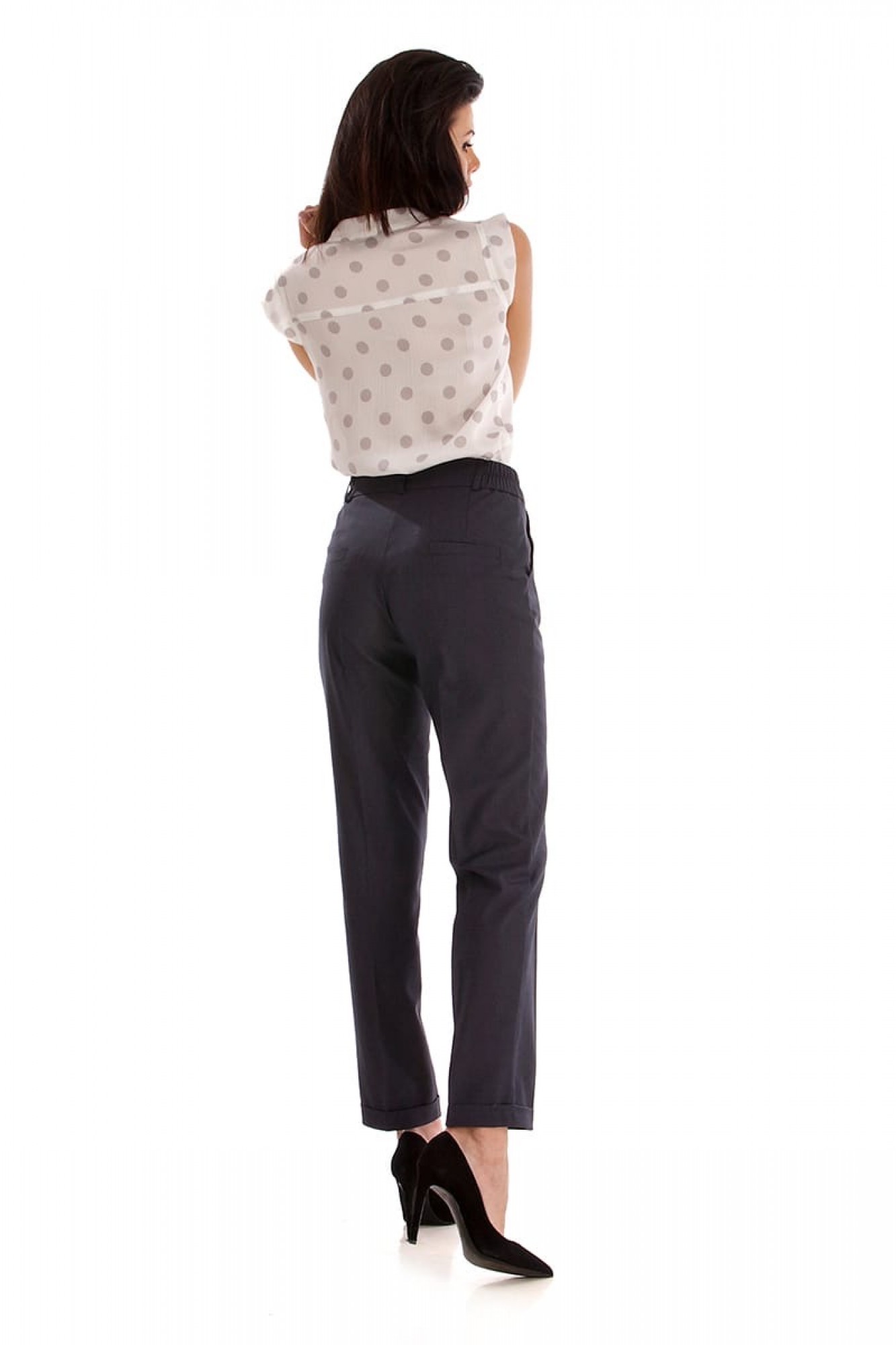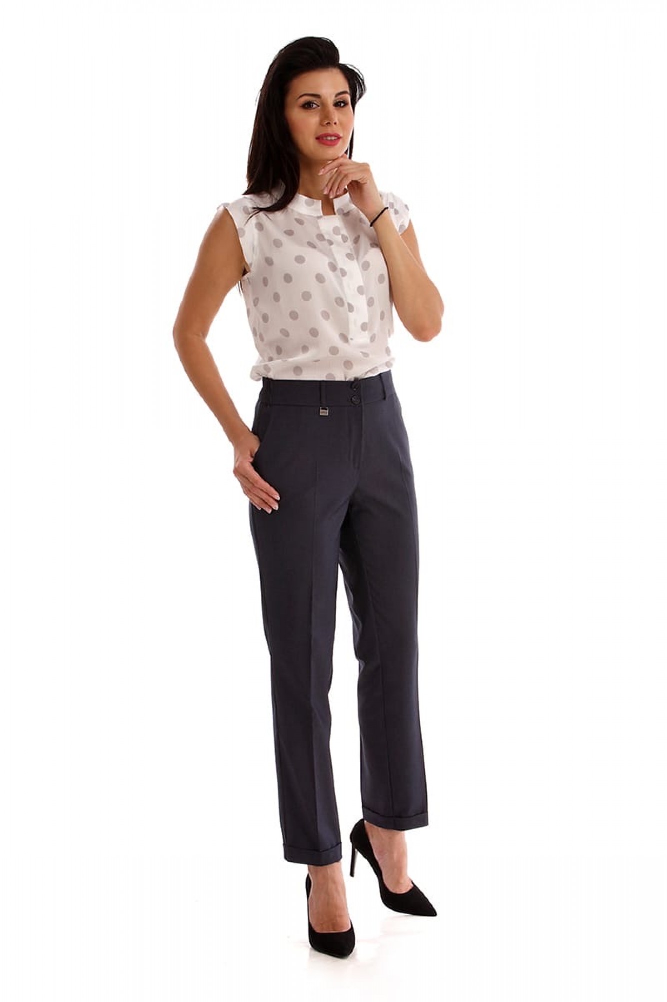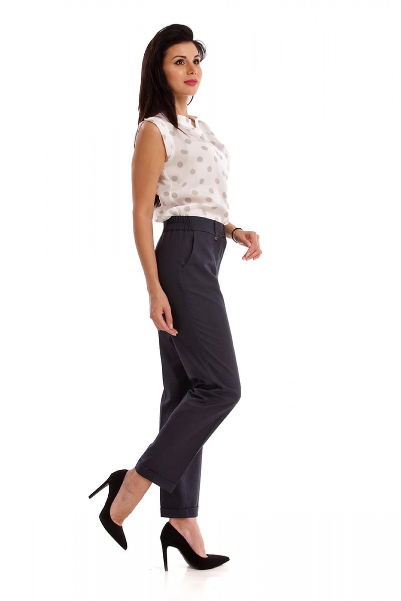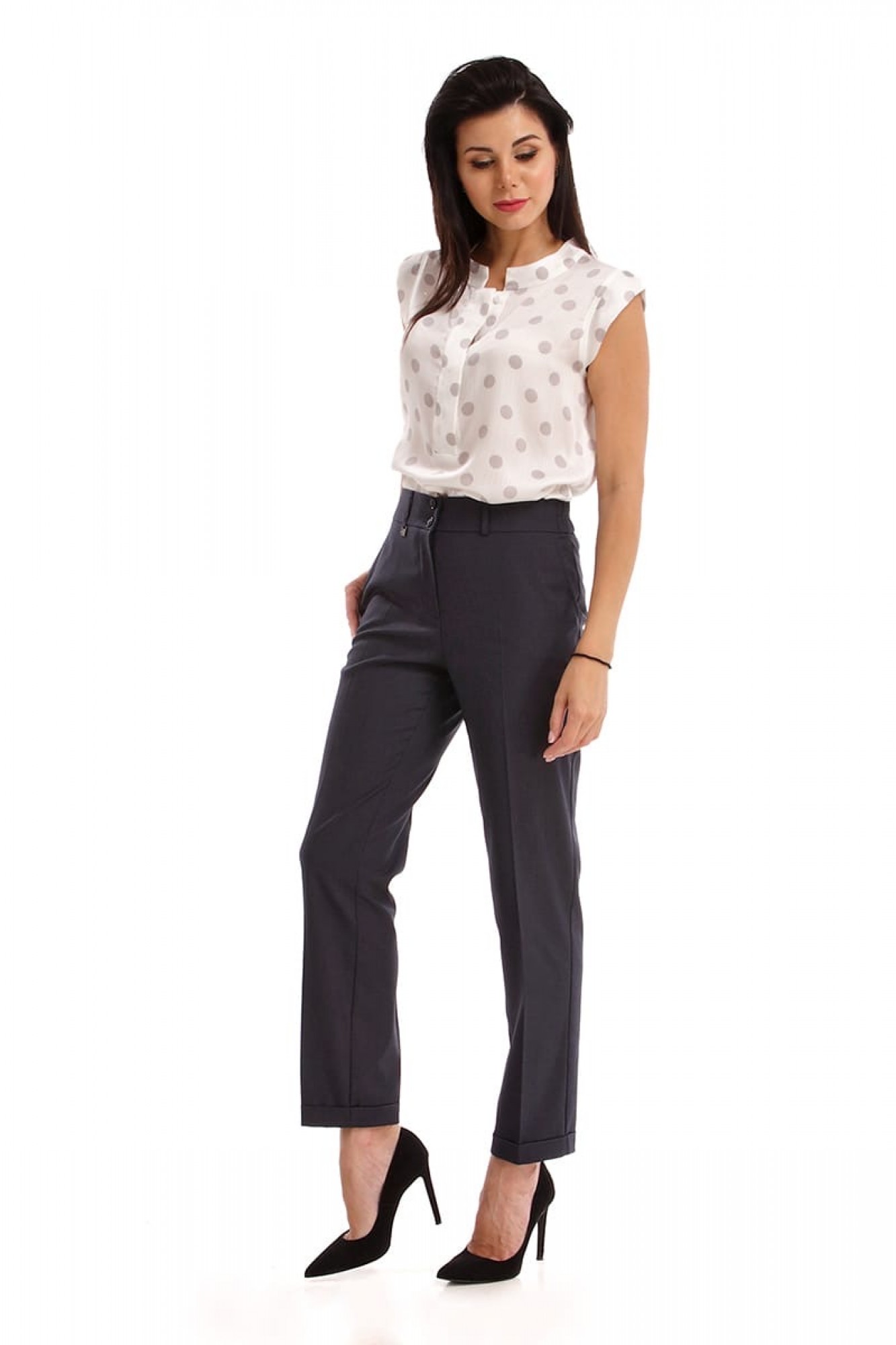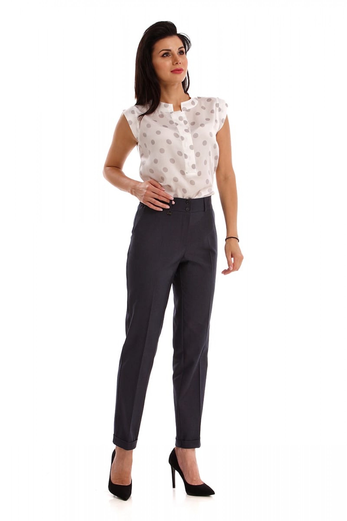 Брюки женские, заужены к низу. Посадка брюк высокая, пояс обработан с резинкой по бокам, низ брюк заканчивается манжетами. Застежка петля, пуговица, молния. По передним частям выполнены боковые карманы с прорезными бочками, по спинке талиевые вытачки с карманами имитацией и планками. Ткань достаточно хорошо тянется. Бережная стирка при 30 градусах!