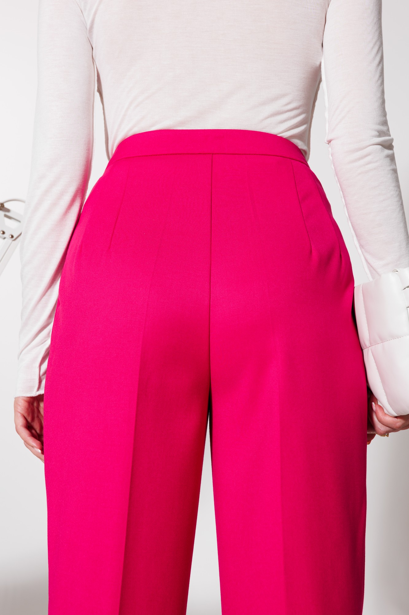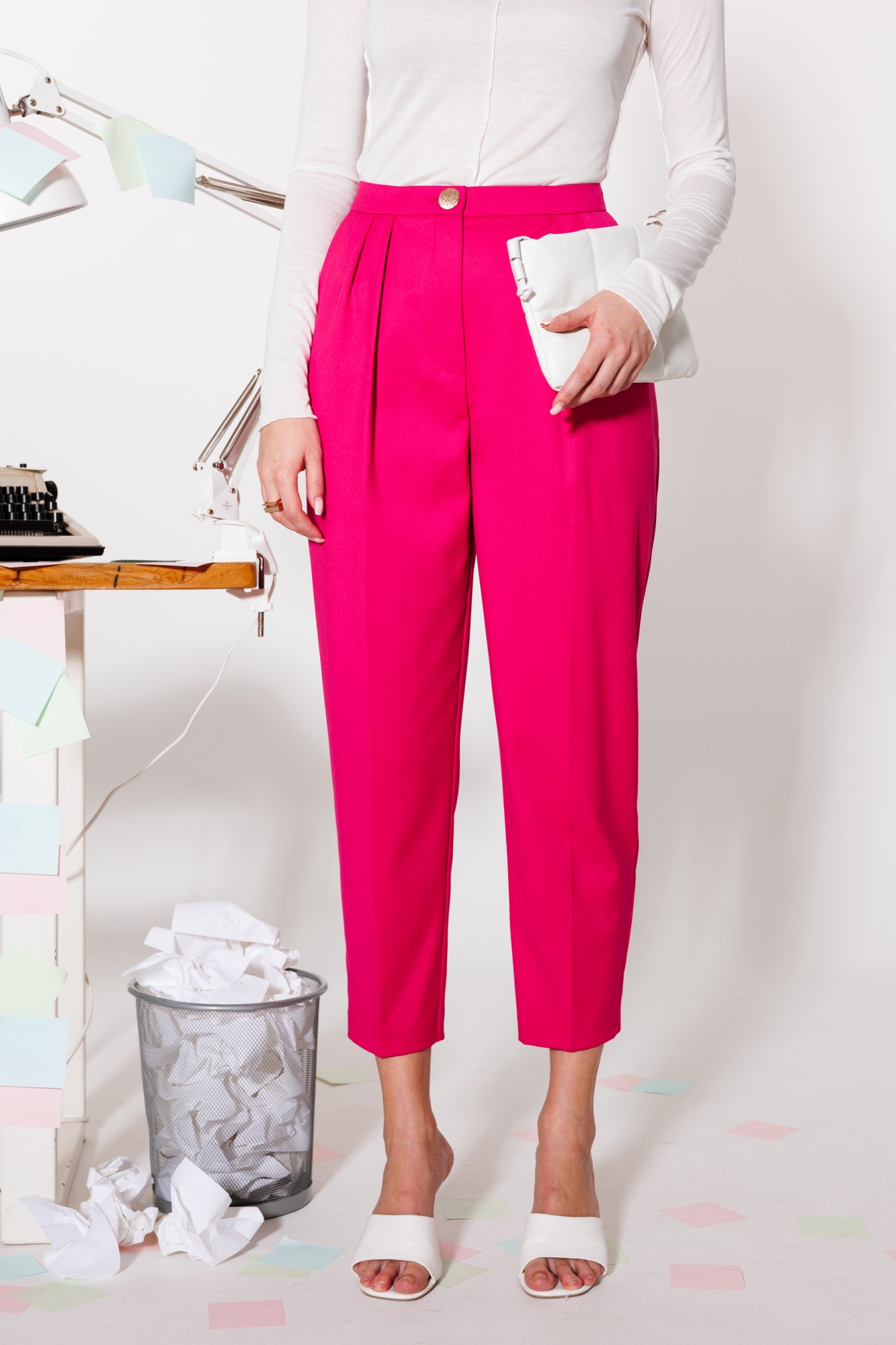 Брюки-бестселлер — зауженные, со стрелками, задающими четкую вертикальную линию, универсальной укороченной длины. Выполнены из смесовой костюмной вискозы с гладкой фактурой. Такую модель можно стилизовать как для вечера, так и для повседневных образов — с изящными босоножками на каблуке или туфлями на плоской подошве.