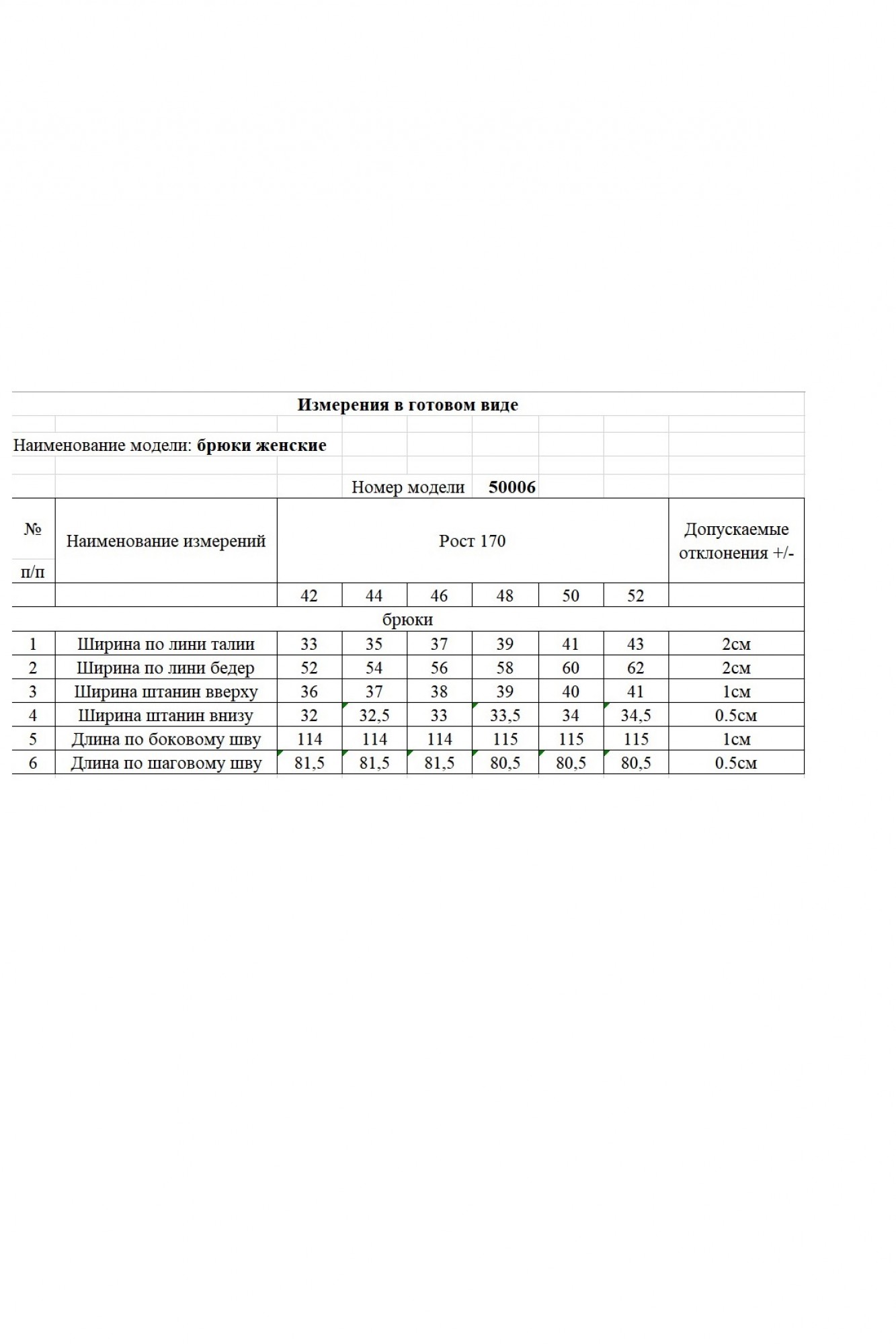 Таблица размеров