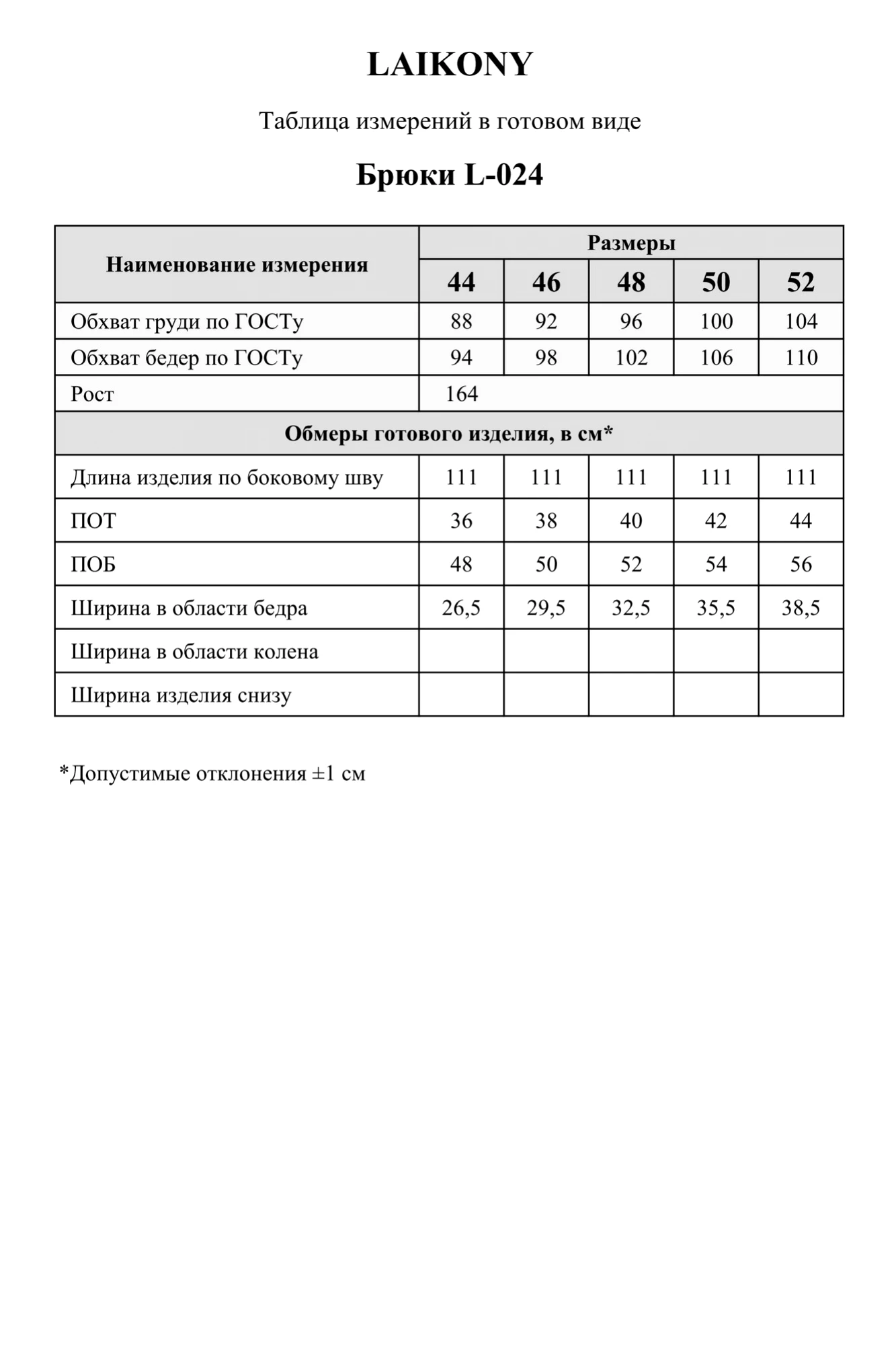 Таблица размеров
