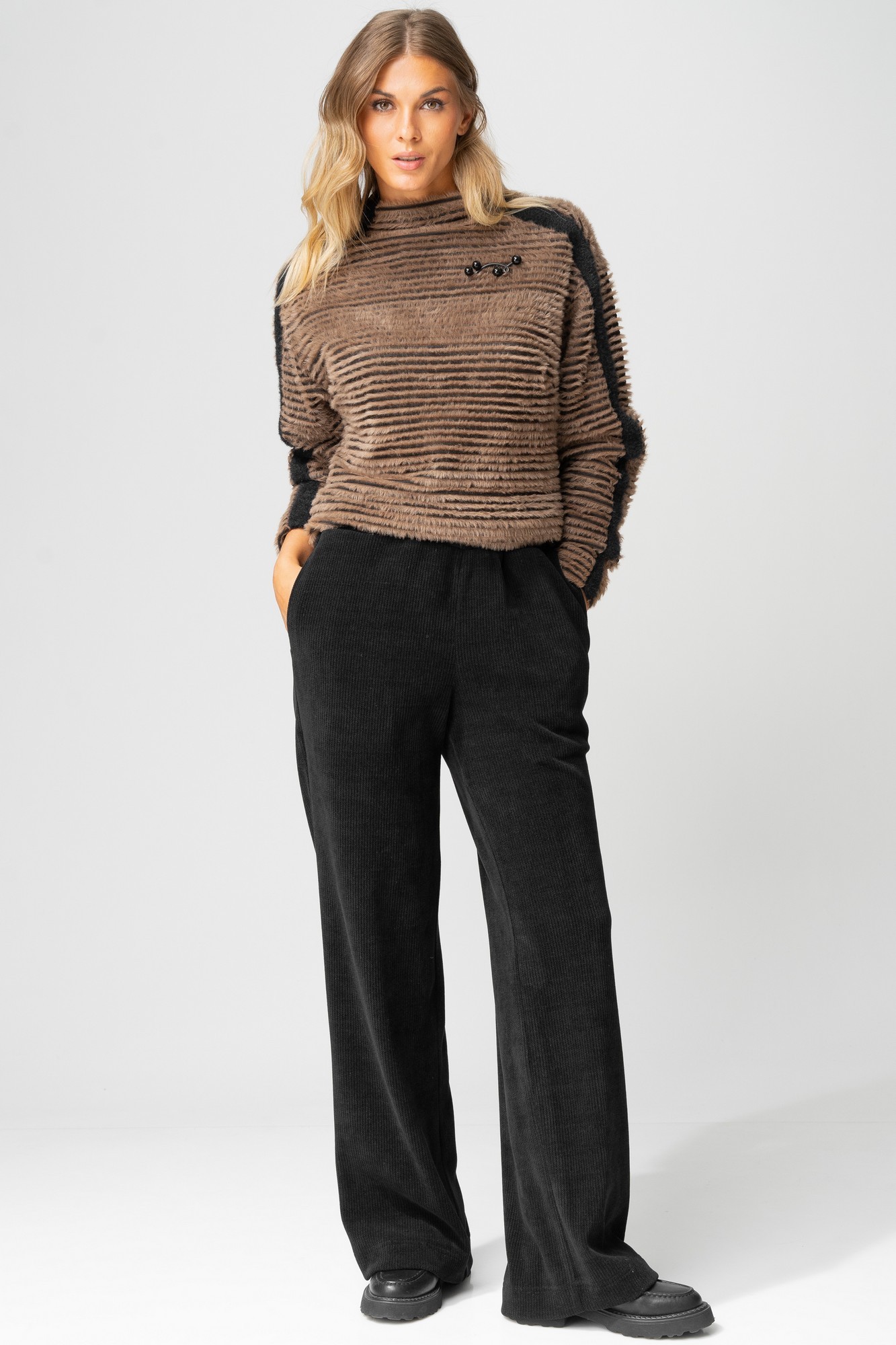 Брюки от LAIKONY из модного трикотажного вельвета. Брюки на талии, плотно облегающие вверху и прямые к низу. Пояс притачной, в пояс вставлена эластичная тесьма. На передних половинках брюк застрочены стрелки, в боковых швах обработаны карманы. Мягкий и пластичный трикотажный вельвет хорошо тянется в двух направлениях, малосминаем, средней плотности. Наши модные брюки идеально подойдут как к повседневному, так и праздничному образу. Идеально сочетается с нашими джемперами L-104, L-583 и L-642-1, а также входит в состав комплекта L-693.