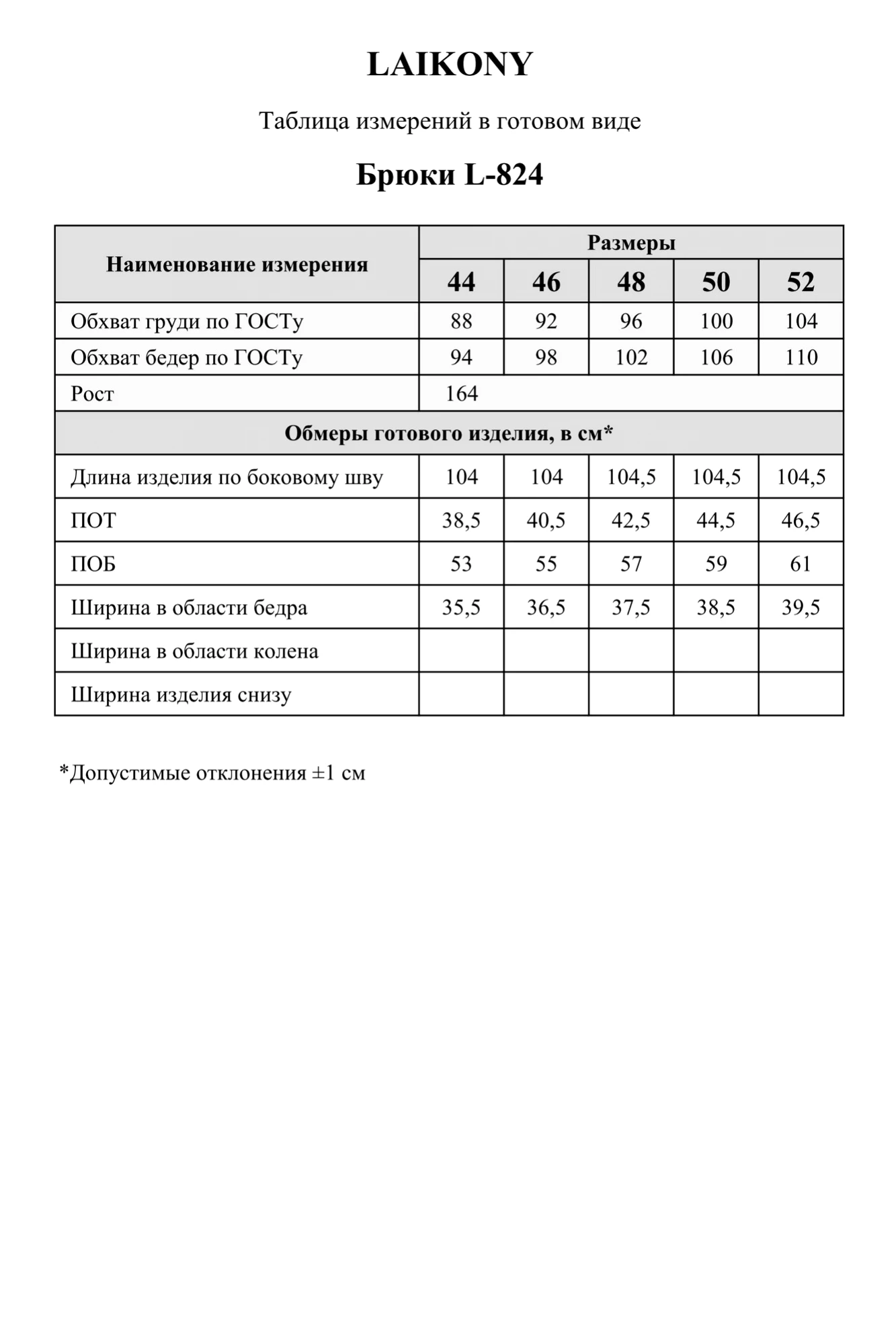 Таблица размеров
