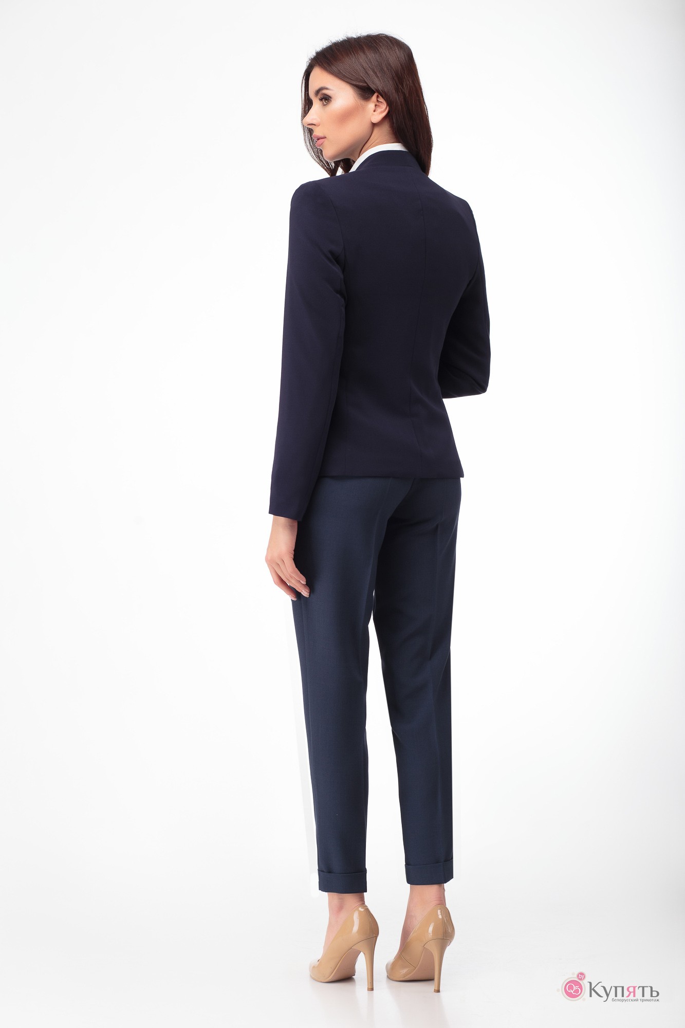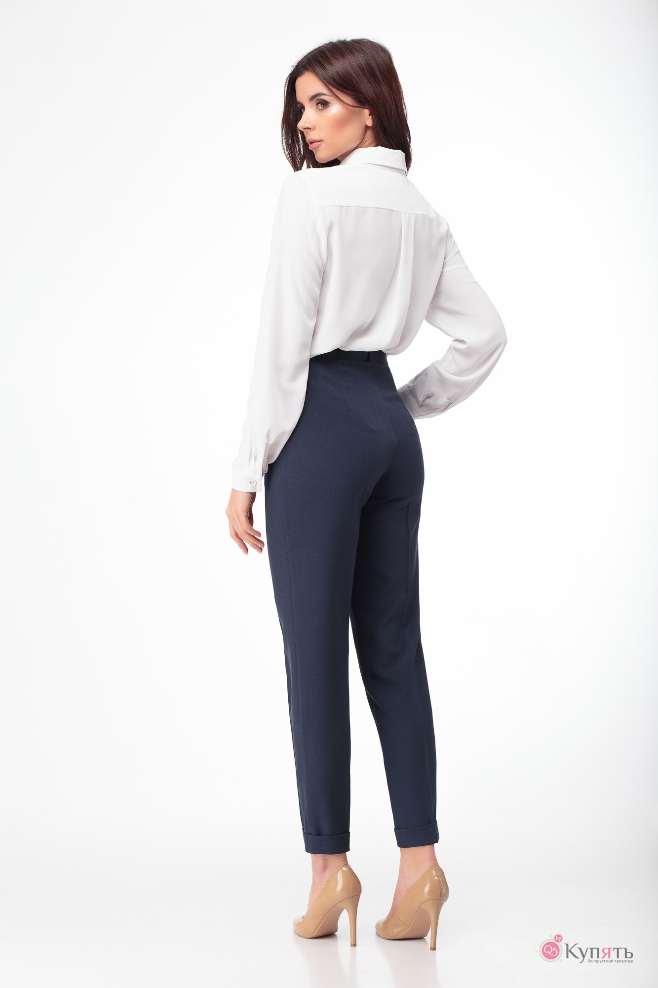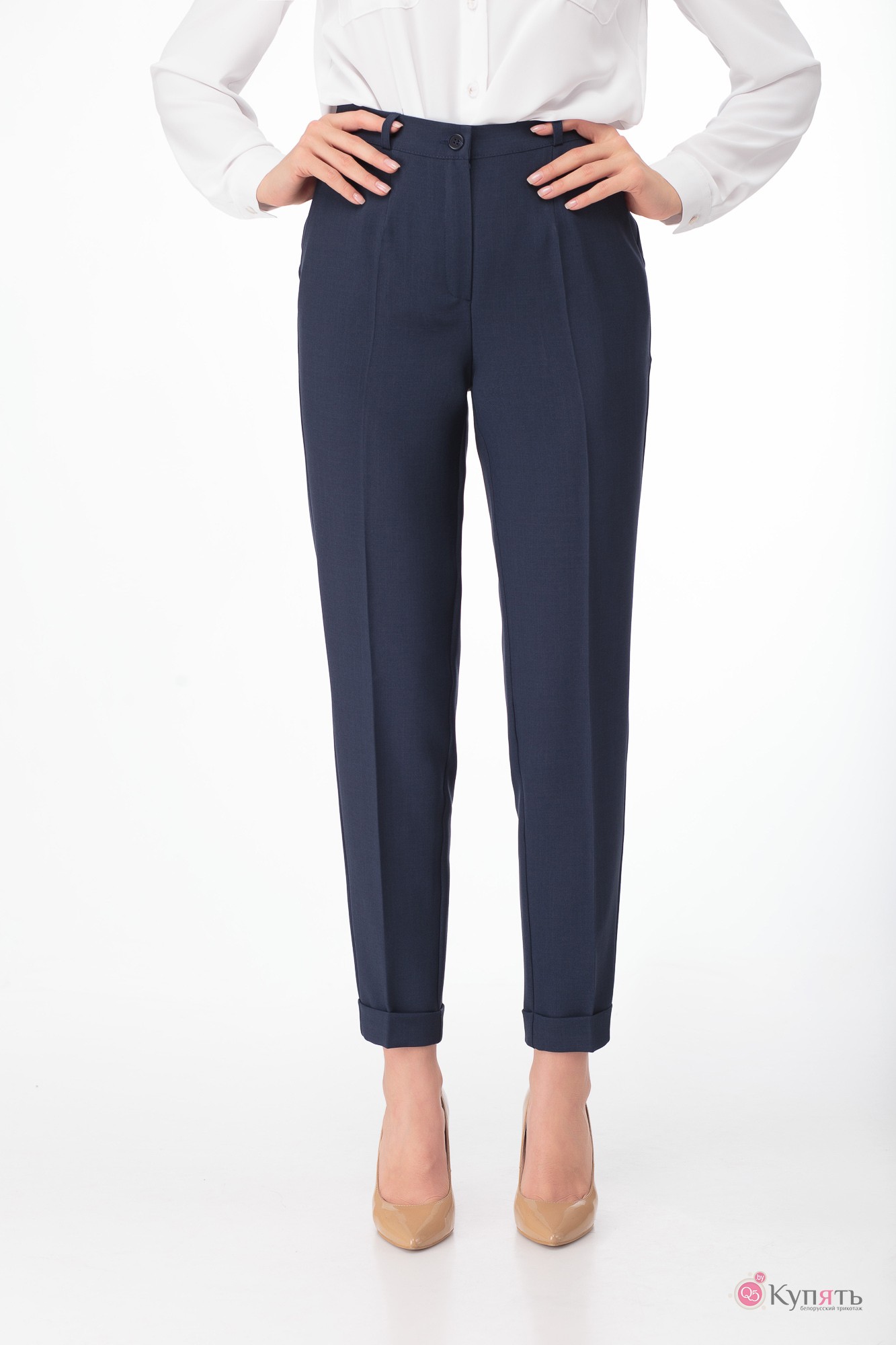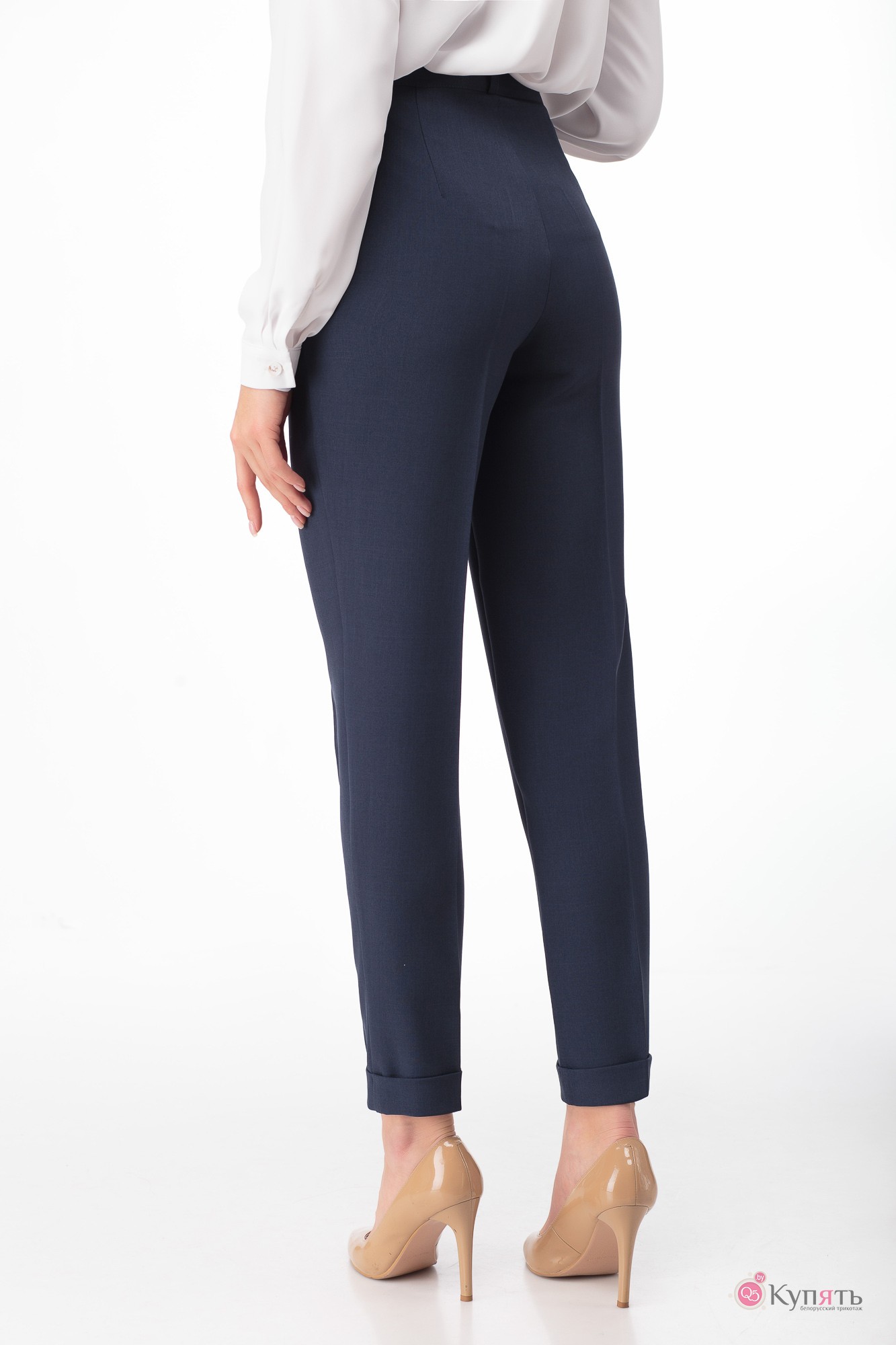 Брюки классического покроя с высокой посадкой, с боковыми карманами, притачным поясом, низ брюк с отворотами.