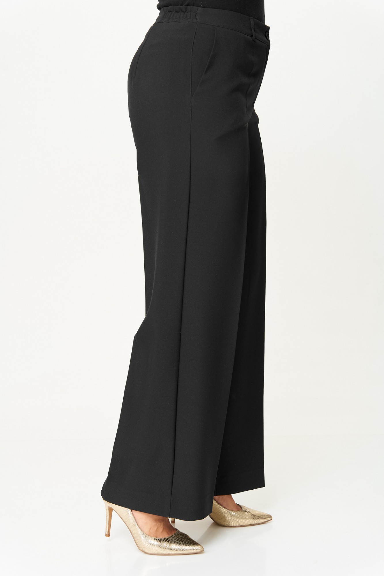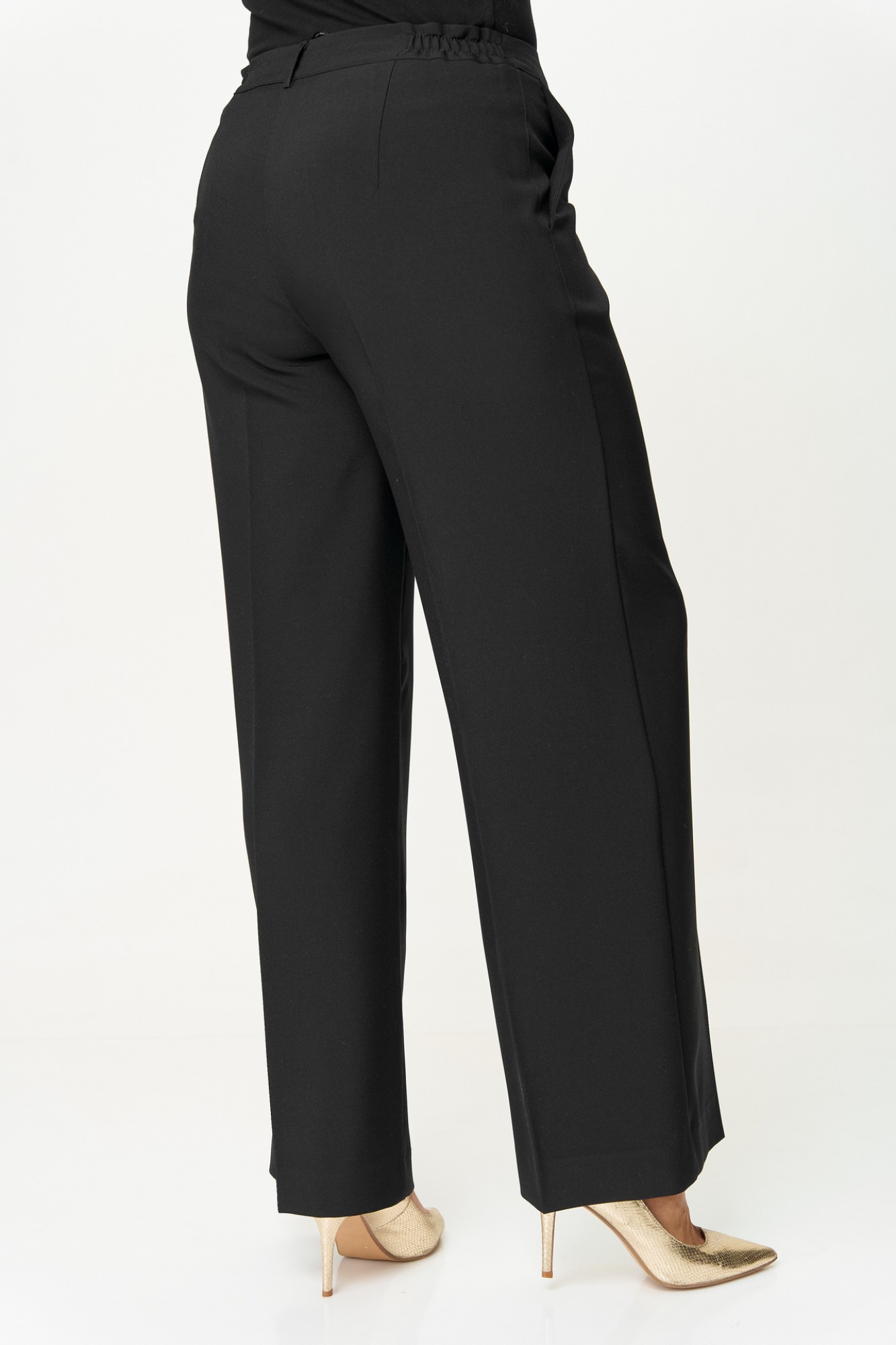 Брюки-палаццо,средней ширины,из текстильной ткани, выполнены с карманами с отрезным бочком в боковом шве. Пояс притачной, застёжка на молнию. По задним половинкам обработаны вытачки.