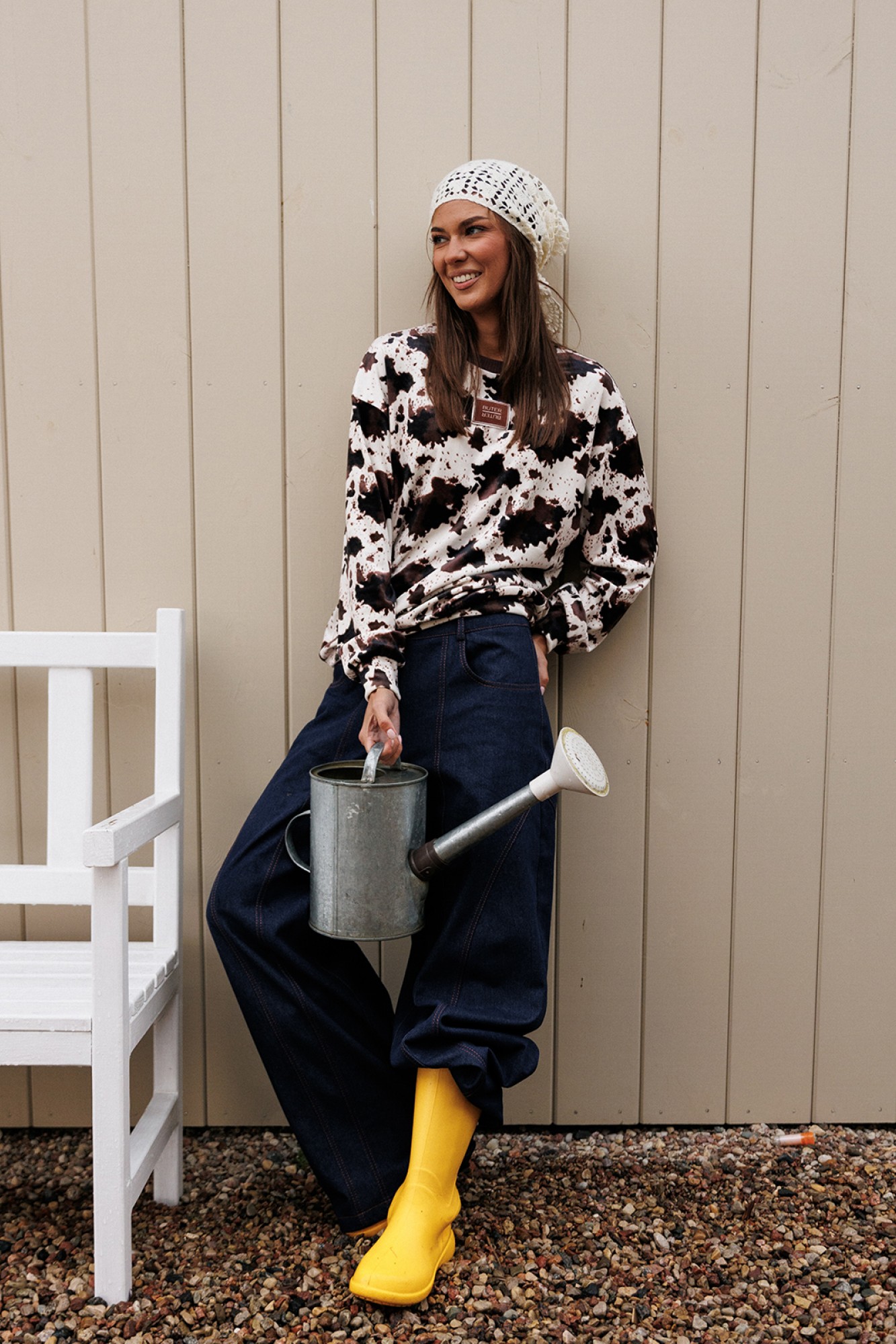Брюки-джинсы немного заужены к низу. На притачном поясе со шлёвками, застежкой-гульфик. Пояс застегивается на петлю-пуговицу. По переду карманы и рельефы. По спинке кокетка, накладные карманы и рельефы.