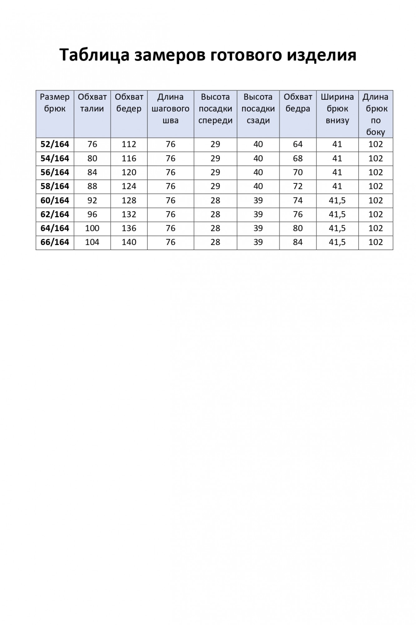 Таблица размеров