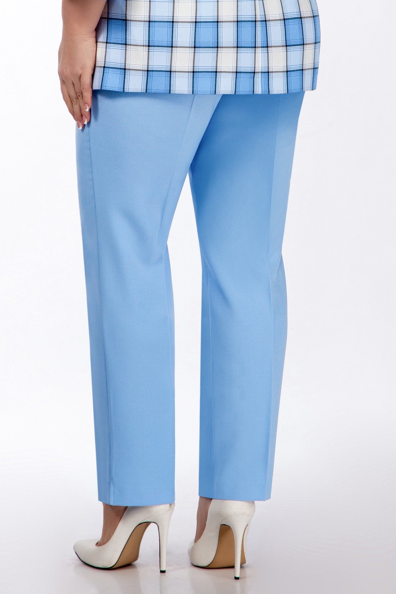 Брюки классические, слегка зауженные к низу. Пояс притачной, частично на резинке. Застежка спереди брюки на тесьму-молнию, петлю-пуговицу.