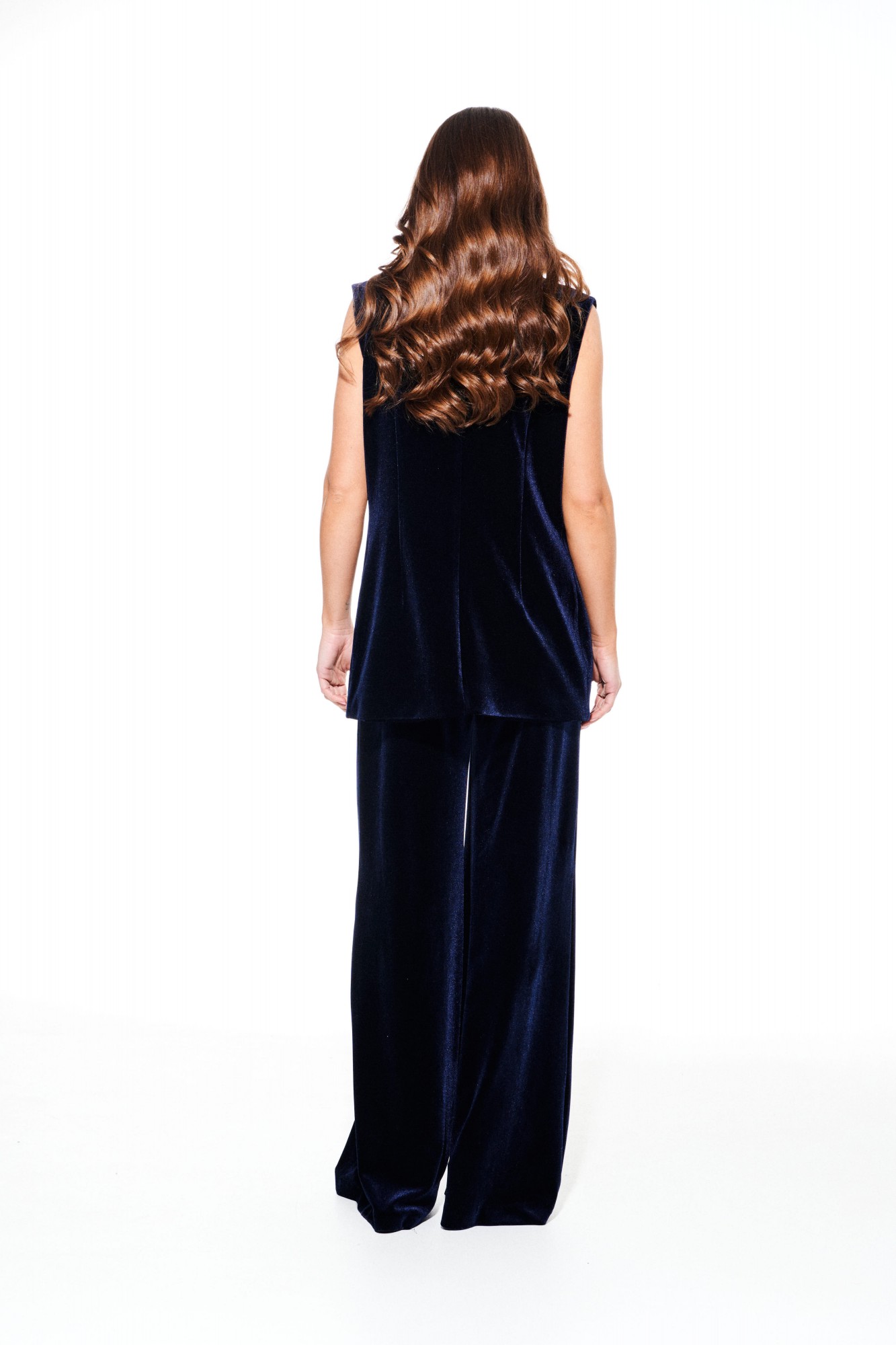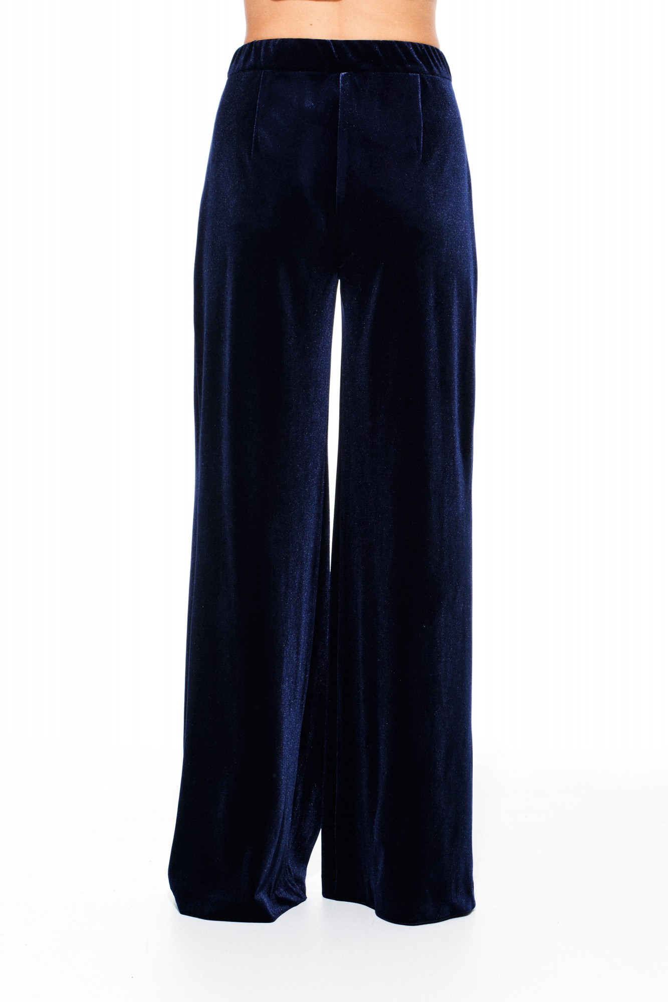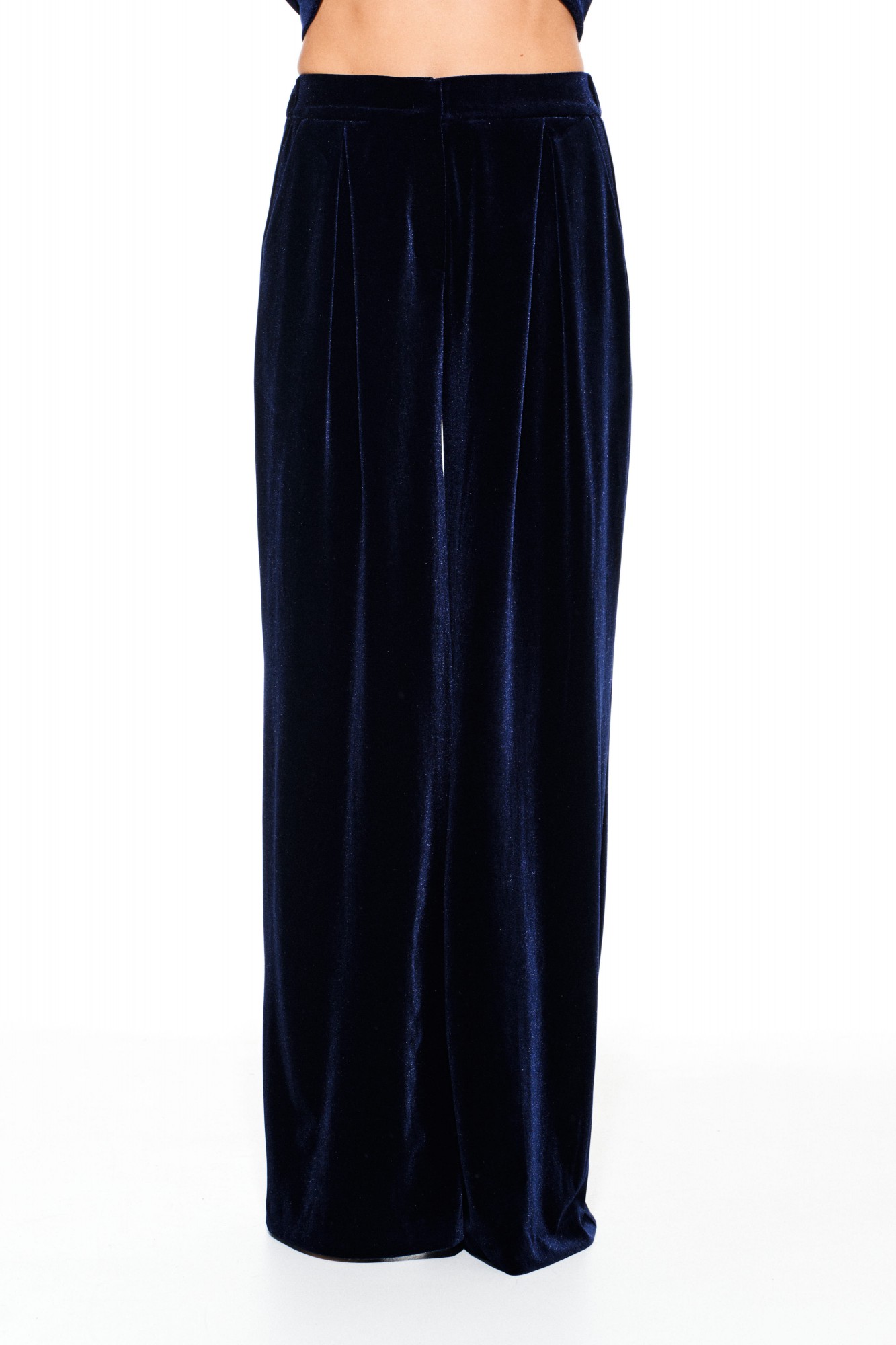 Брюки из бархата на трикотажной основе, свободного объема, расширенные к низу. На передних половинках выполнены боковые карманы с отрезным бочком и встречные складки. На задних половинках таллиевые вытачки. Застежка – гульфик на молнии. Пояс притачной, с резинкой по спинке, застежкой на крючок и потайную пуговицу.