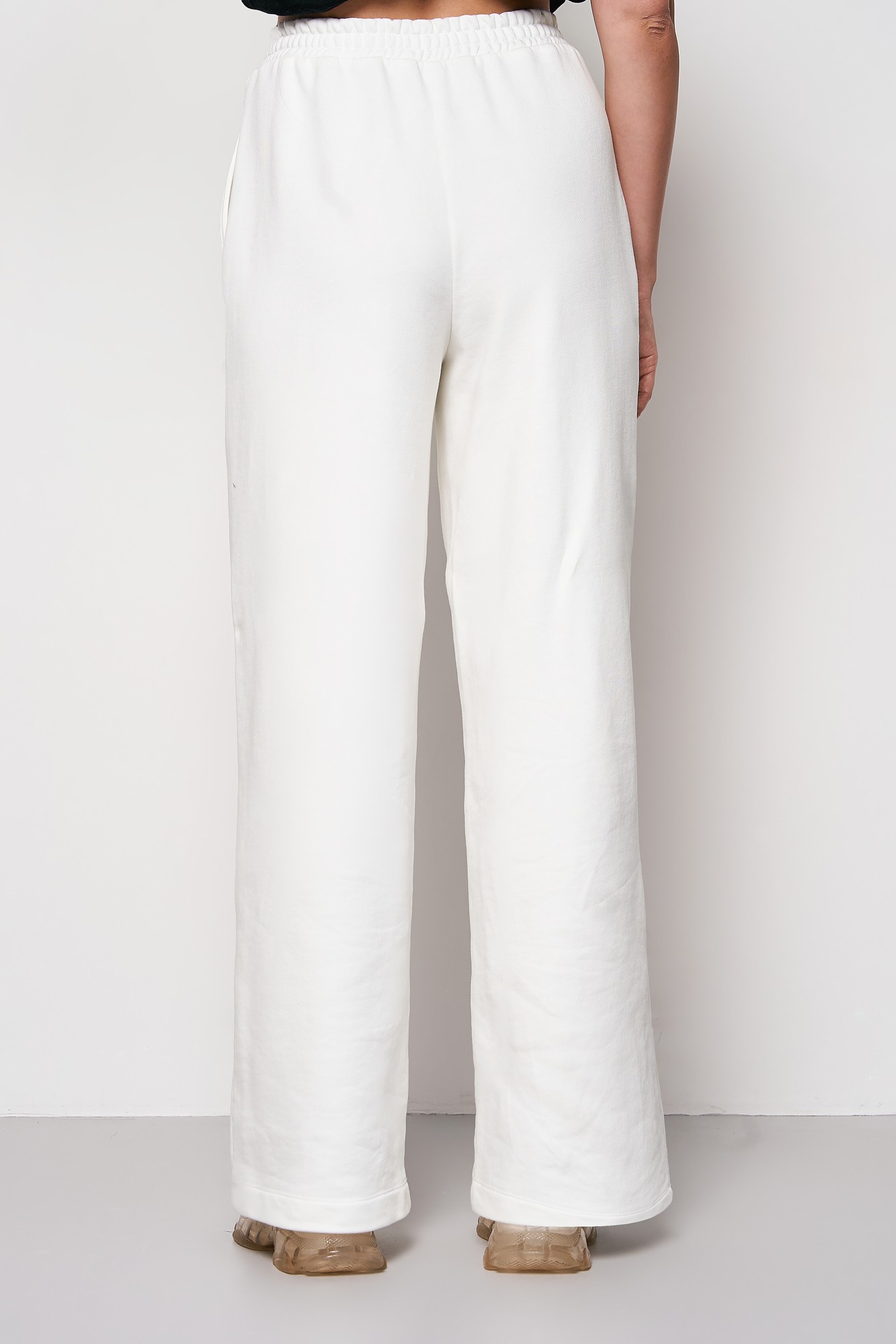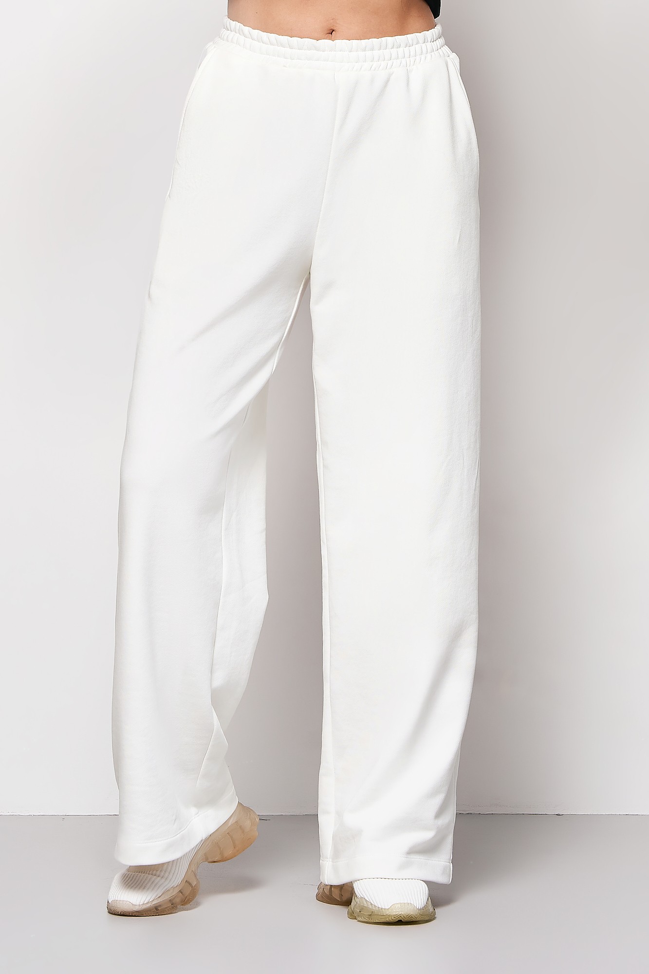 Женские брюки (спортивные штаны) свободного силуэта с функциональными карманами в боковых швах расширяются к низу, пояс брюк полностью на резинке. Брюки выполнены из высококачественного футера 3-х нитки класса пенье. Лицевая сторона ткани гладная, изнанка - петлеобразная