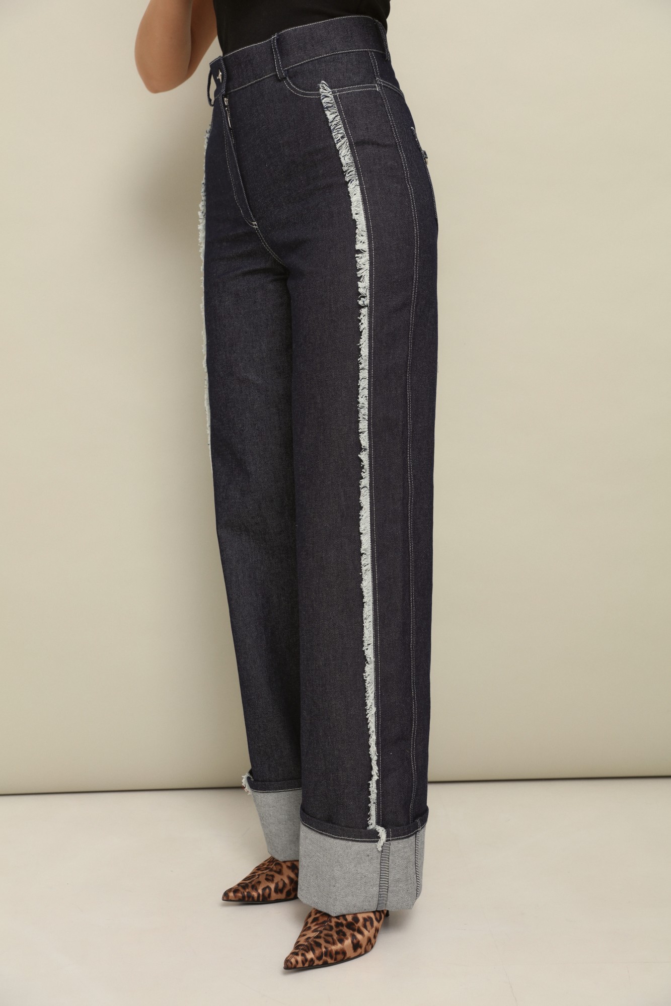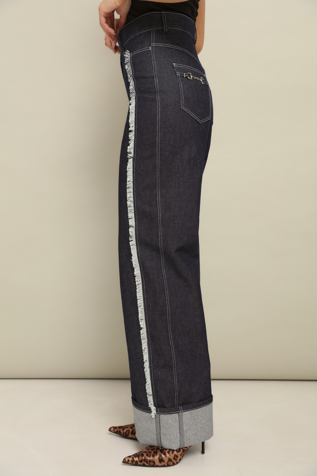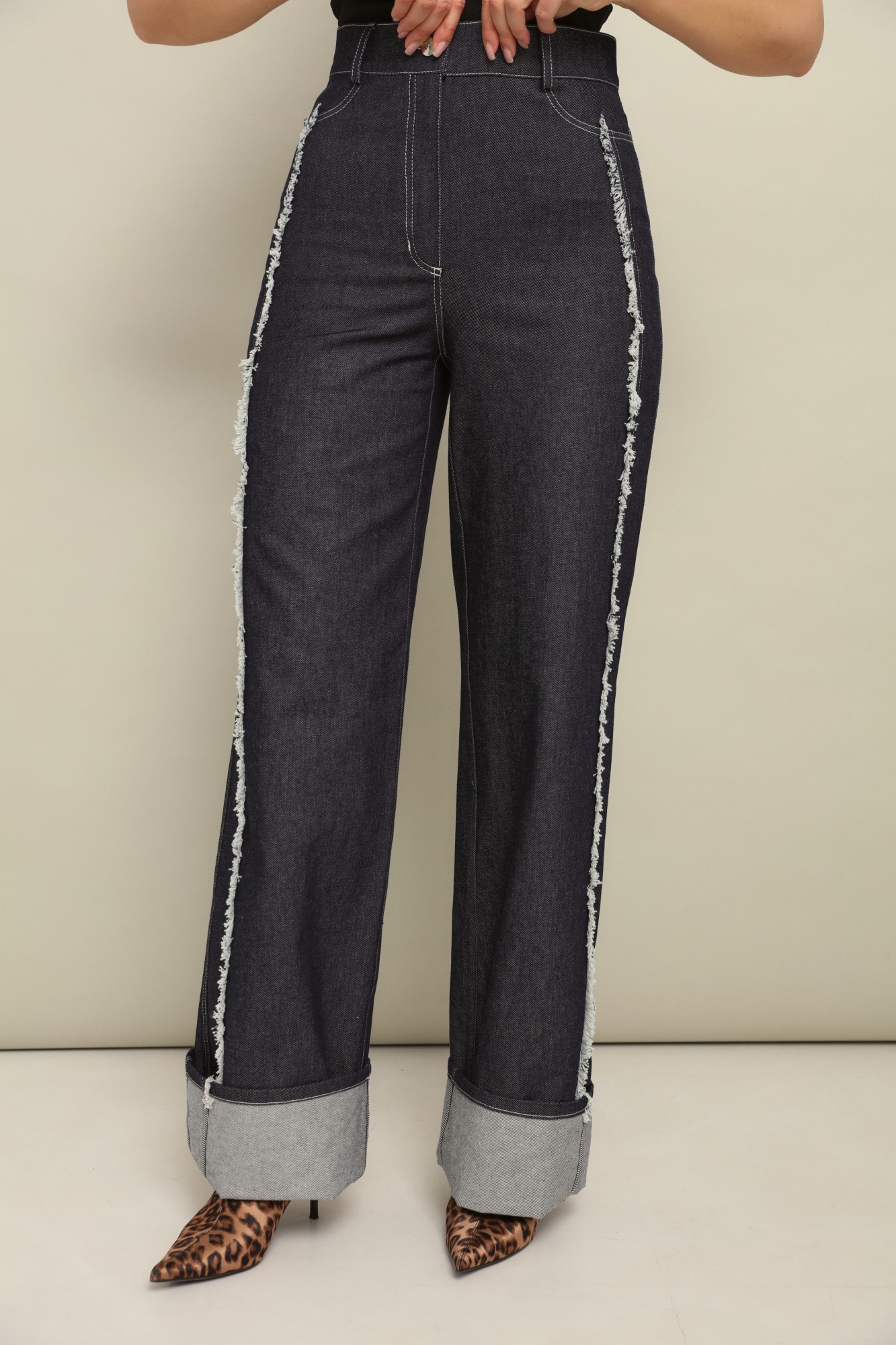 Комфортные плотные брюки из джинсы свободного объёма от бедра с подворотами по низу, которые позволяют регулировать длину брюк.