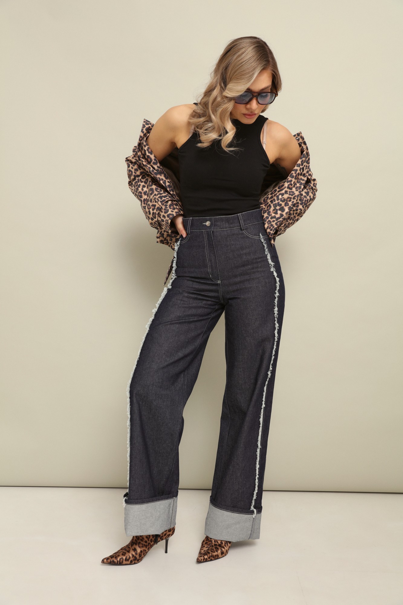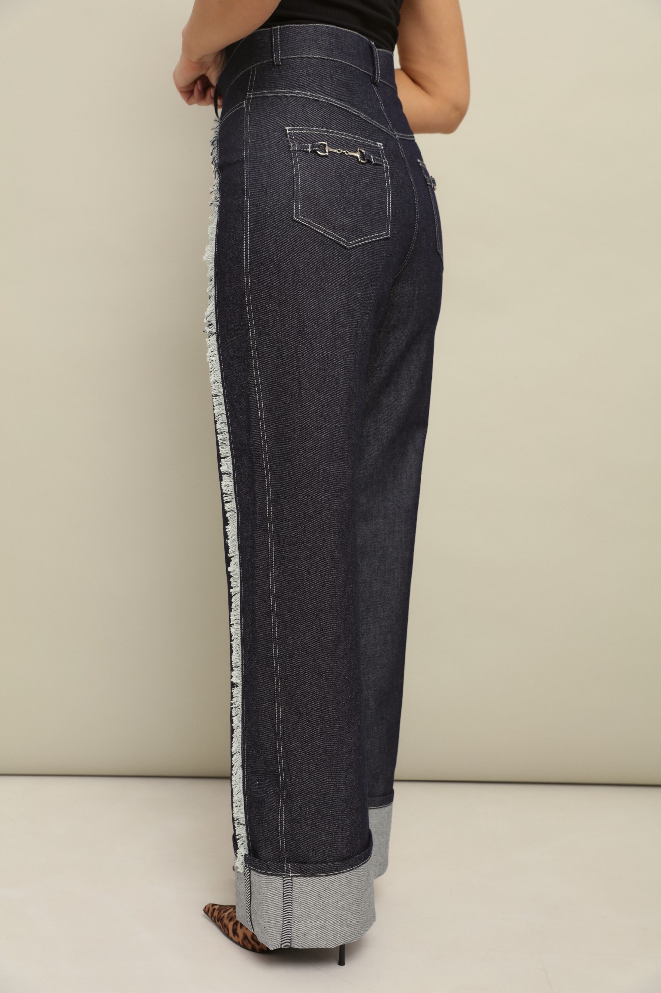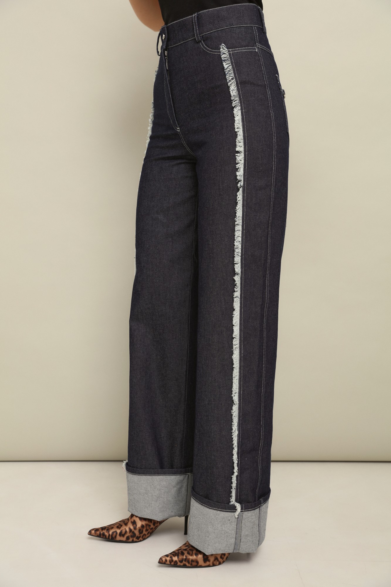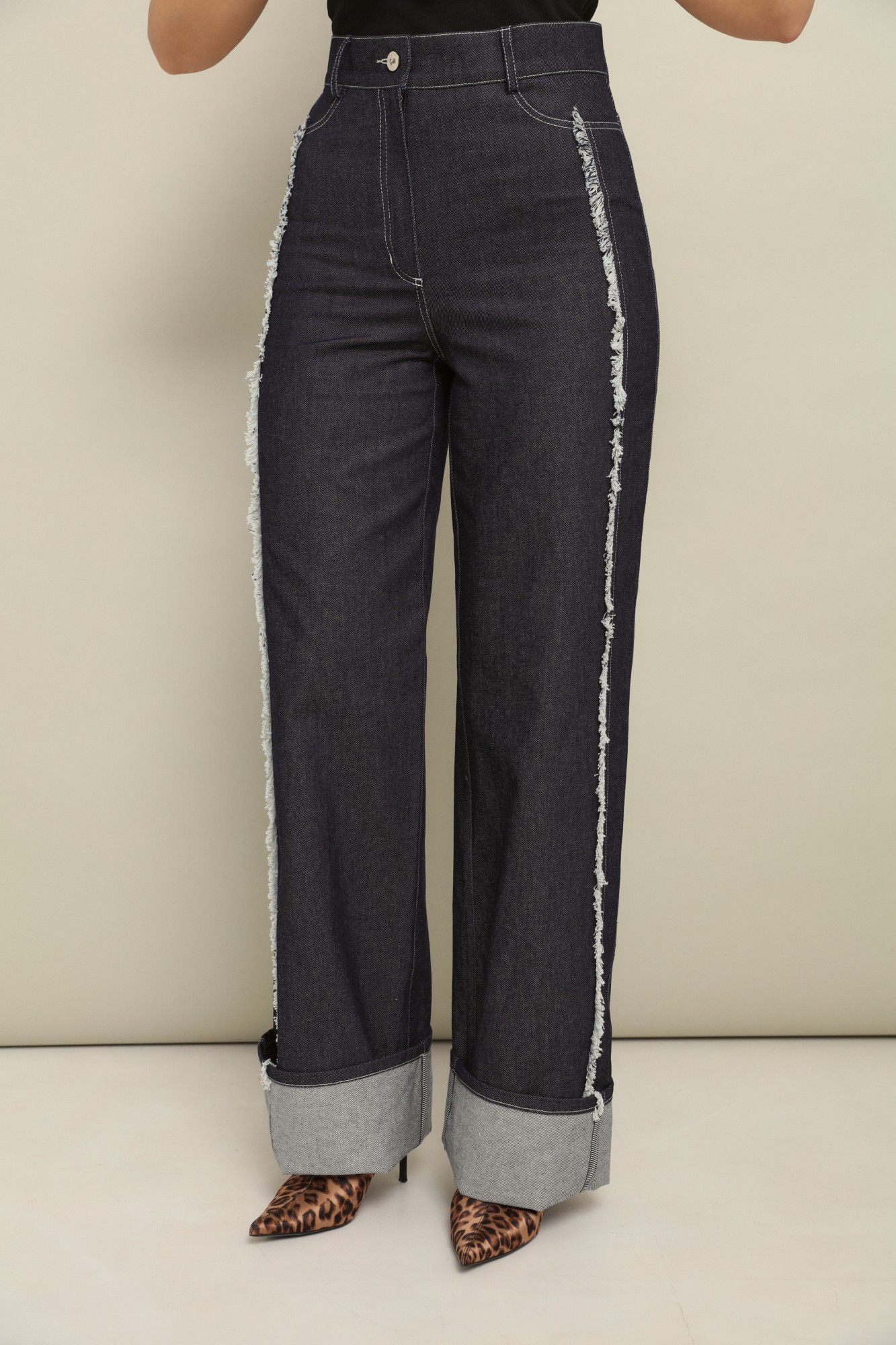 Комфортные плотные брюки из джинсы свободного объёма от бедра с подворотами по низу, которые позволяют регулировать длину брюк.