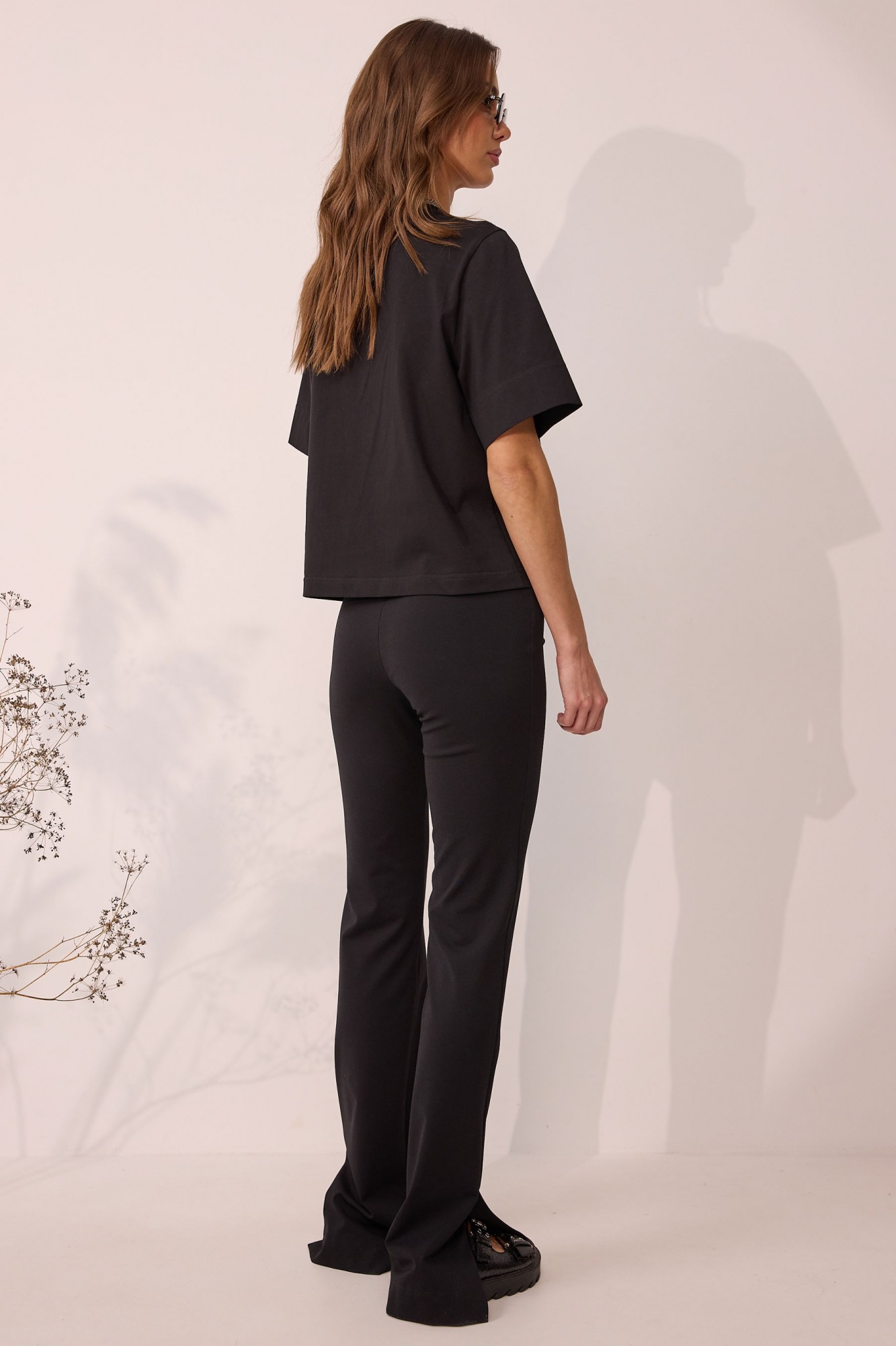 Брюки прилегающего силуэта расширенные книзу из трикотажного полотна. По верху брюк притачной пояс на эластичной тесьме(резинке). По низу брюк в боковом шве шлица.