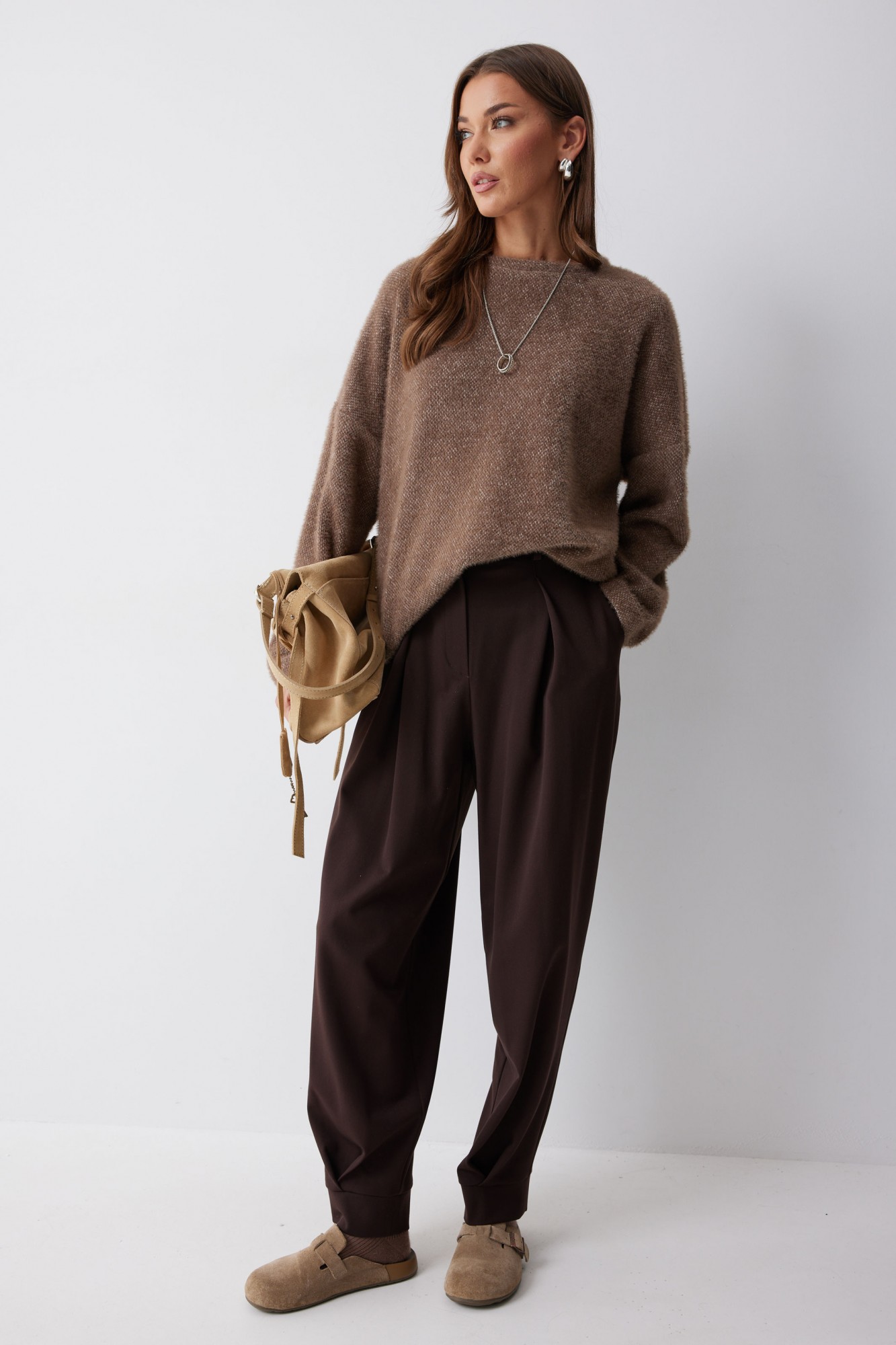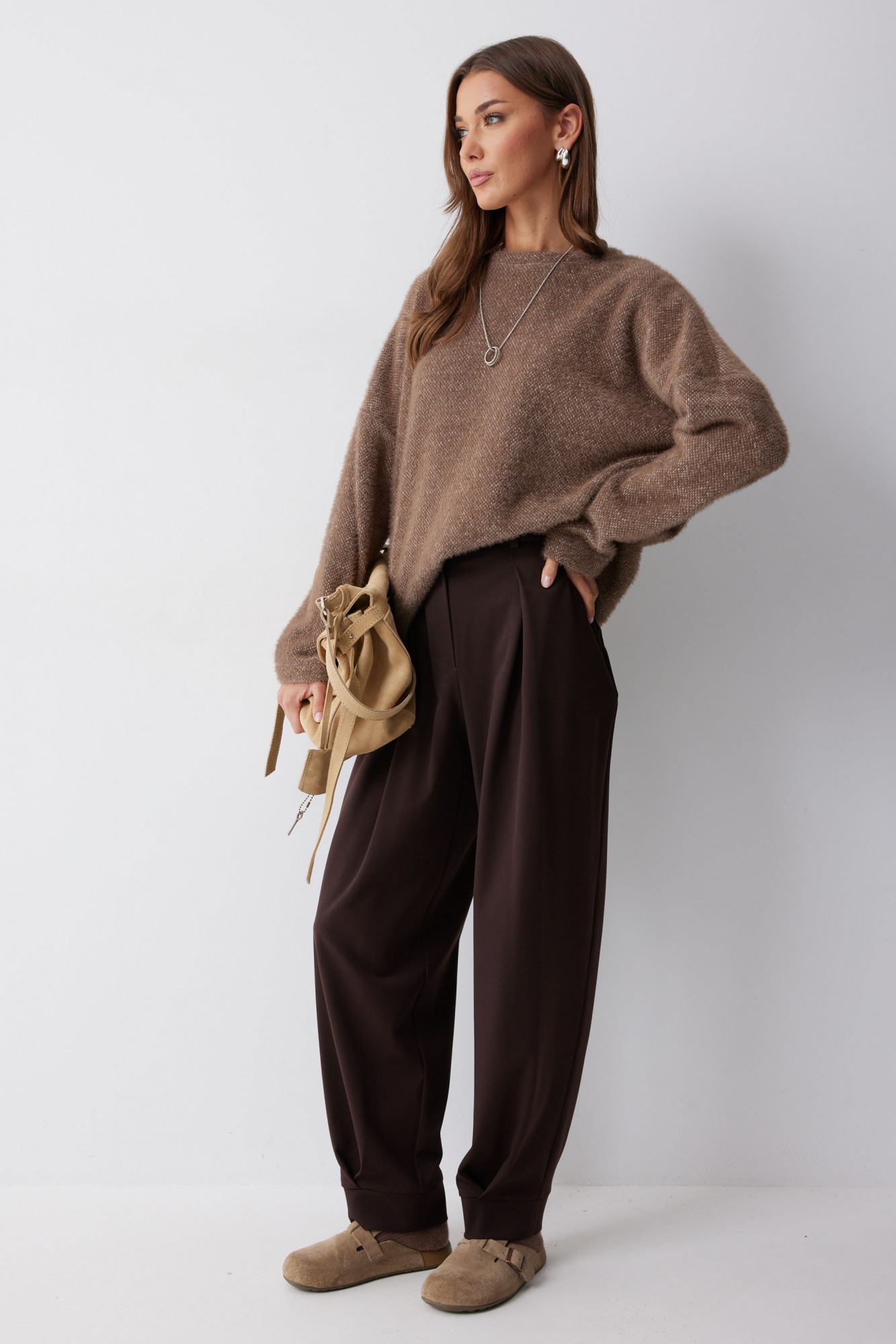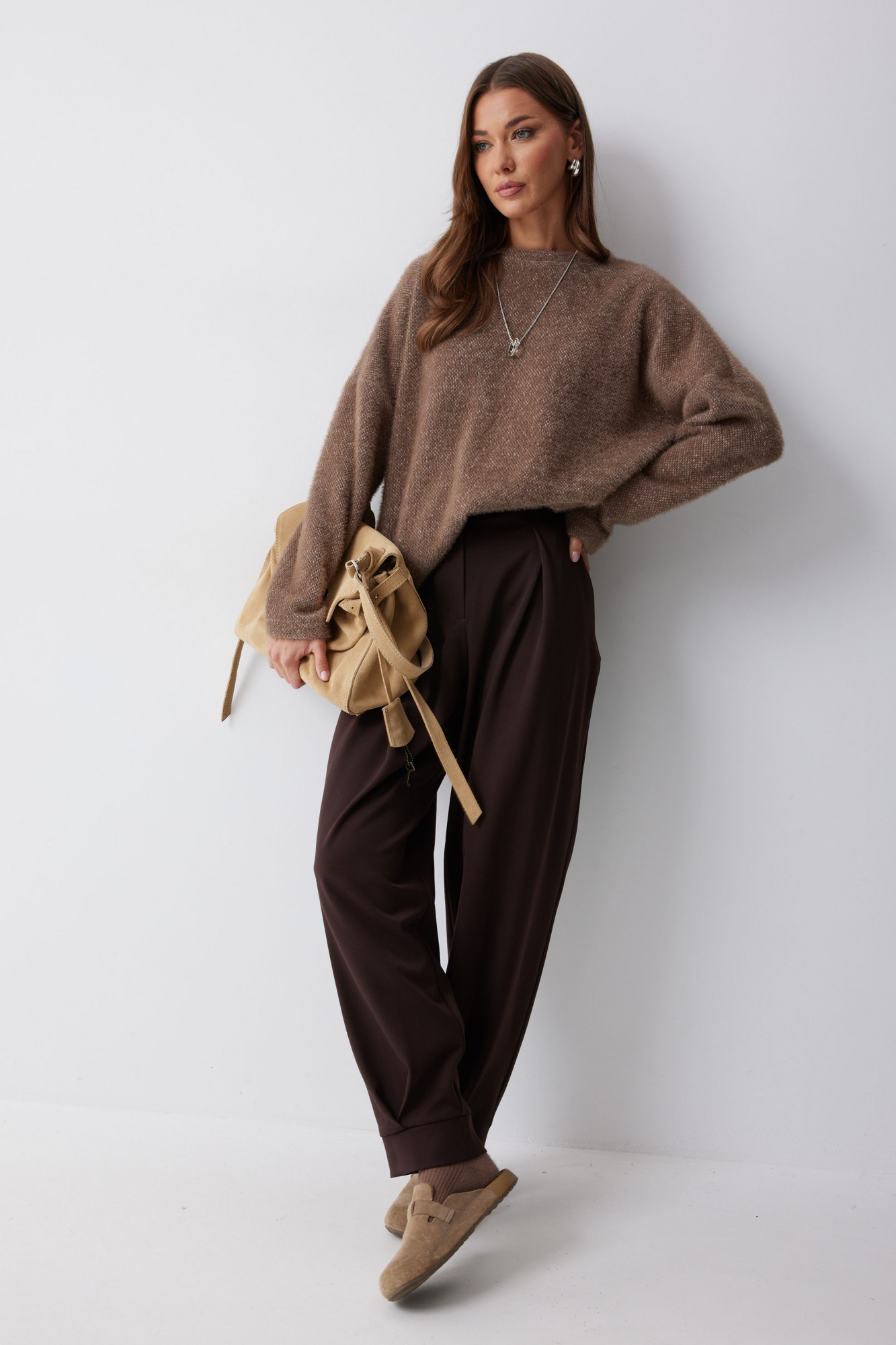 Брюки из костюмной ткани, зауженные книзу. По верху брюк притачной пояс с застежкой на петлю и пуговицу и шлевками для ремня. По поясу задних половинок брюк резинка. На передних половинках обработаны боковые карманы и застежка молния в среднем шве. По верху и низу брюк расположены встречные складки. По низу брюк – манжеты. На задних половинках накладные карманы.
